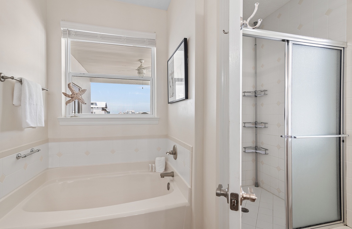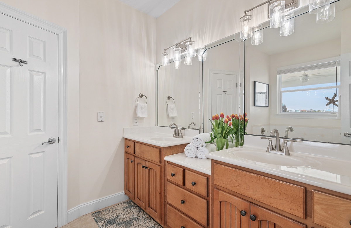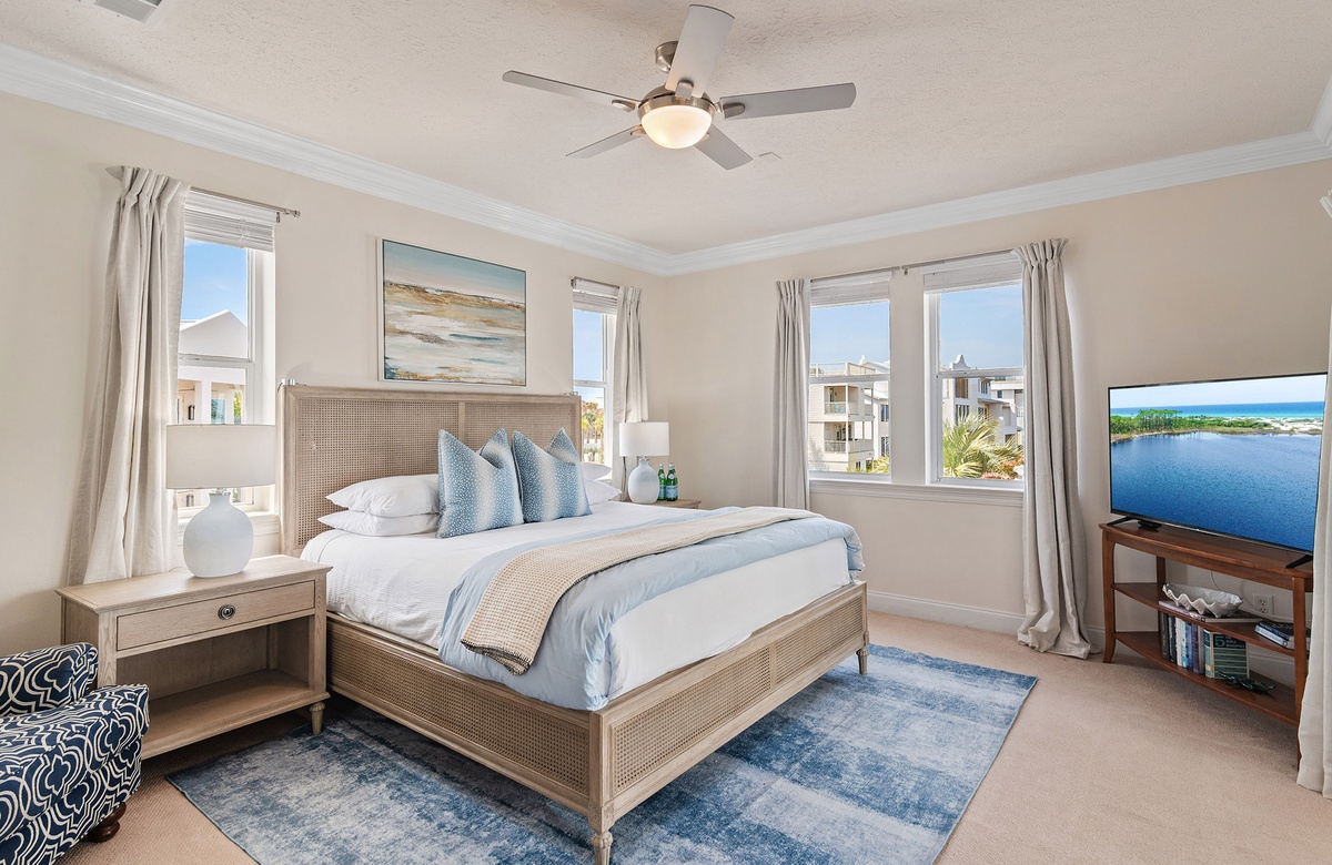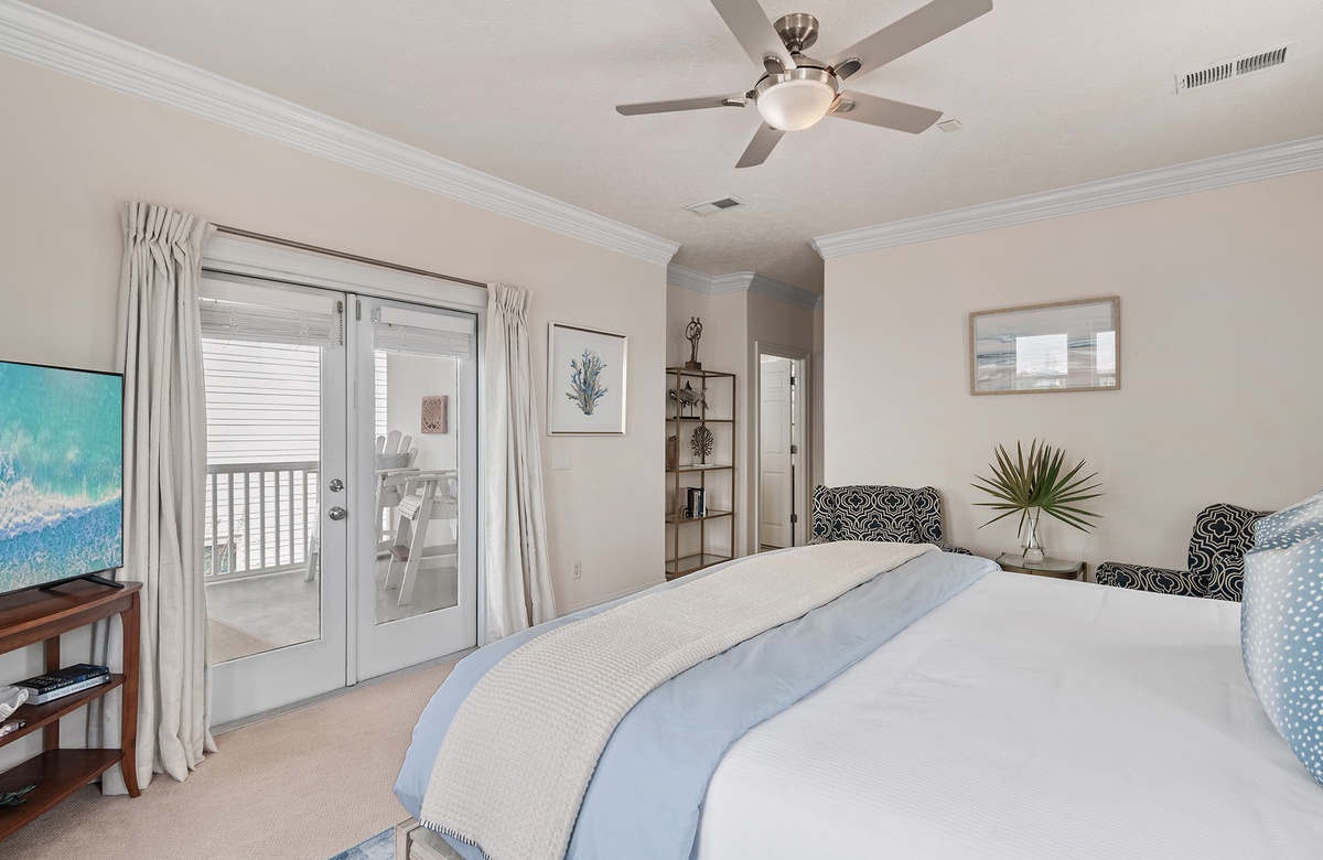 - King master bedroom with TV, lovely views, private bath with double vanities, garden tub and private deck