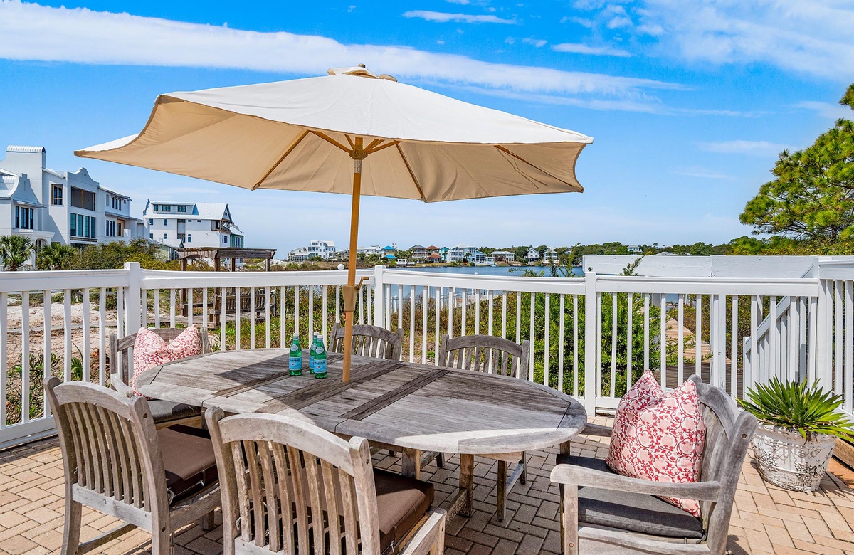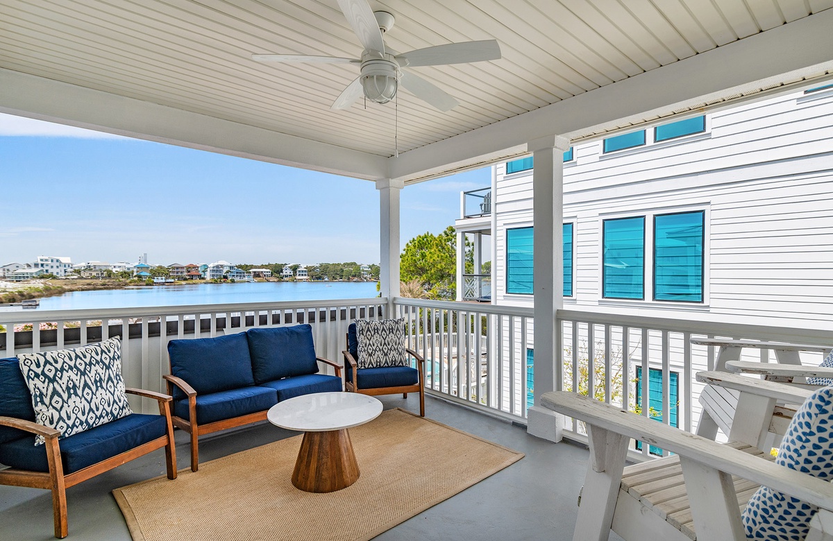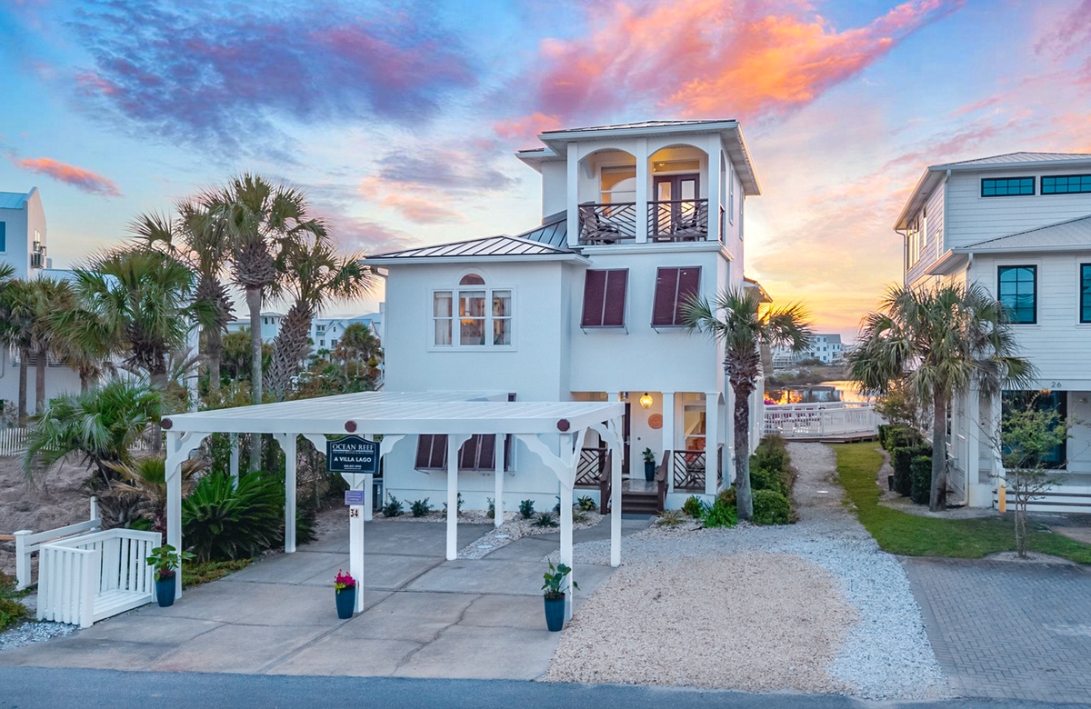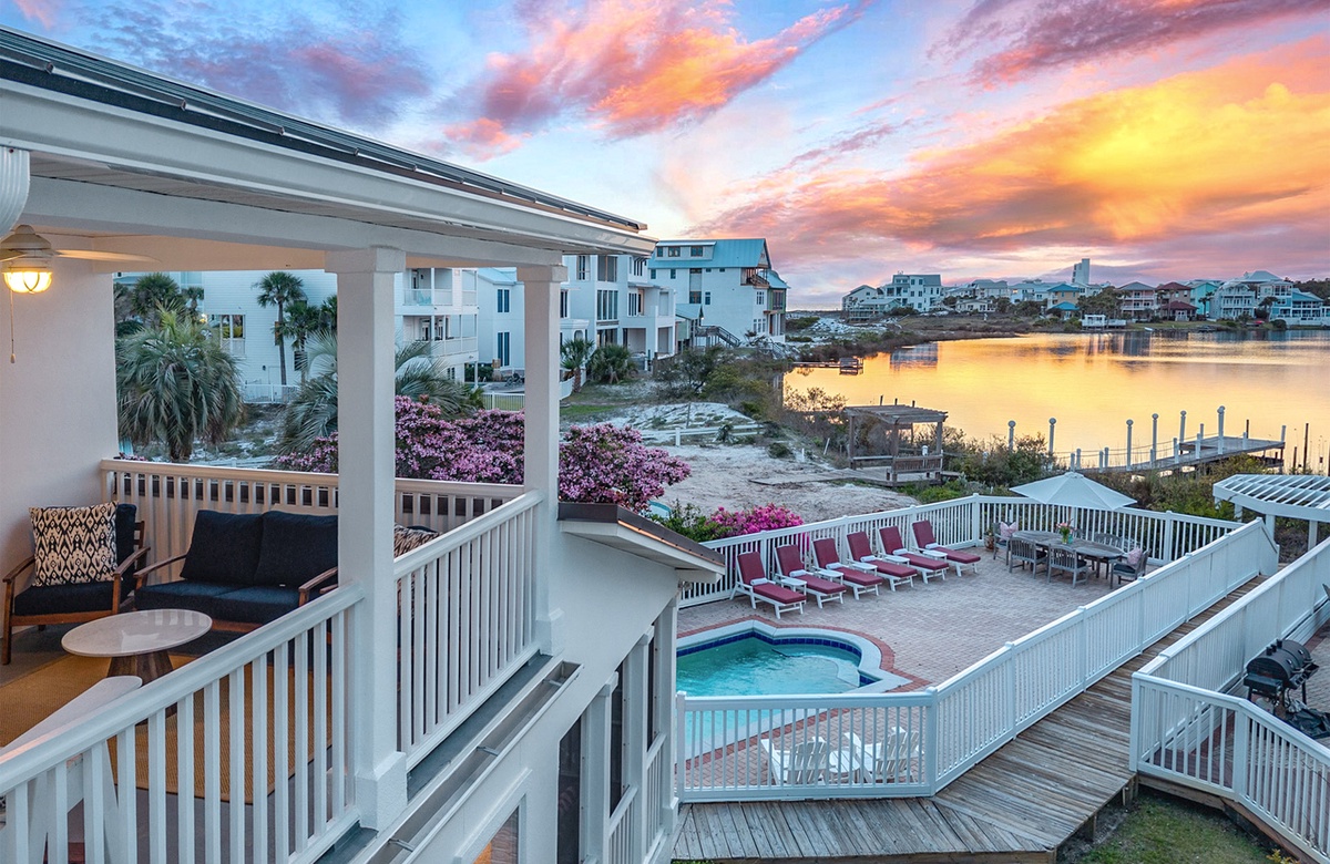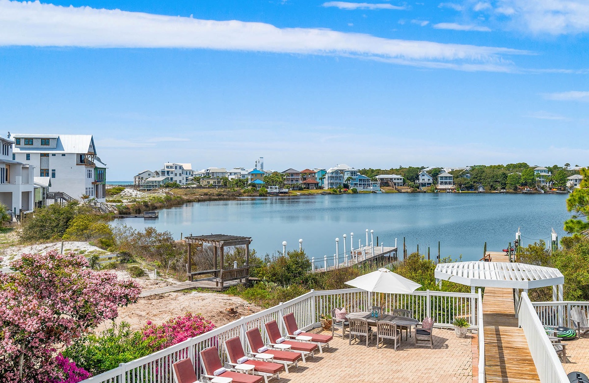 ‘A Villa Lago’ is perfectly located directly on Eastern Lake with a semi-private dock and only a short walk to the sugar white sands of the beach. This vacation dream home features a double living room, gourmet kitchen, sunny dining area, AND beautiful lake and gulf views. A Villa Lago has 5 bedrooms and 4 bathrooms and comfortably sleeps 12. The bonus tower room is perfect for the kids with a TV, mini fridge and private deck!
