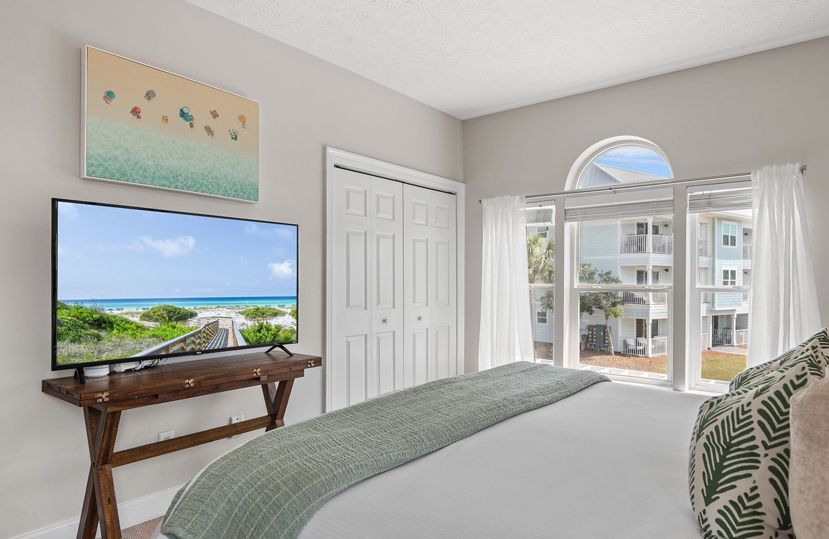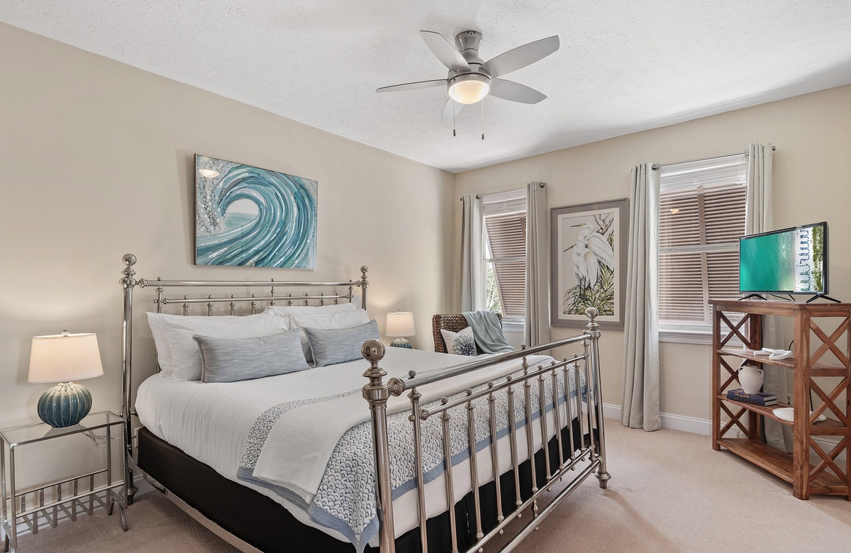 - King bedroom, TV, and full hall bathroom