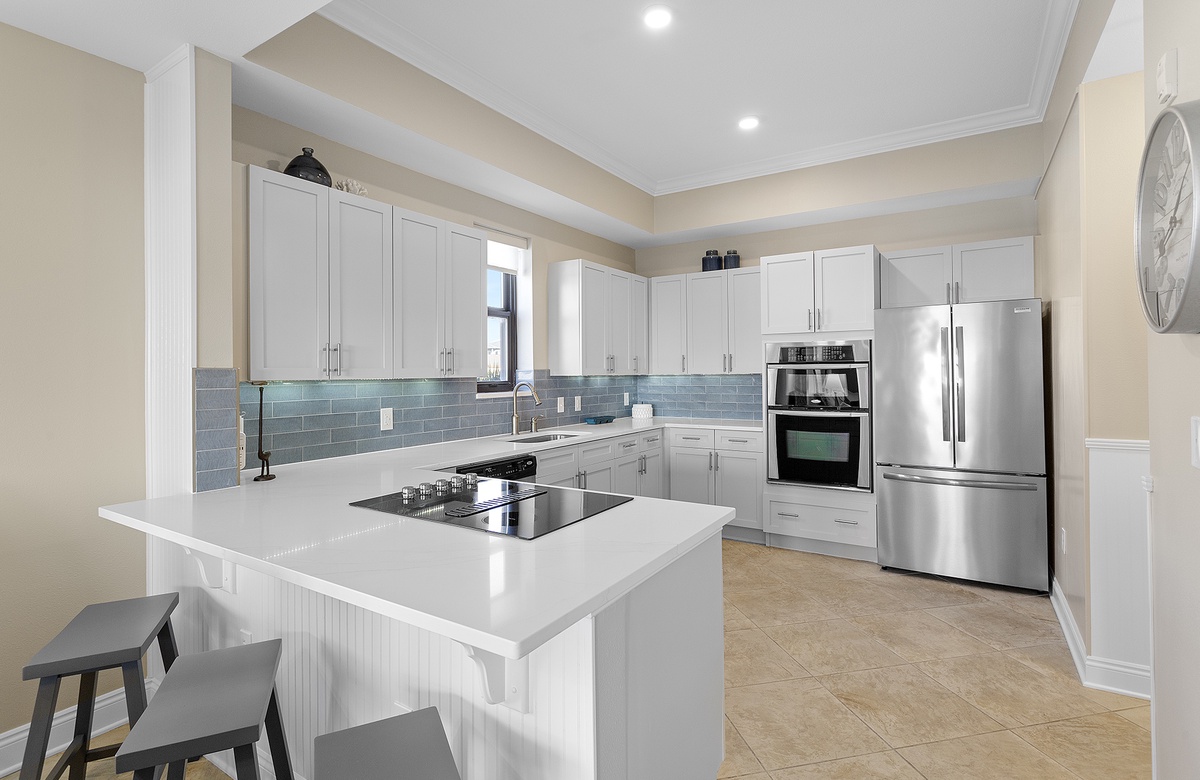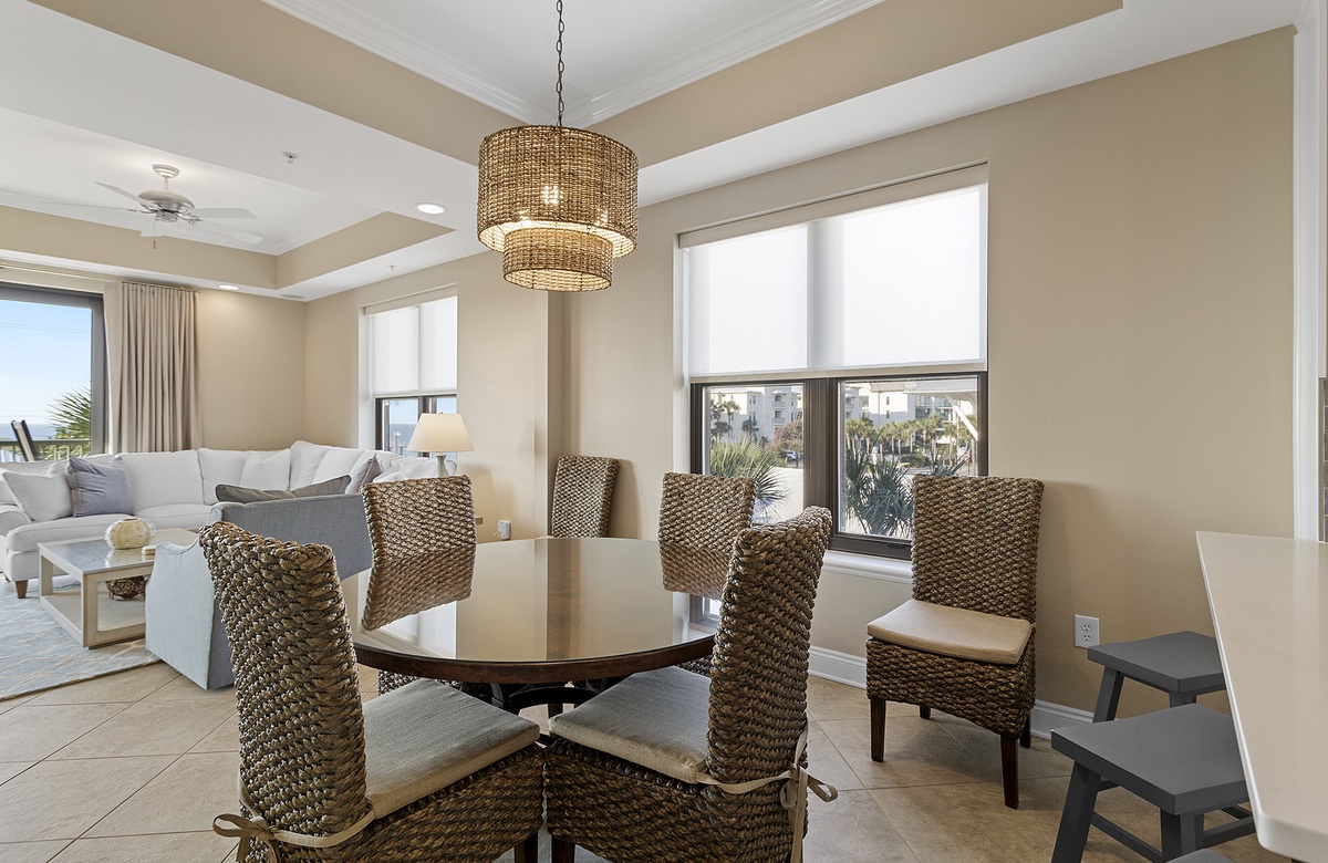 The two-level condo boasts a spacious, open great room on the second floor. It has large windows, comfortable furniture, and parchment-toned flooring. A set of sliding glass doors lead to the breezy balcony, which is furnished with an outdoor table and chairs. The living room seating area is made up of a plush white sectional and an overstuffed armchair facing a flatscreen TV mounted above a coastal-inspired credenza. In the dining area, a circle table and four chairs sit below a modern chandelier. The open kitchen overlooks the living and dining areas. It includes stainless-steel appliances, ample cabinetry, sleek quartz countertops, and a breakfast bar with stool seating.