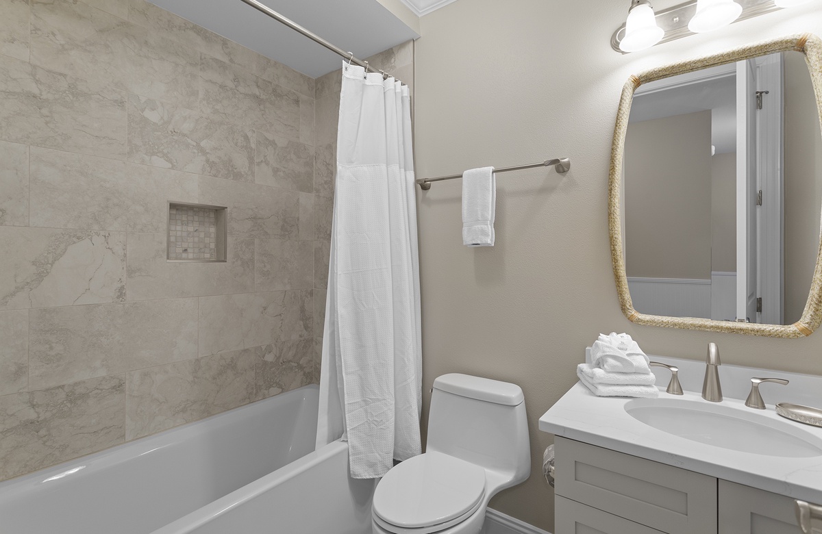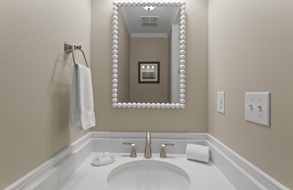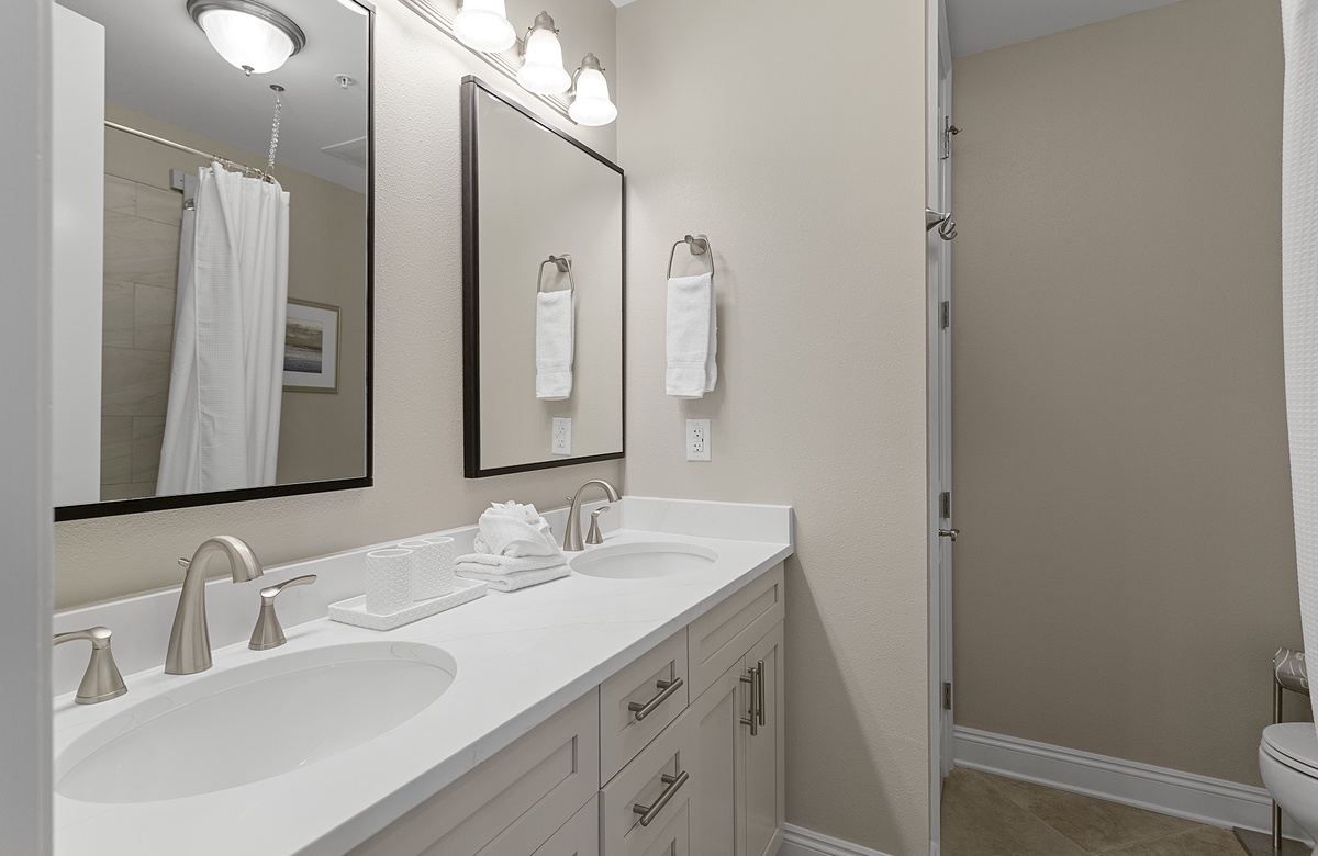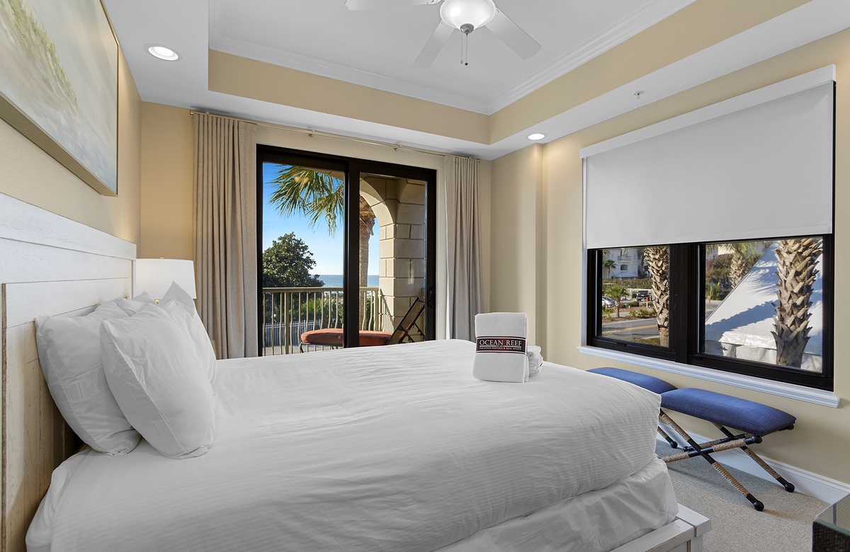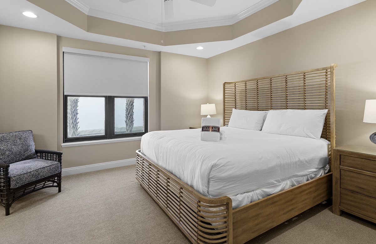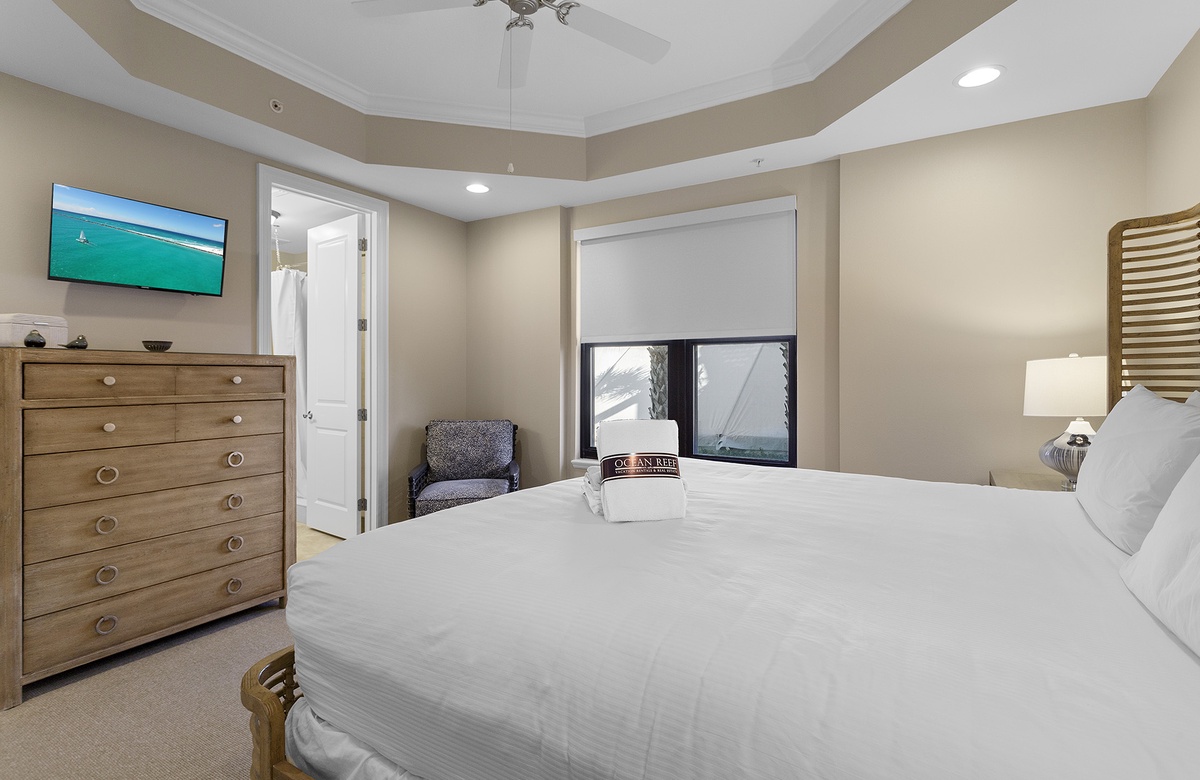 Three bedrooms are located on the first level. One of these is the primary suite, which features a king-size bed, hardwood dresser, reading corner, and a tray ceiling. The primary bedroom’s private, en-suite bath has dual vanities and a walk-in shower. Each of the two guest bedrooms includes a queen-size bed and access to a balcony with beach views. All three bedrooms include wall-mounted TVs for evening viewing pleasure.