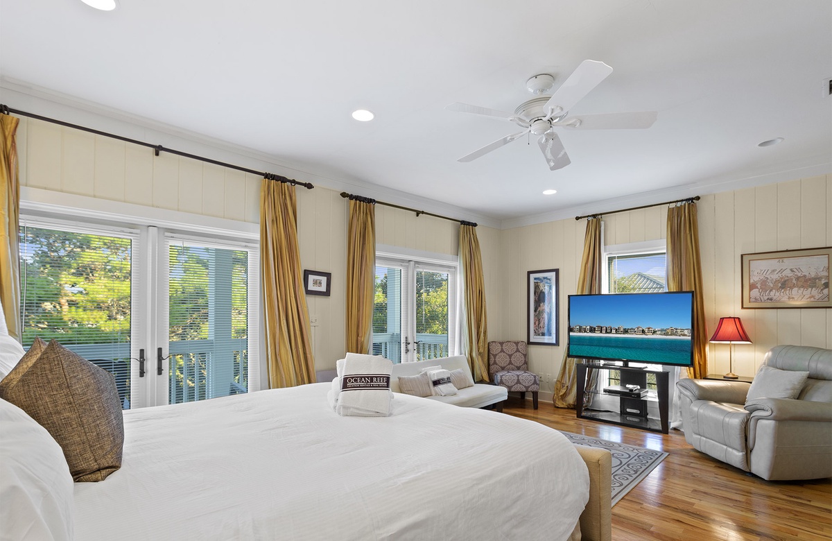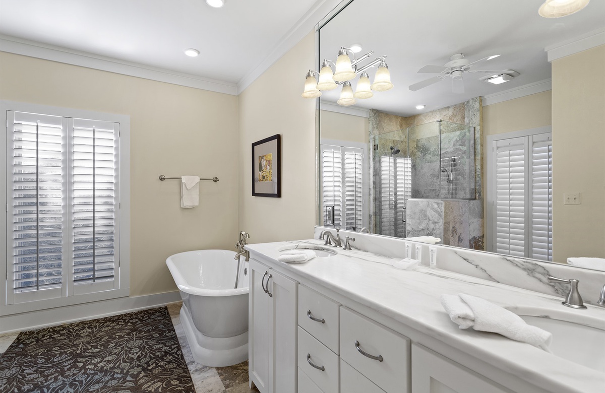 - Master king bedroom with TV, private bathroom, two vanities, tub/separate shower