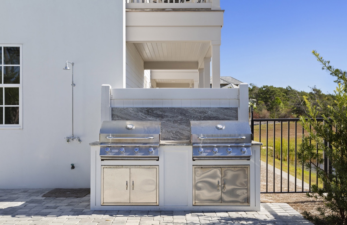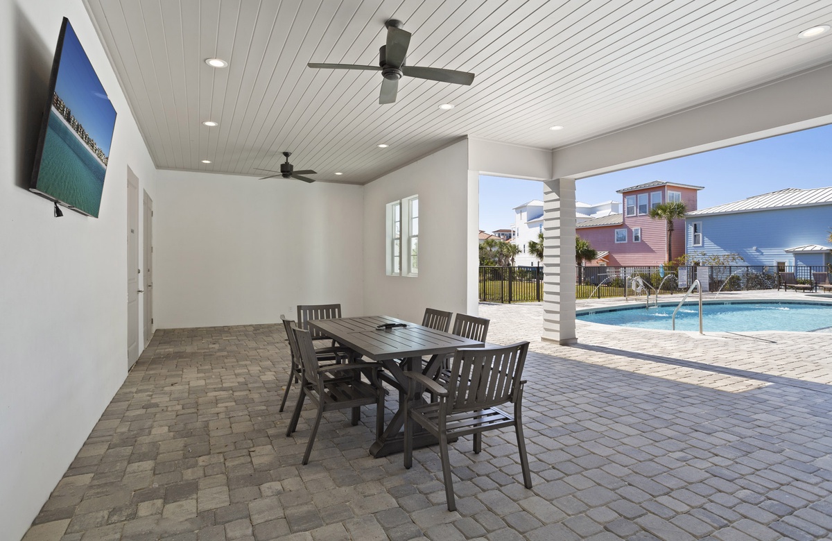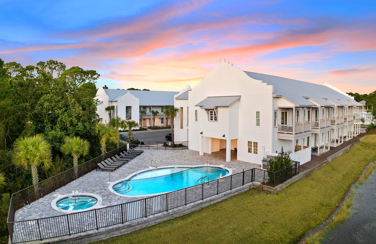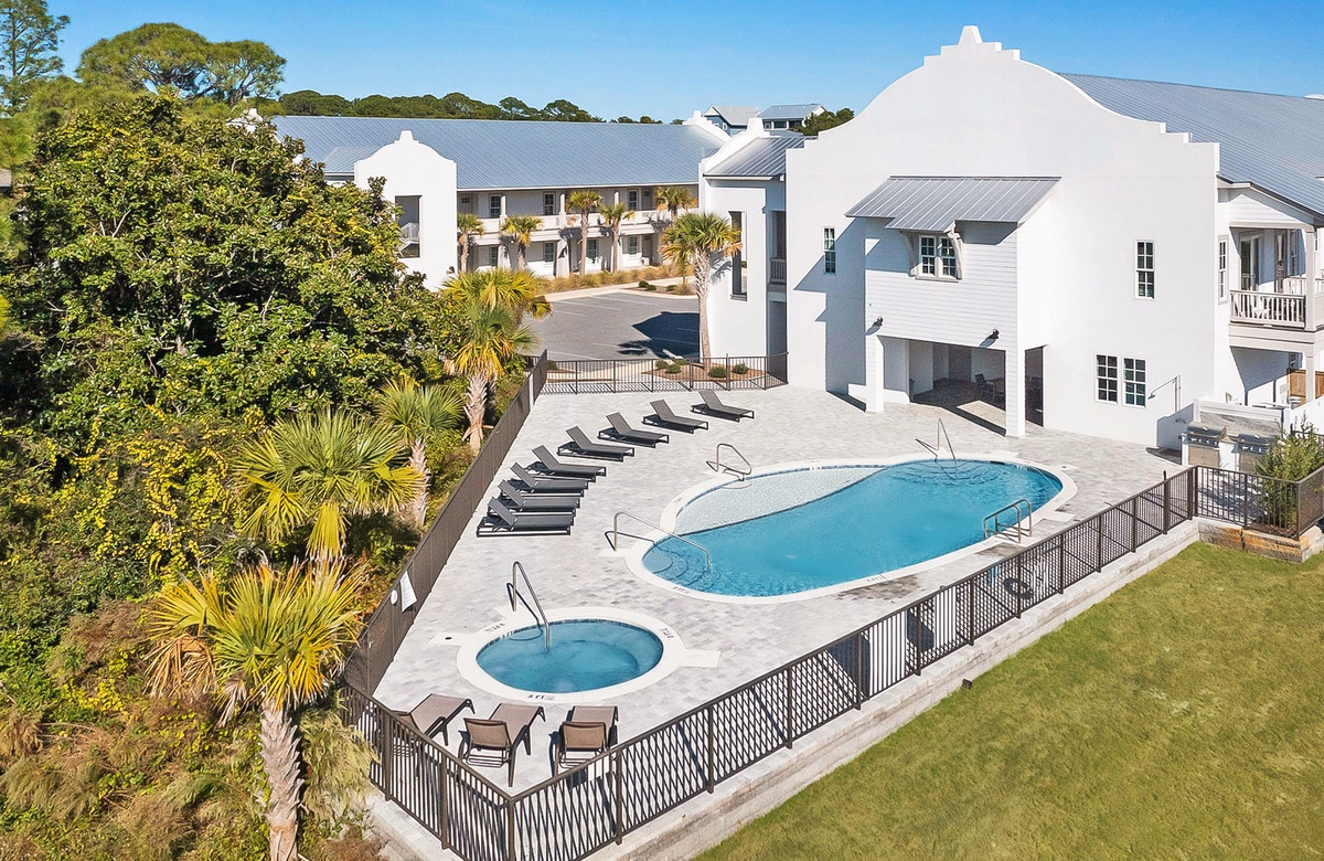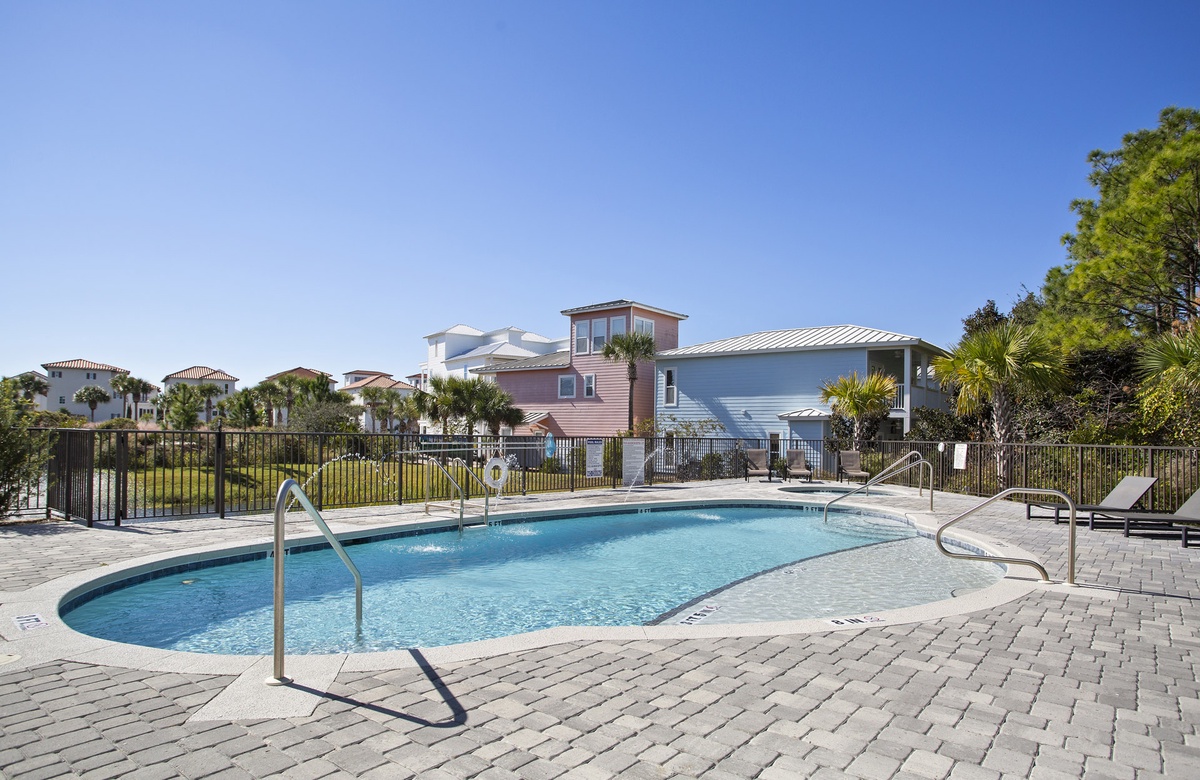 A stay at the Azure 30A complex comes with lovely vacation amenities, including a sun-soaked pool. The pool has a shallow entry that is great for little ones, stairs on both ends, and three water features. Next to the pool is a bubbling hot tub. Lounge chairs adorn the deck, perfect for sunbathing or reading a book. Guests will also like the BBQ grill and shaded picnic area, which may be used for poolside meals.
