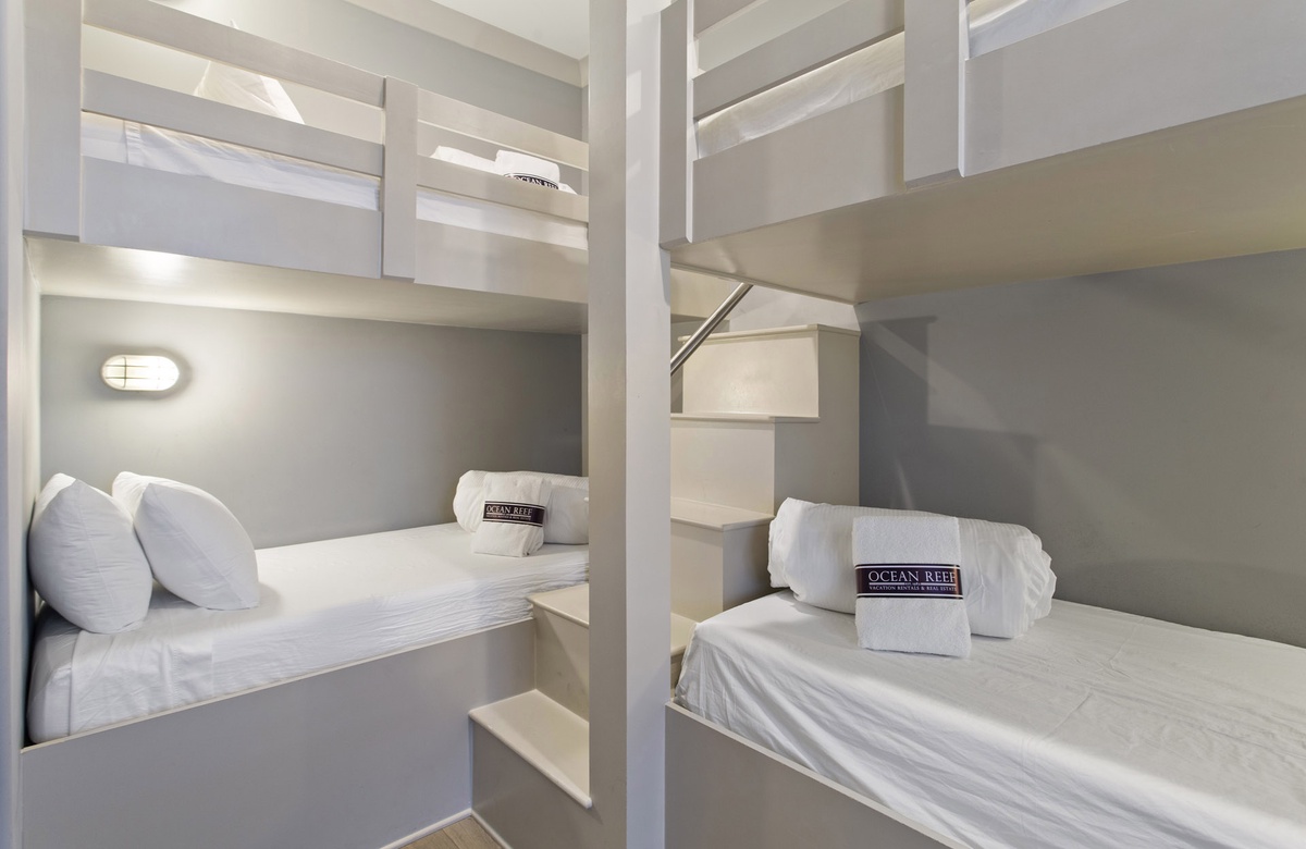 Each of the condo’s bedrooms is well-furnished and comfortable. The primary suite has a king-size bed, flatscreen TV, patio access, and an ensuite bath with a glass-walled walk-in shower. One guest bedroom has a king-size bed, in addition to a TV and sunny window. The last bedroom is a bunk room with two twin bunks. The guest bedrooms share a full hall bath with a tub/shower combination.