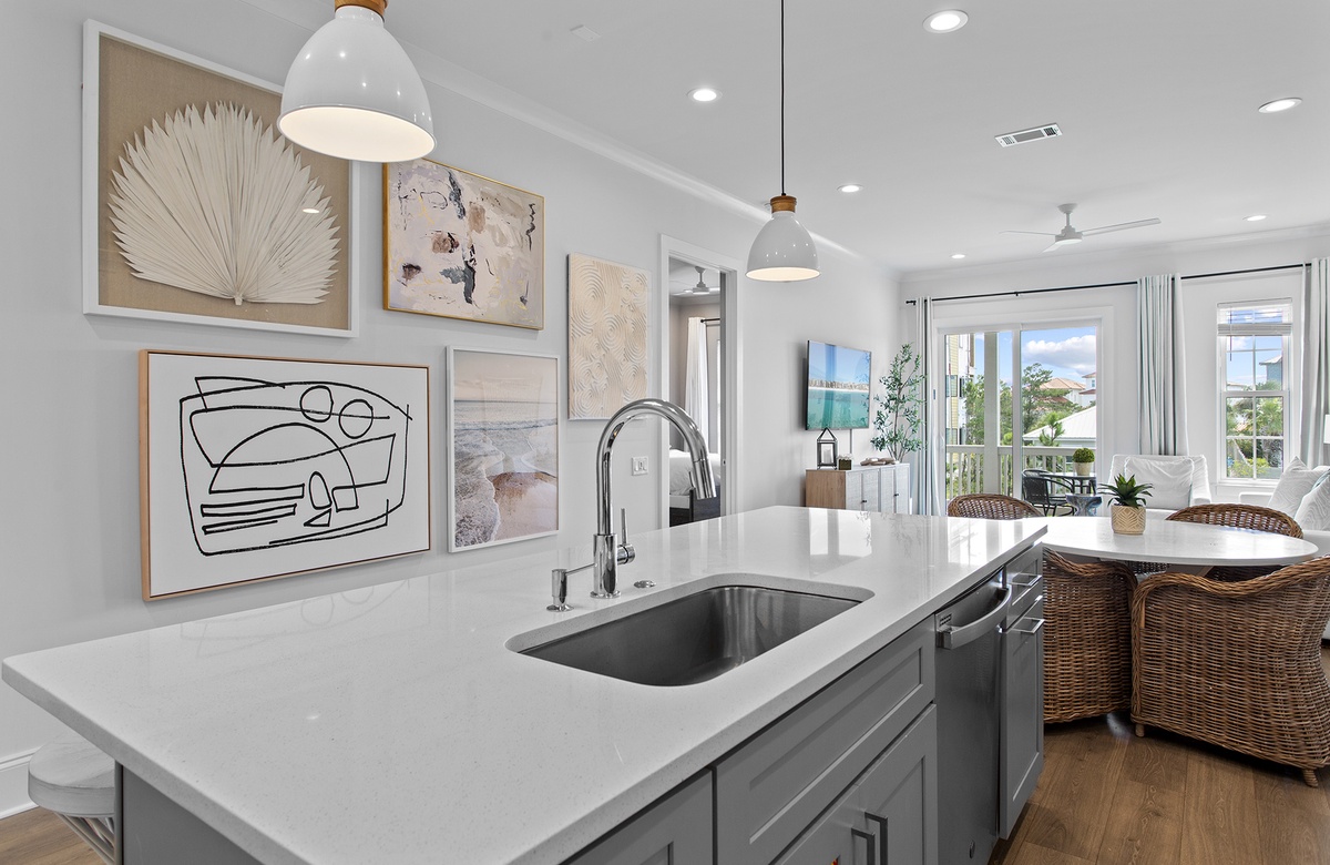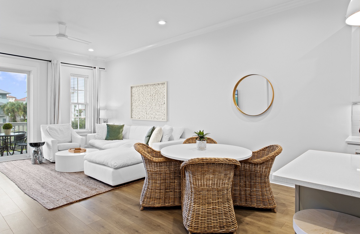 The living room is bright and welcoming, with sunlight streaming through a sliding glass door that leads to a balcony overlooking a lagoon. It is furnished with a glass-topped table and outdoor chairs. The setting is perfect for chatting with your family and friends, snacking on coastal appetizers, and enjoying the perfect Florida breezes. Back inside, the living area is equally relaxing. It includes a seating ensemble comprising a cream-colored couch and a white armchair. A cocktail table, chic rug, console table, and a wall-mounted TV complete the space. The living room opens into the dining area, where four woven chairs are seated around a white, round-topped table. The large kitchen creates a gathering space for both cooking and hanging out. It includes white cabinetry, stainless steel appliances, spacious countertops, and a breakfast island with stool seating.