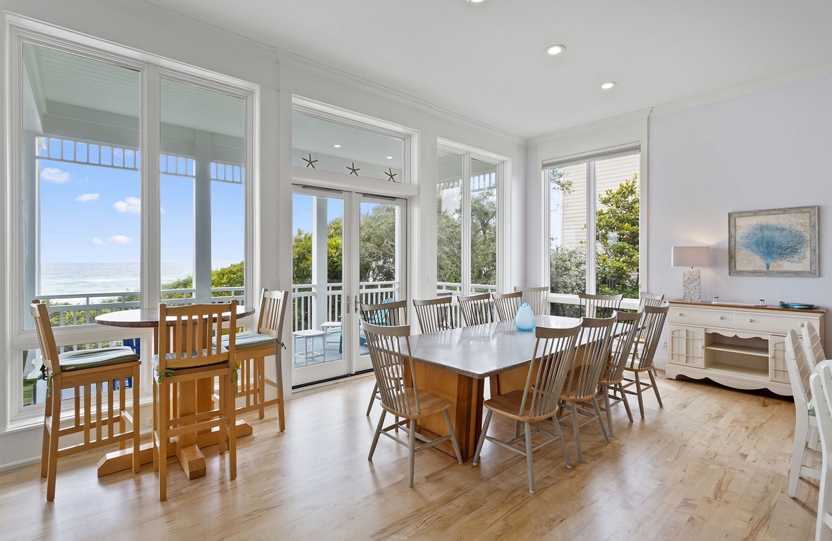 - Dining area with table seating for 8, breakfast table for 3, bar seating for 5