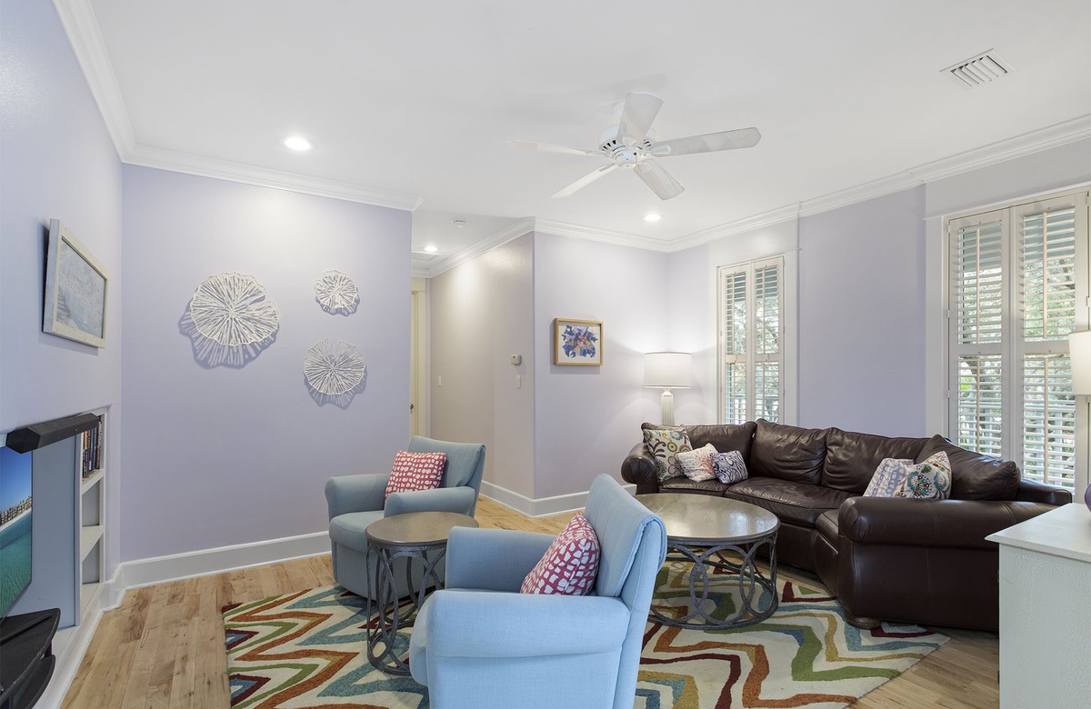 - Living room with 50” flat screen TV, mini-fridge/wet bar