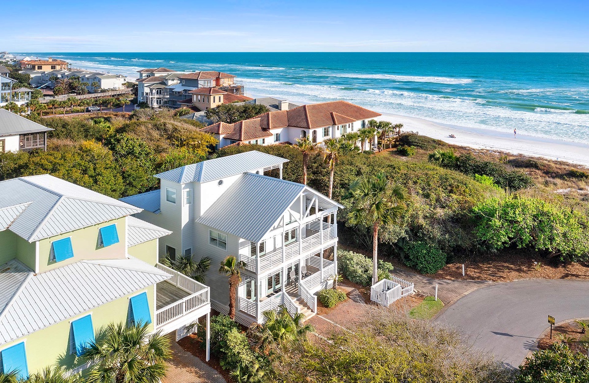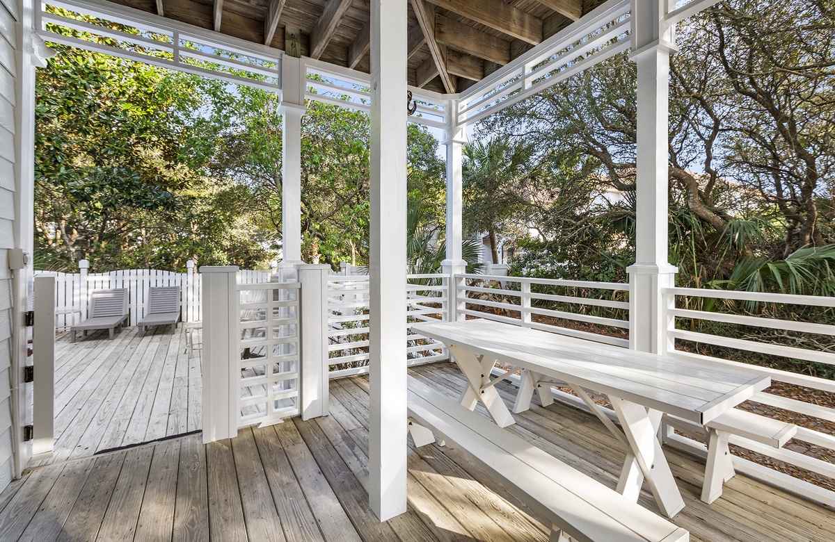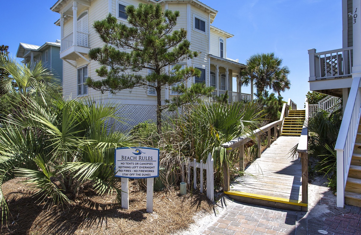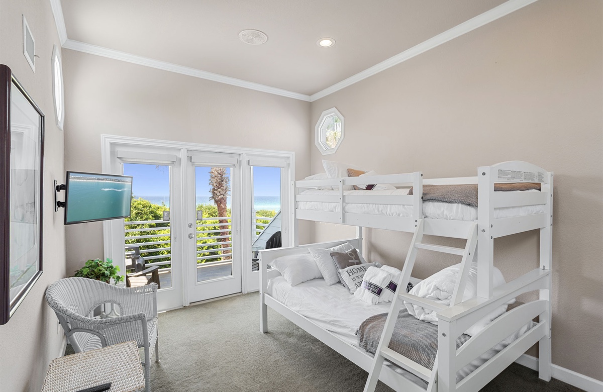 The first floor offers a lovely main living area and dining area with easy access to the side porch and pool. Additionally on this level are the kitchen, laundry room and a bedroom with two twin beds and full bathroom, with access to the side porch and pool area as well. The master bedroom suite with king bed on the second floor offers views of the waves rolling ashore from its wrap-around porch. Also on the same floor are two additional bedrooms with queen beds in each and a shared bath. The third floor offers an observation room with a twin/full bunk bed and TV.