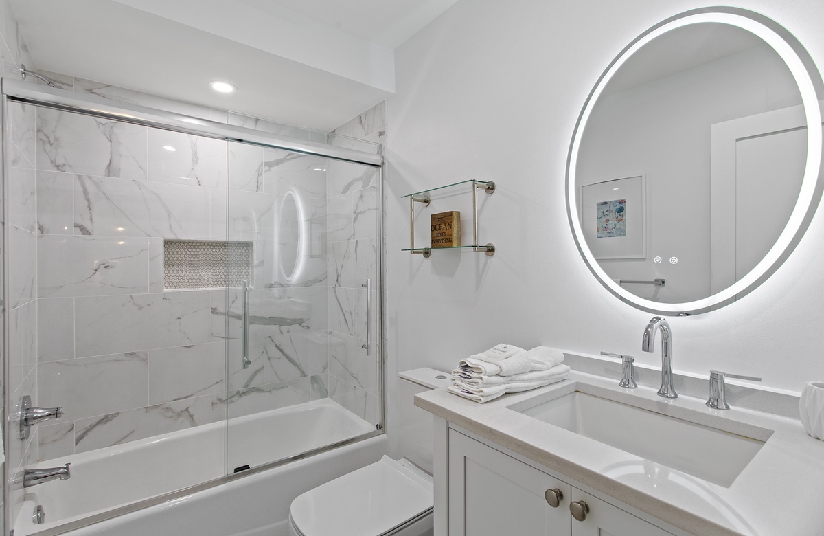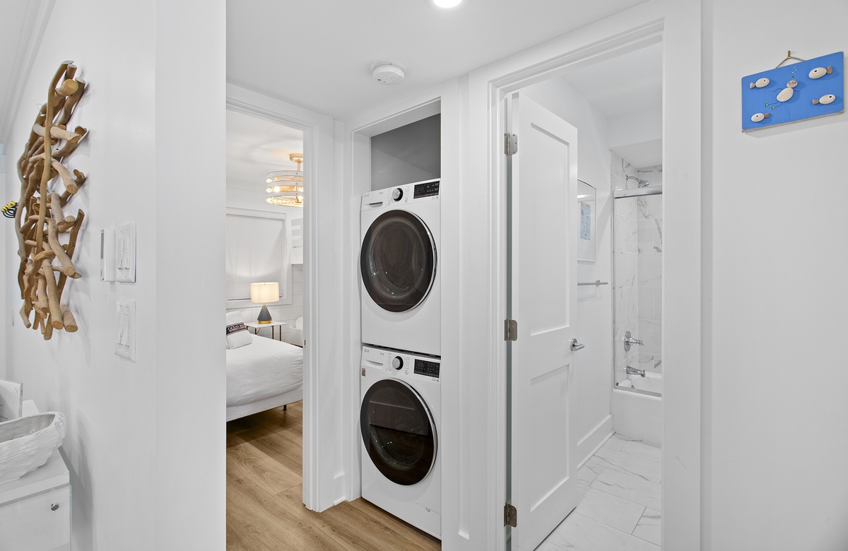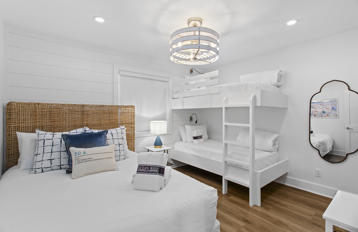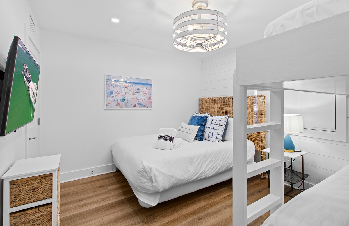 The primary suite faces the gulf, ensuring guests can enjoy incredible views from the moment they wake up in paradise. The room includes an upgraded king-size bed, a flatscreen TV, a large window, shiplap walls, and access to the breezy balcony. It also has an ensuite bath with a glass-walled walk-in shower. The guest bedroom provides sleeping accommodations for up to four individuals. It includes an upgraded queen-size bed with a straw net headboard, a twin bunk with charging ports, a wall-mounted TV, and utilizes a full hall bath.