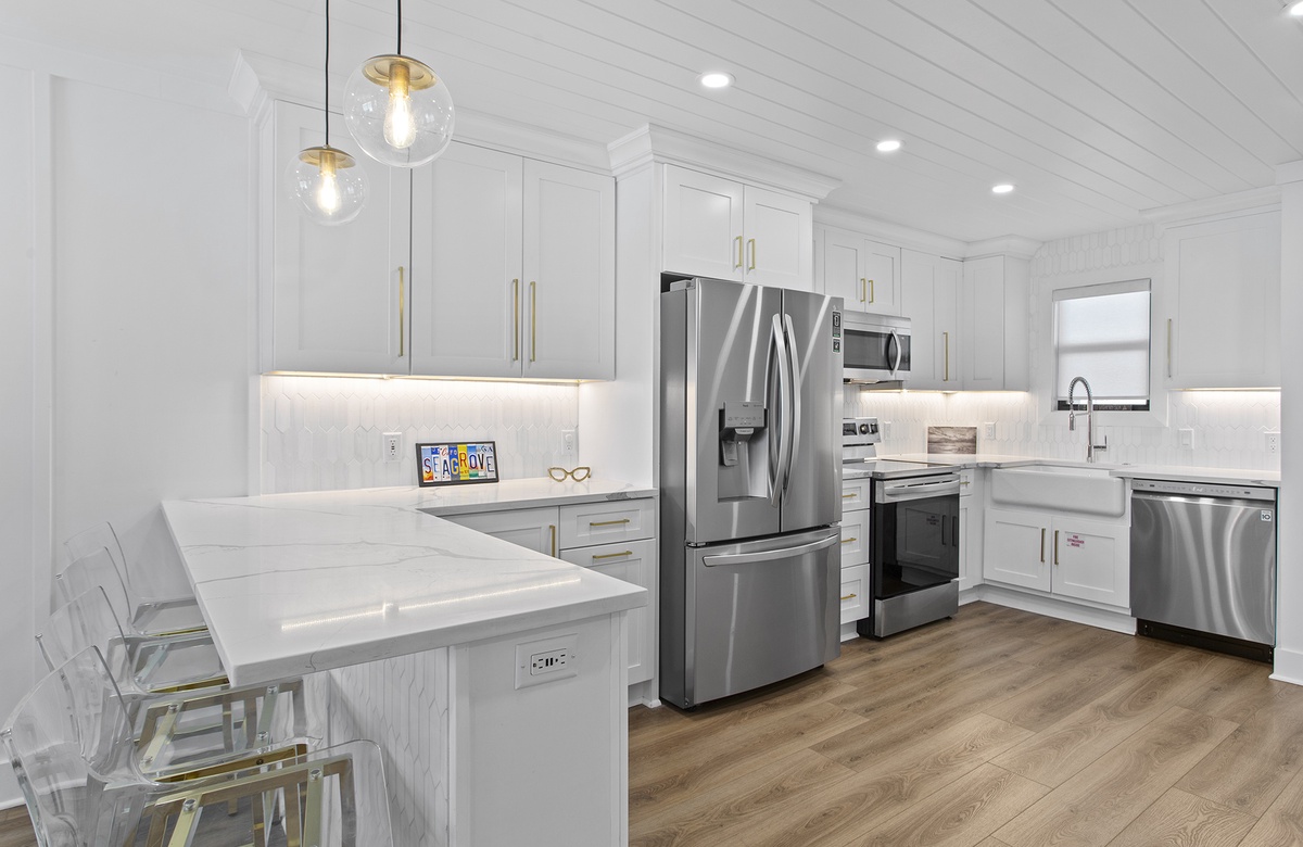 Beach vibes and laidback luxury greet you upon arrival. As soon as you step through the front door, you’ll glimpse glistening waves and crystal sands through a sliding glass door at one end of the living room. The door accesses a waterfront balcony with spectacular views. Furnished with teal-colored Adirondack chairs, there’s no better spot to watch the waves, sip a cold cocktail, and let your worries wash away. Inside, the living area is charmingly decorated with coastal accents and subtle pops of color. Shiplap walls and sandy-colored wood floors add to the beachy atmosphere. A white couch faces a smart flatscreen TV mounted above a chic credenza. The couch is flanked by two matching white armchairs. A tiered drink table and geometric-patterned rug complete the space. The adjacent kitchen is spacious and brightly lit. It features quartz countertops, white cabinetry, built-in charging ports, and stainless-steel appliances. A breakfast bar provides seating for four.