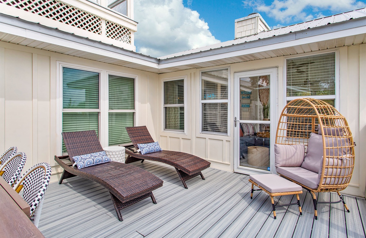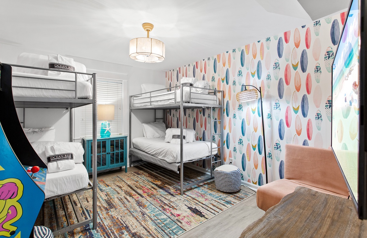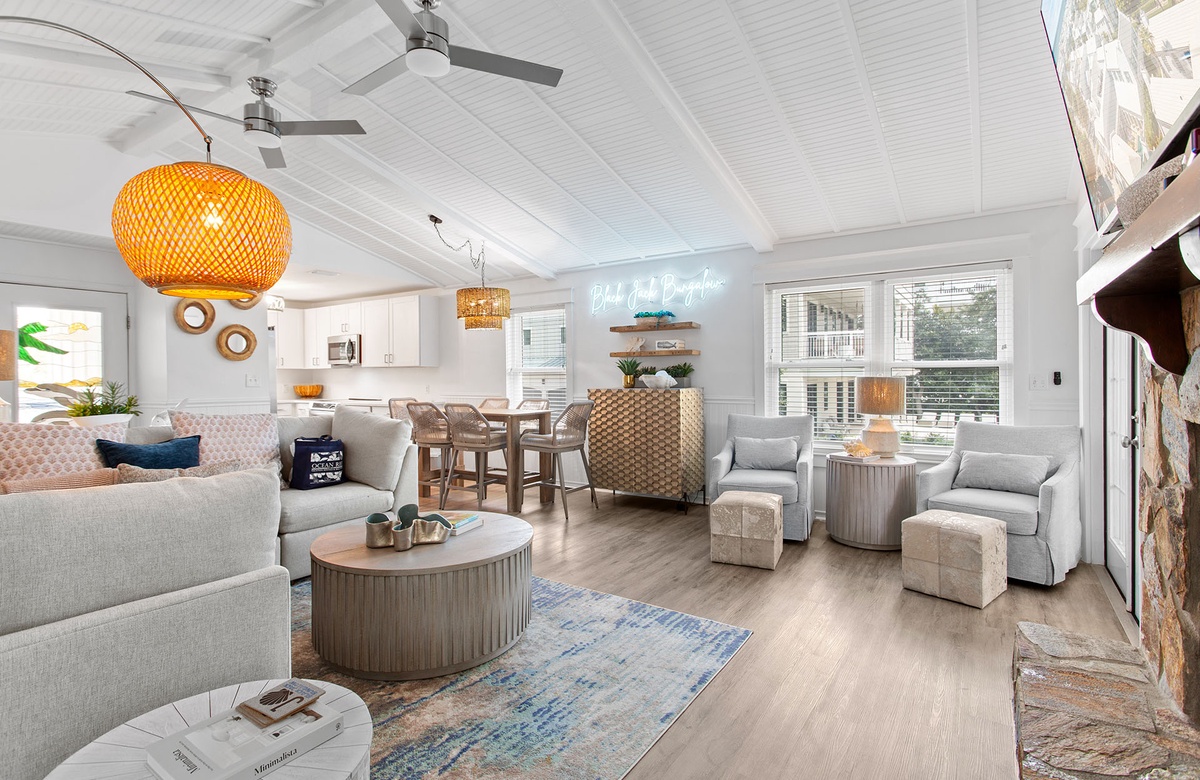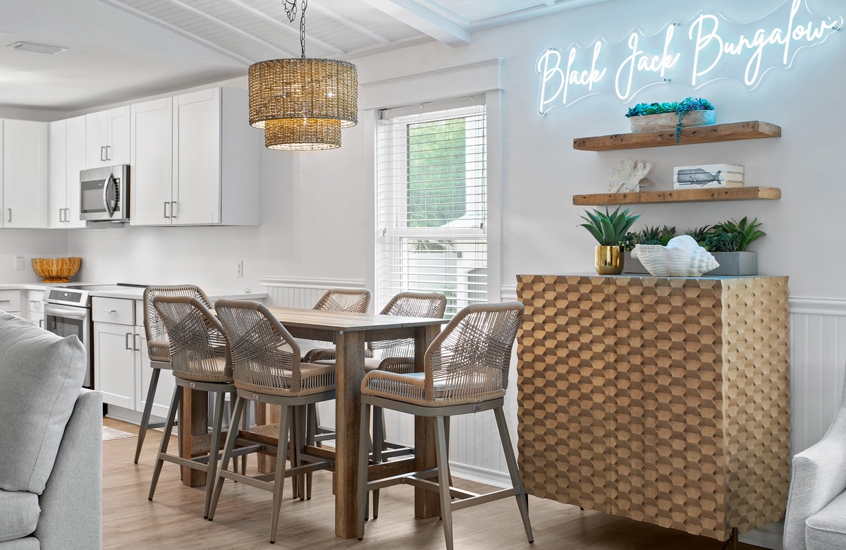 Black Jack Bungalow makes every guest feel like a winner with its refreshed coastal charm, spacious layout, and playful amenities. This pet-friendly three-bedroom retreat comfortably hosts up to a dozen guests with a mix of king beds, bunks, and sleeper sofas—perfect for family gatherings or group getaways. Inside, vaulted white-beamed ceilings, glowing natural light, and coastal-chic décor set the stage for relaxation. The open living area invites you to gather around a decorative stone fireplace, while the dining room and sleek, updated kitchen make mealtimes effortless. A cheerful sunroom wrapped in windows adds yet another space to unwind, leading directly to the expansive deck for dining under the stars. Each bedroom has its own personality, from the serene king suite with private balcony and marble walk-in shower, to the colorful bunk room with arcade games and surfboard-patterned wallpaper. For a touch of whimsy, a crow’s nest observation deck crowns the home, offering sweeping Gulf views and unforgettable sunsets.