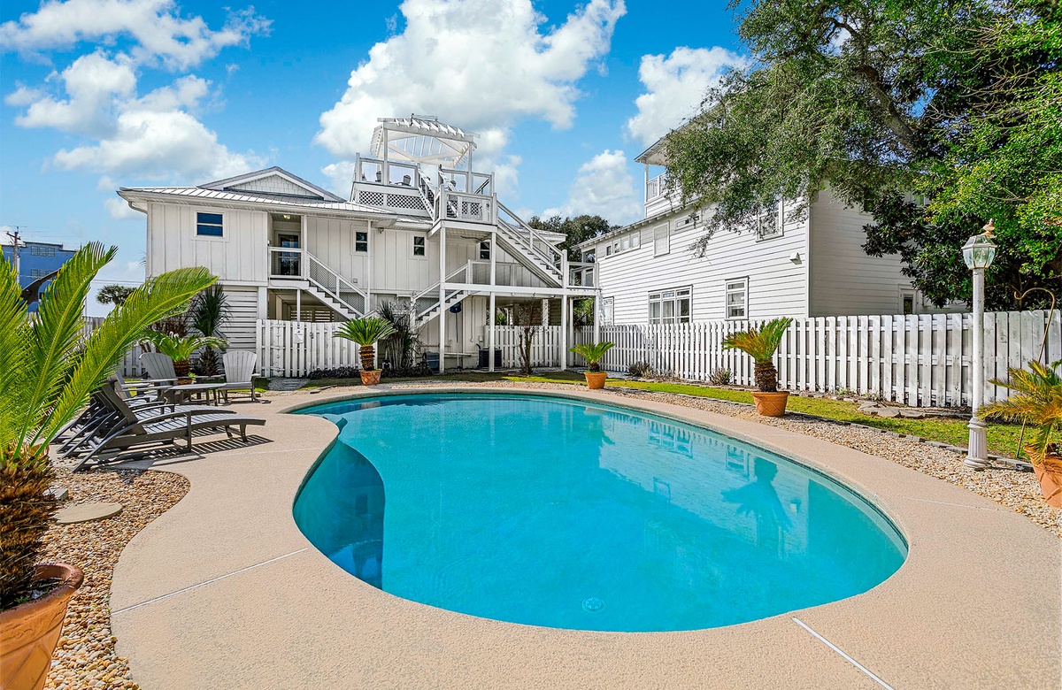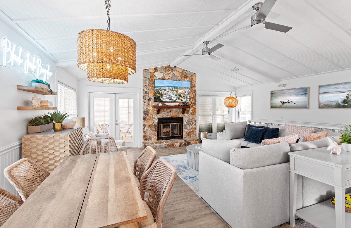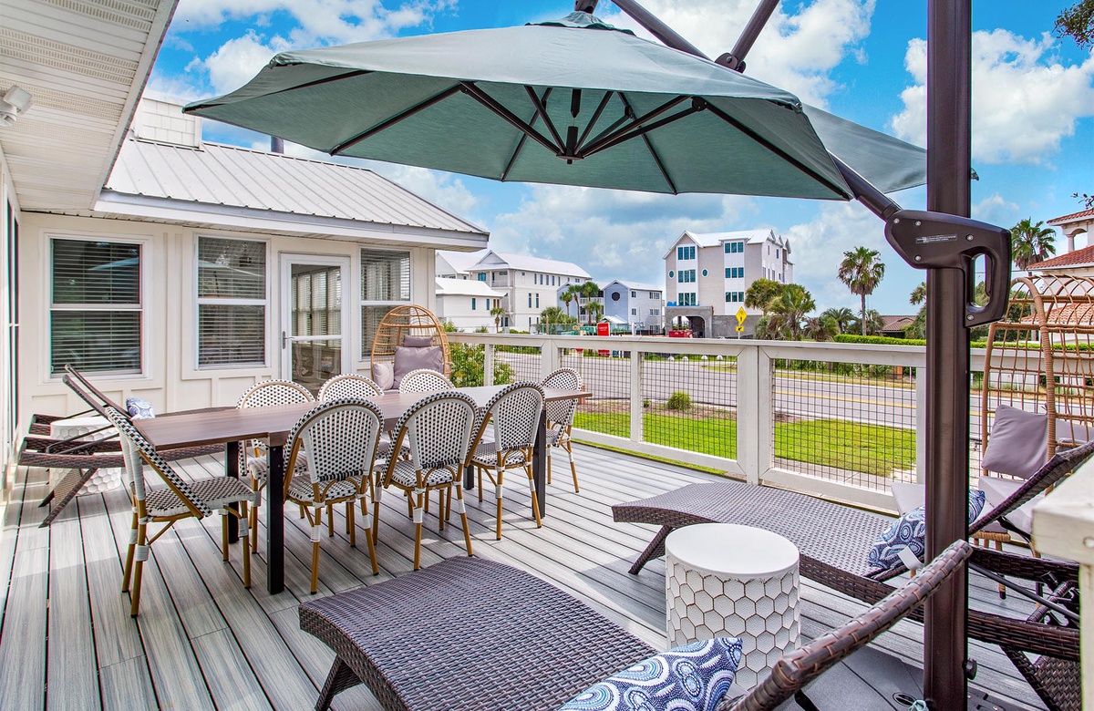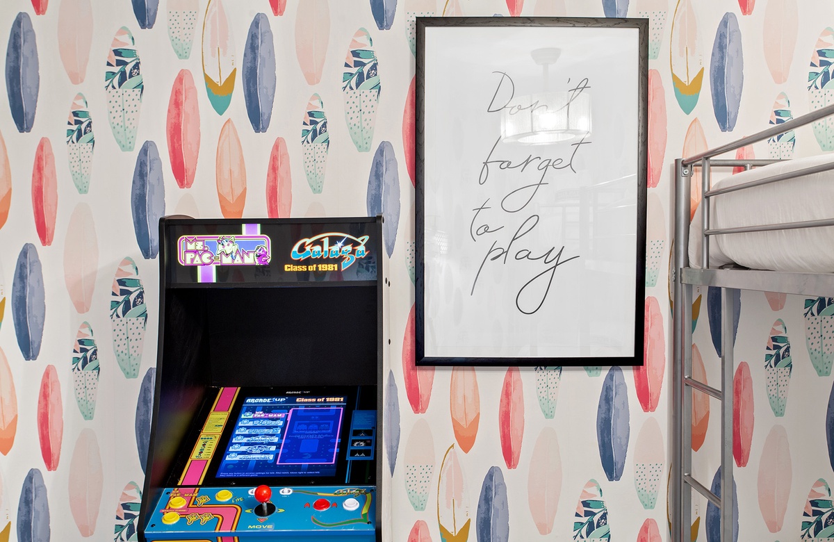 Black Jack Bungalow makes every guest feel like a winner with its refreshed coastal charm, spacious layout, and playful amenities. This pet-friendly three-bedroom retreat comfortably hosts up to a dozen guests with a mix of king beds, bunks, and sleeper sofas—perfect for family gatherings or group getaways. Inside, vaulted white-beamed ceilings, glowing natural light, and coastal-chic décor set the stage for relaxation. The open living area invites you to gather around a decorative stone fireplace, while the dining room and sleek, updated kitchen make mealtimes effortless. A cheerful sunroom wrapped in windows adds yet another space to unwind, leading directly to the expansive deck for dining under the stars. Each bedroom has its own personality, from the serene king suite with private balcony and marble walk-in shower, to the colorful bunk room with arcade games and surfboard-patterned wallpaper. For a touch of whimsy, a crow’s nest observation deck crowns the home, offering sweeping Gulf views and unforgettable sunsets.
