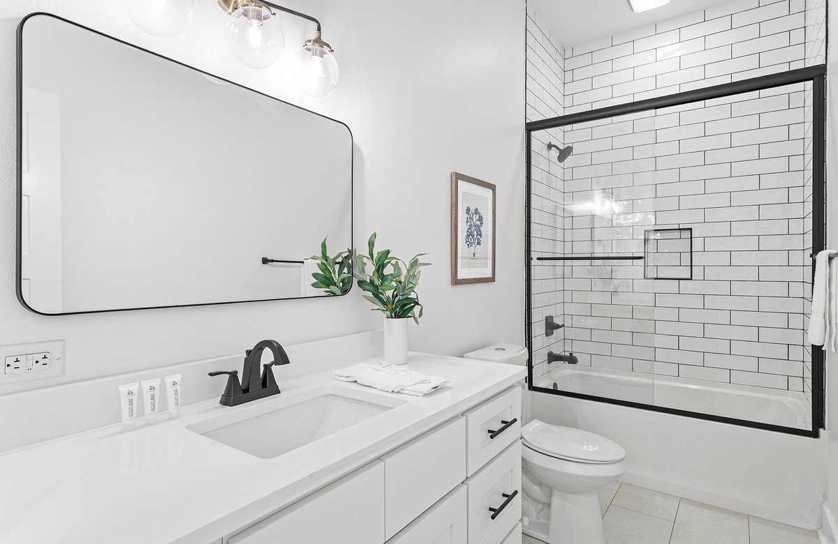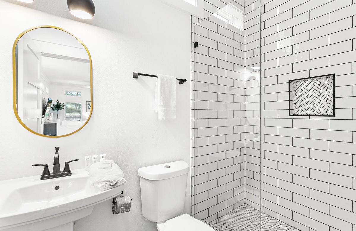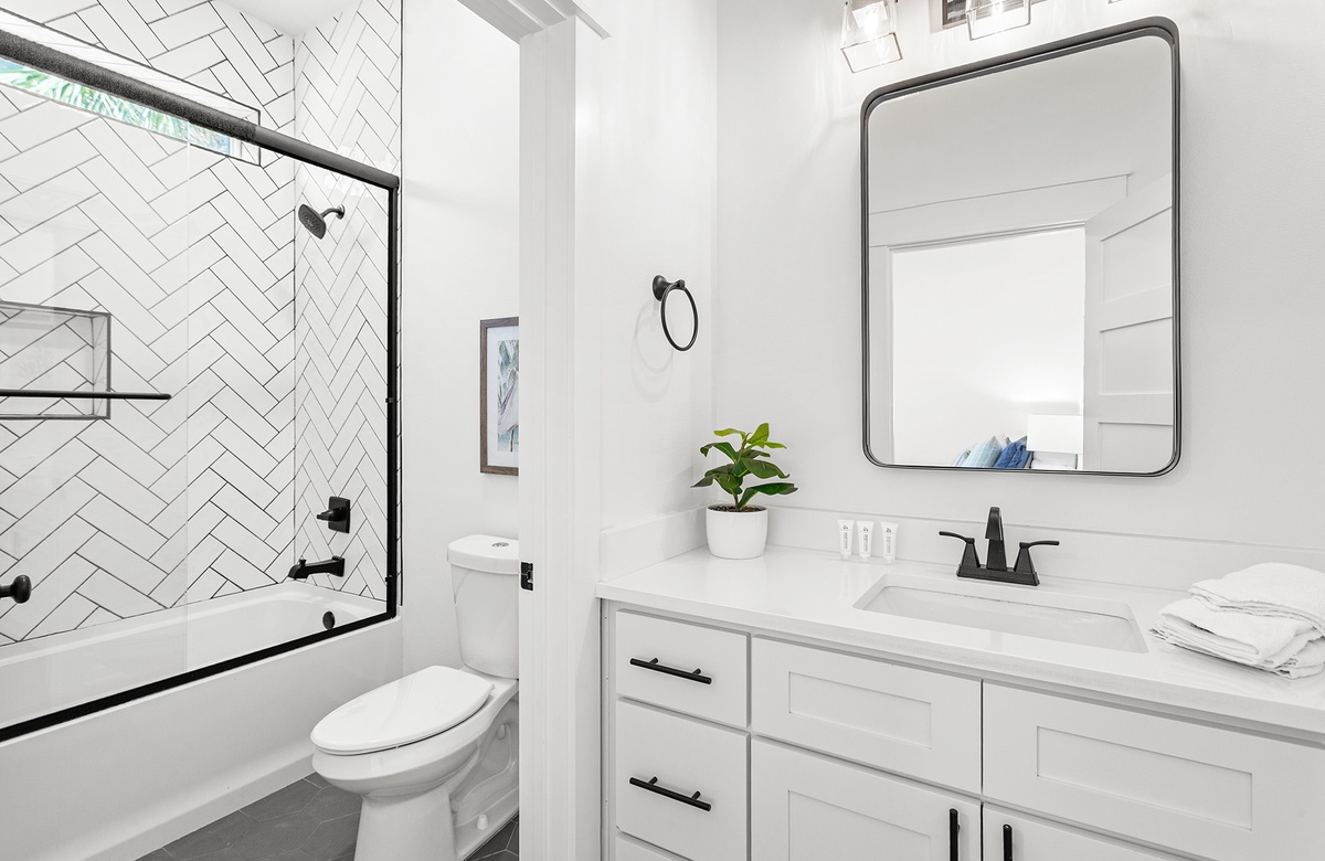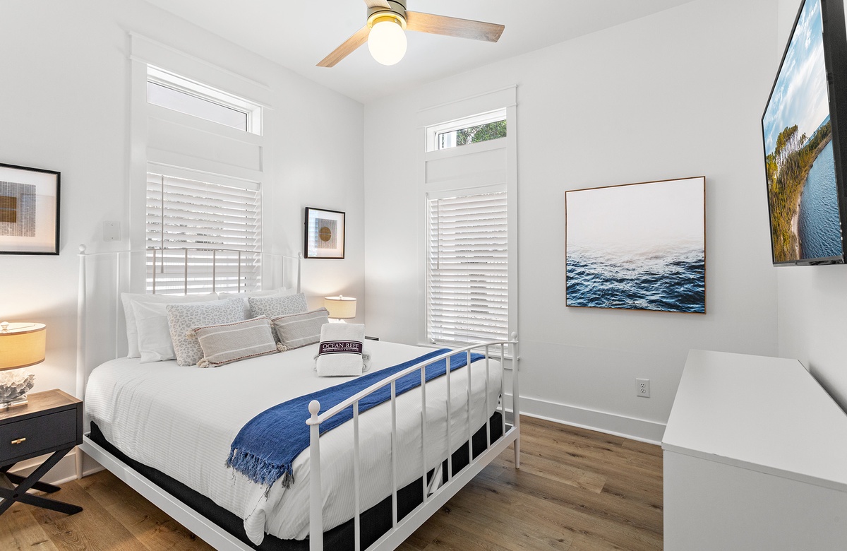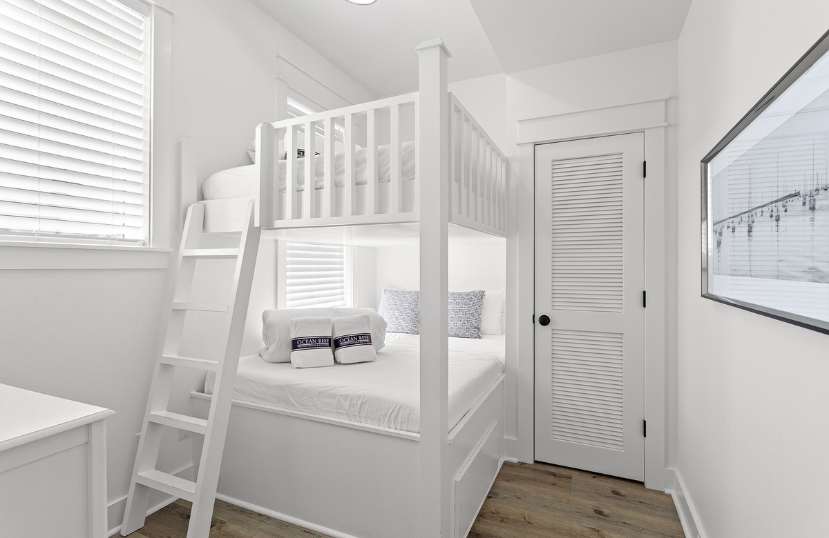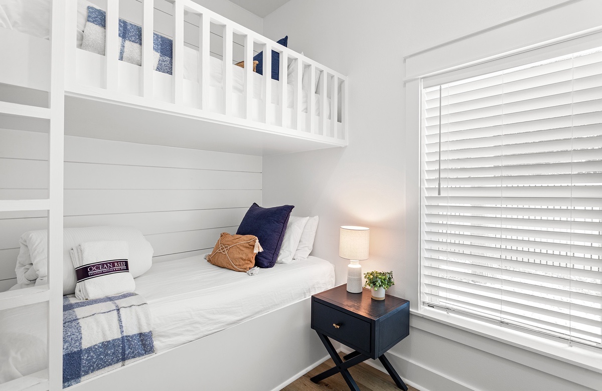 The first floor offers a bonus primary suite and three additional guest quarters. The bonus primary bedroom features a king-size bed with a handsome black ebony decorative metal frame, a convenient kitchenette, and an ensuite bath with a walk-in shower. One guest bedroom boasts a charming cottage-style queen-size bed with a tub-shower combination. Another guest bedroom has coastal-style furnishings with a queen-size bed flanked by side tables and glass bottle base lamps. A cozy bunk room with twin beds and access to another hall bath with a tub-shower combination complete this floor. These bedrooms share a hall bath with a tub-shower combination.
