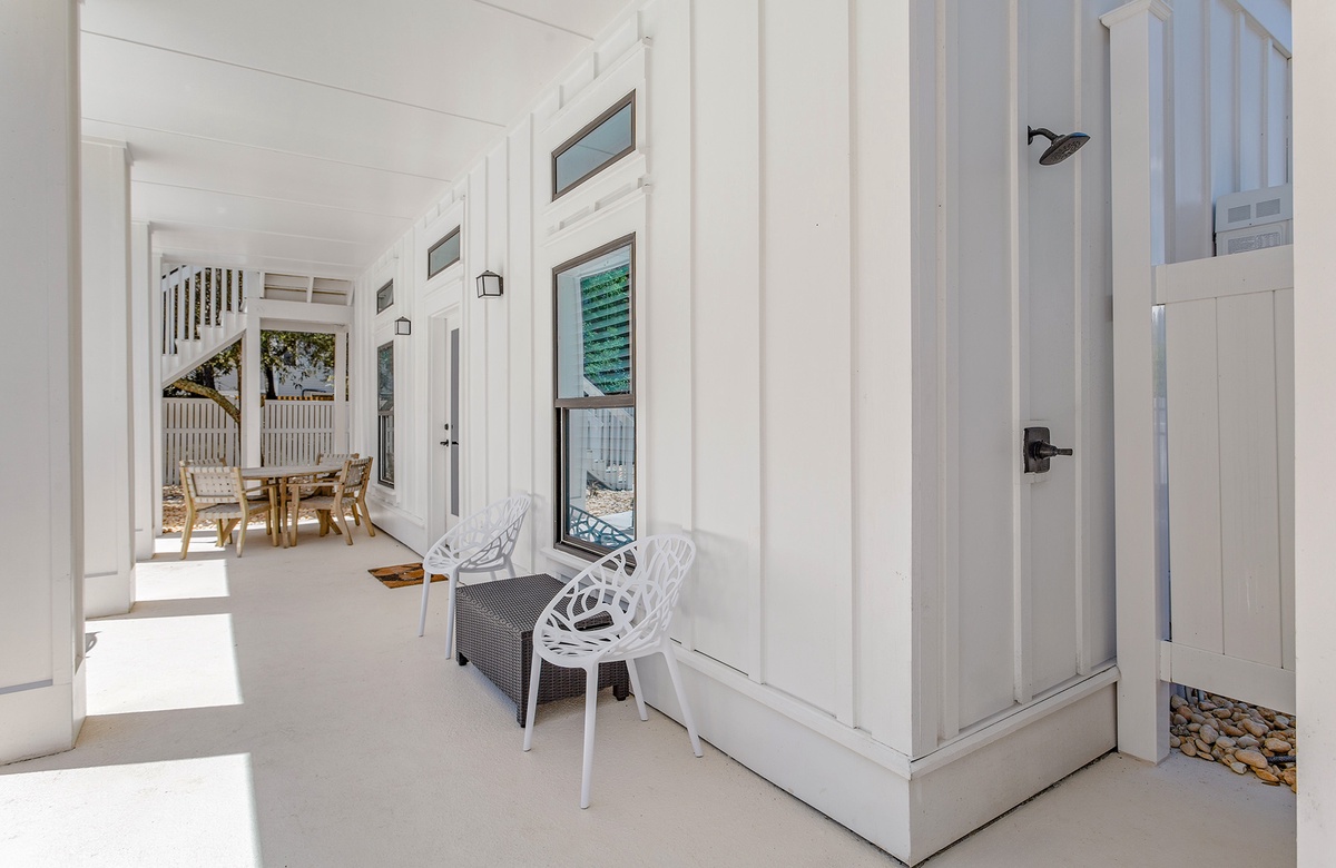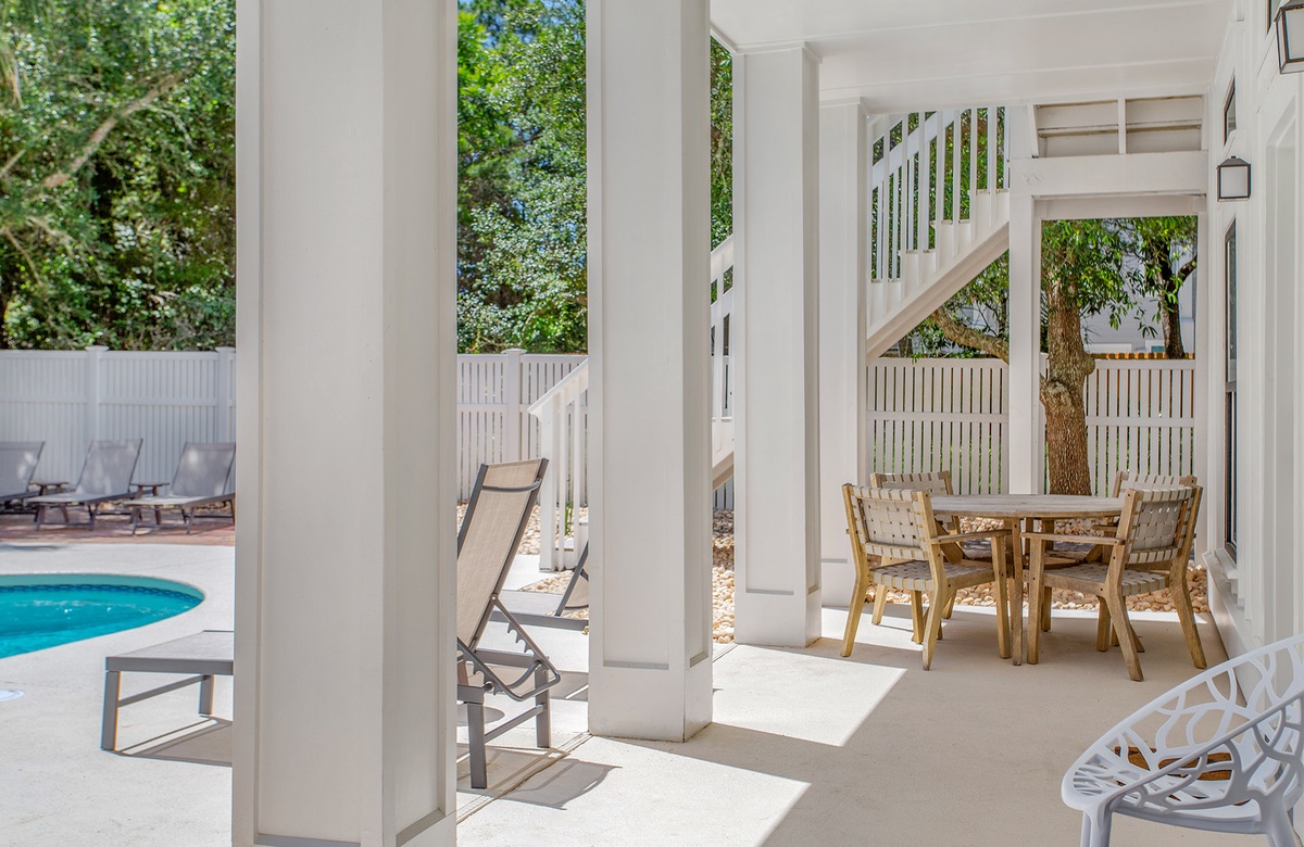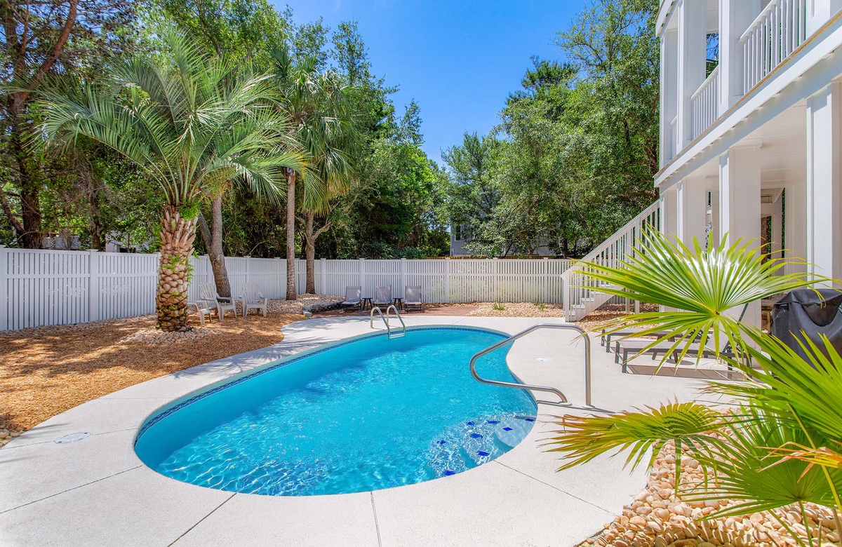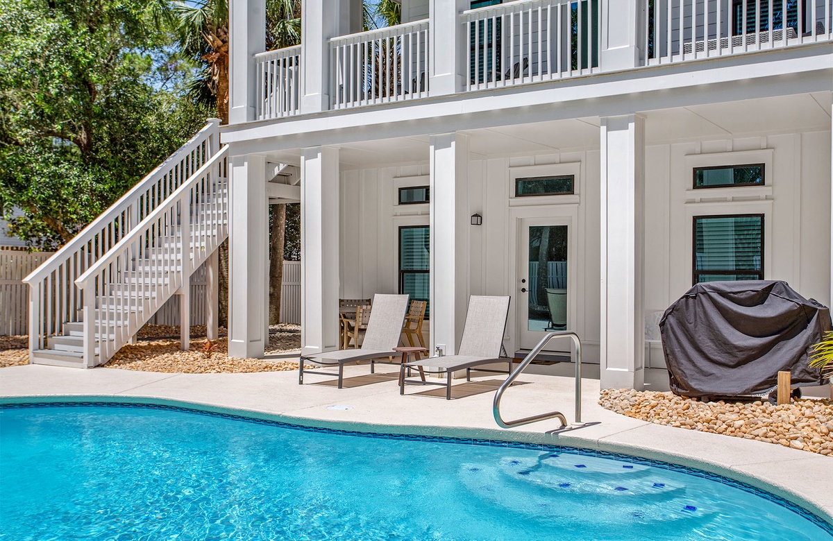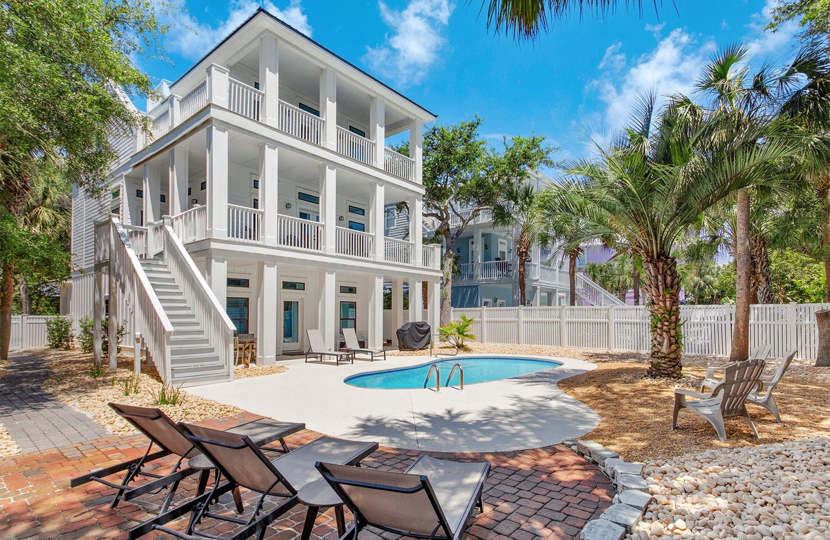 The Blessed Home is set back from Beachwalk Lane, featuring a welcoming Live Oak tree with patio lounge chairs and a spacious paver stone driveway with ample parking. The back of the house showcases three levels of white-columned verandas overlooking an exquisite lagoon- shaped heated swimming pool. The lower-level veranda is perfect for poolside dining with a table, Adirondack chairs, and a gas grill. Enjoy the serene ambiance and lush surroundings while lounging by the pool.
