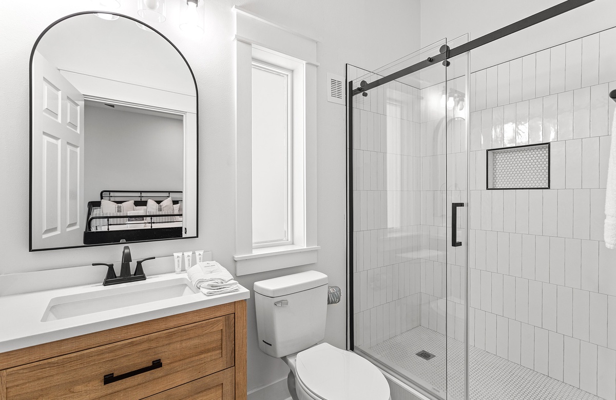 First Floor: King Primary Bedroom with Walk-In Shower and Kitchenette, Bunk Room with Twin/Twin Bunk, Queen Bedroom with Tub/Shower Combo, Hall Bath with Tub/Shower Combo, Queen Bedroom.
