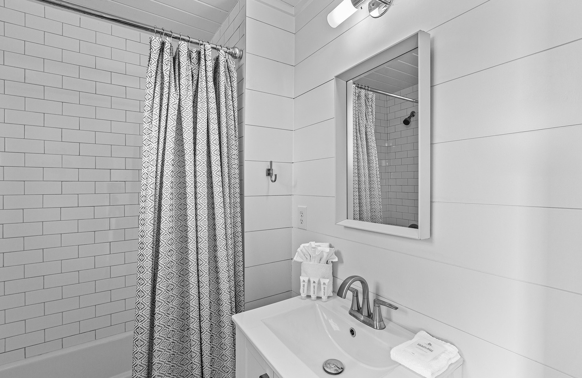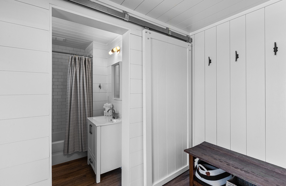 First Floor: Family Room with Two Full/Twin Bunks, Bunk Room with Three Twin Bunks, Hall Bath with Tub/Shower Combo, King Bedroom with Walk-In-Shower, Laundry