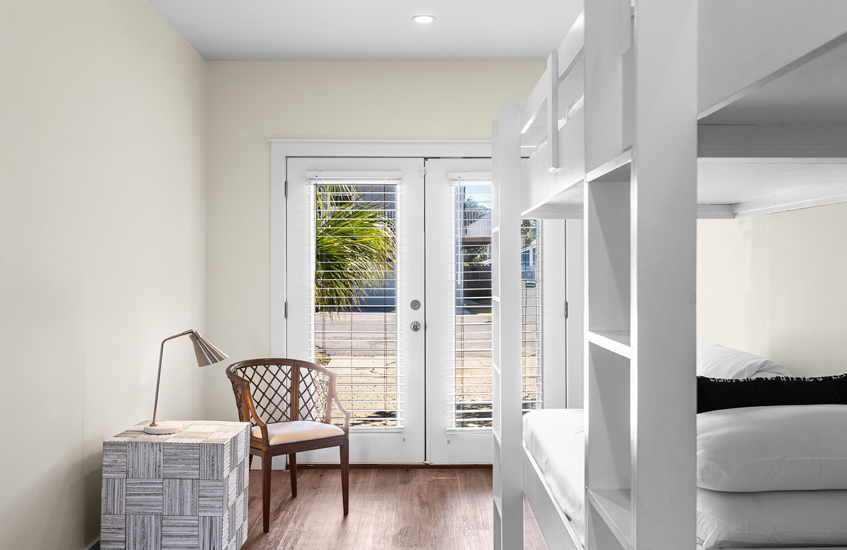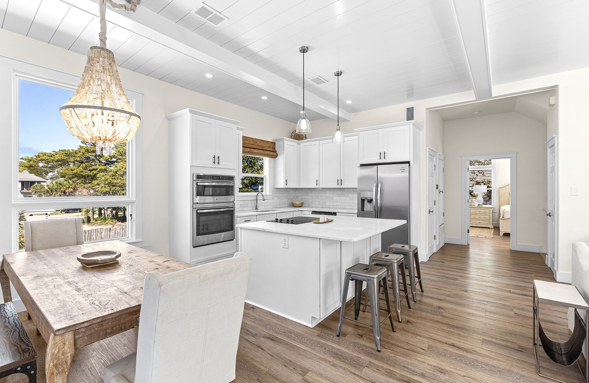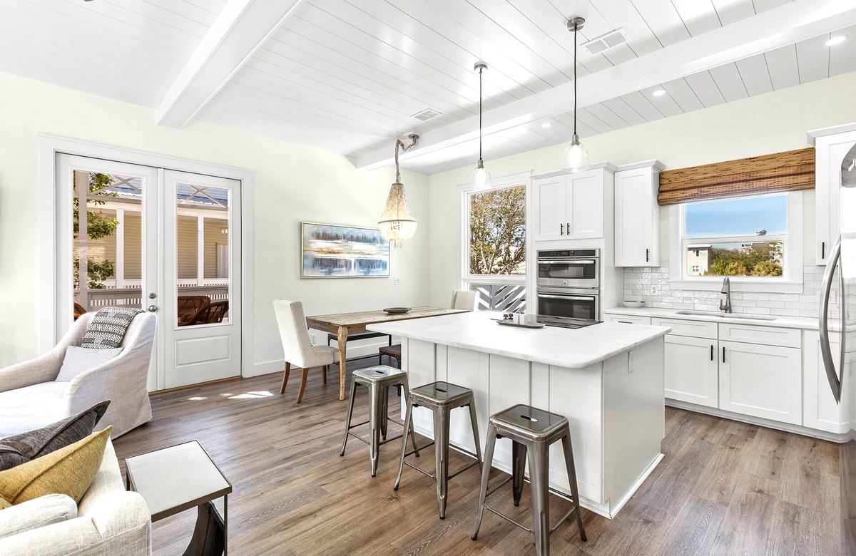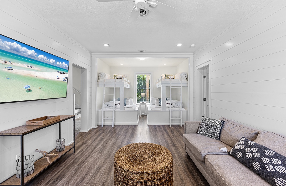 Inside, the home is thoughtfully designed with multiple living areas and spacious accommodations across three floors. The first level features a family room with a NEW cozy wraparound couch, a large flatscreen TV, and a built-in bunk area that sleeps 12 guests—perfect for kids or the young at heart. A private king bedroom with an ensuite bath provides a relaxing retreat. The second floor boasts a bright and airy living space with white beamed ceilings, a plush sectional, and a chef's kitchen with custom cabinetry and stainless steel appliances. The primary suite on this level features a king-size bed, private deck access, and a spa-like ensuite bath. On the third floor, two additional king bedrooms share a stylish bath, offering comfort and privacy for guests.