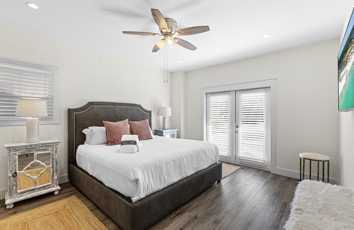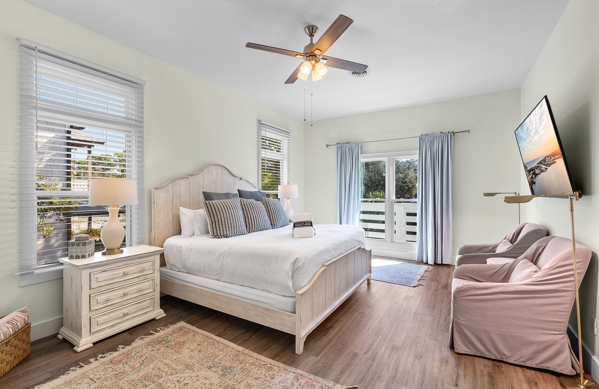 Second Floor: Living Room with Patio Access, Dining, Kitchen, King Primary Bedroom with Walk-In-Shower, Powder Room