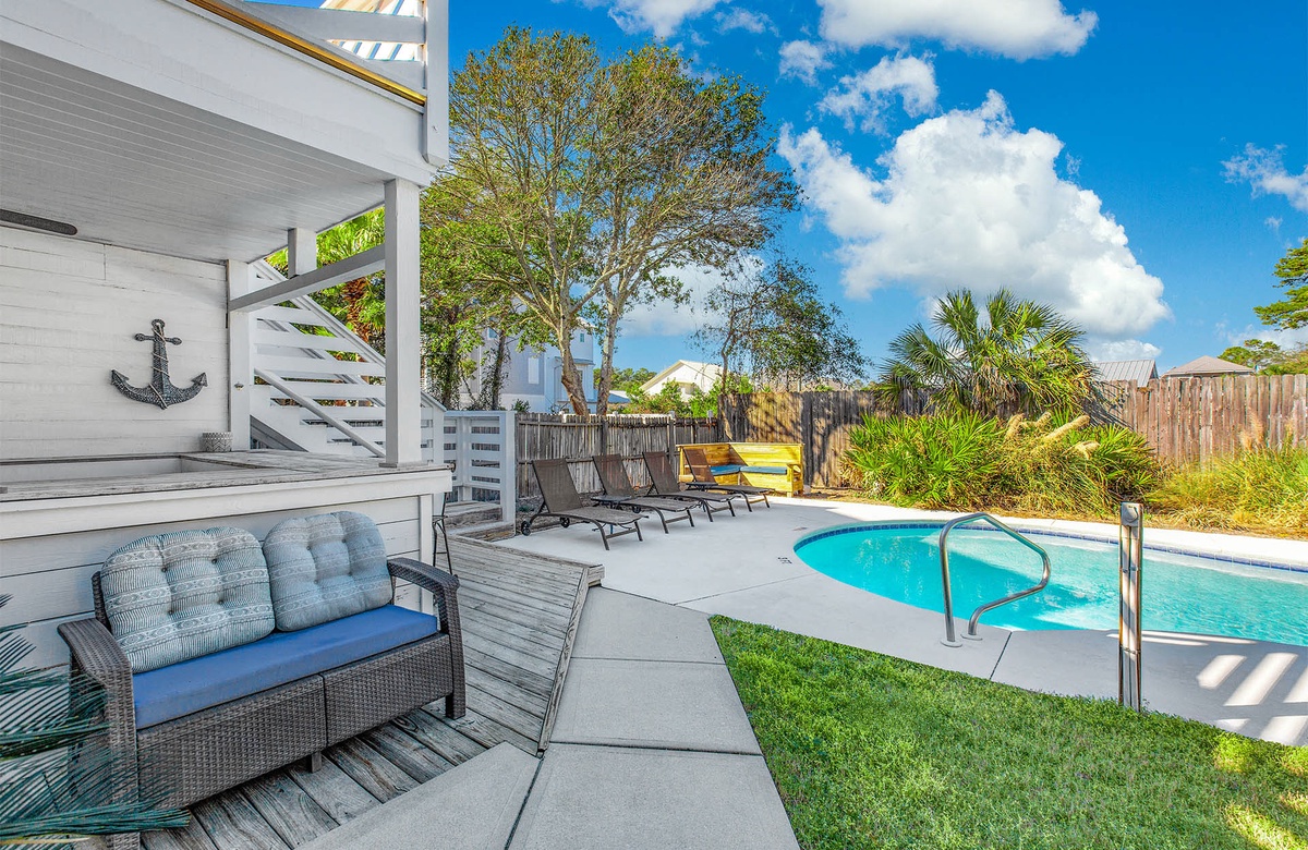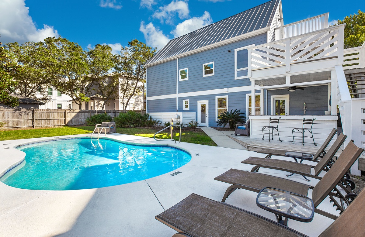 Step outside to your own private lagoon-style pool, surrounded by lush landscaping, magnolias, and tropical palms. Lounge on the sun-soaked patio, take a refreshing dip or enjoy alfresco dining on the expansive decks that overlook the pool. A built-in bar and gas grill on the lower level set the scene for unforgettable poolside cookouts and evening cocktails under the stars.