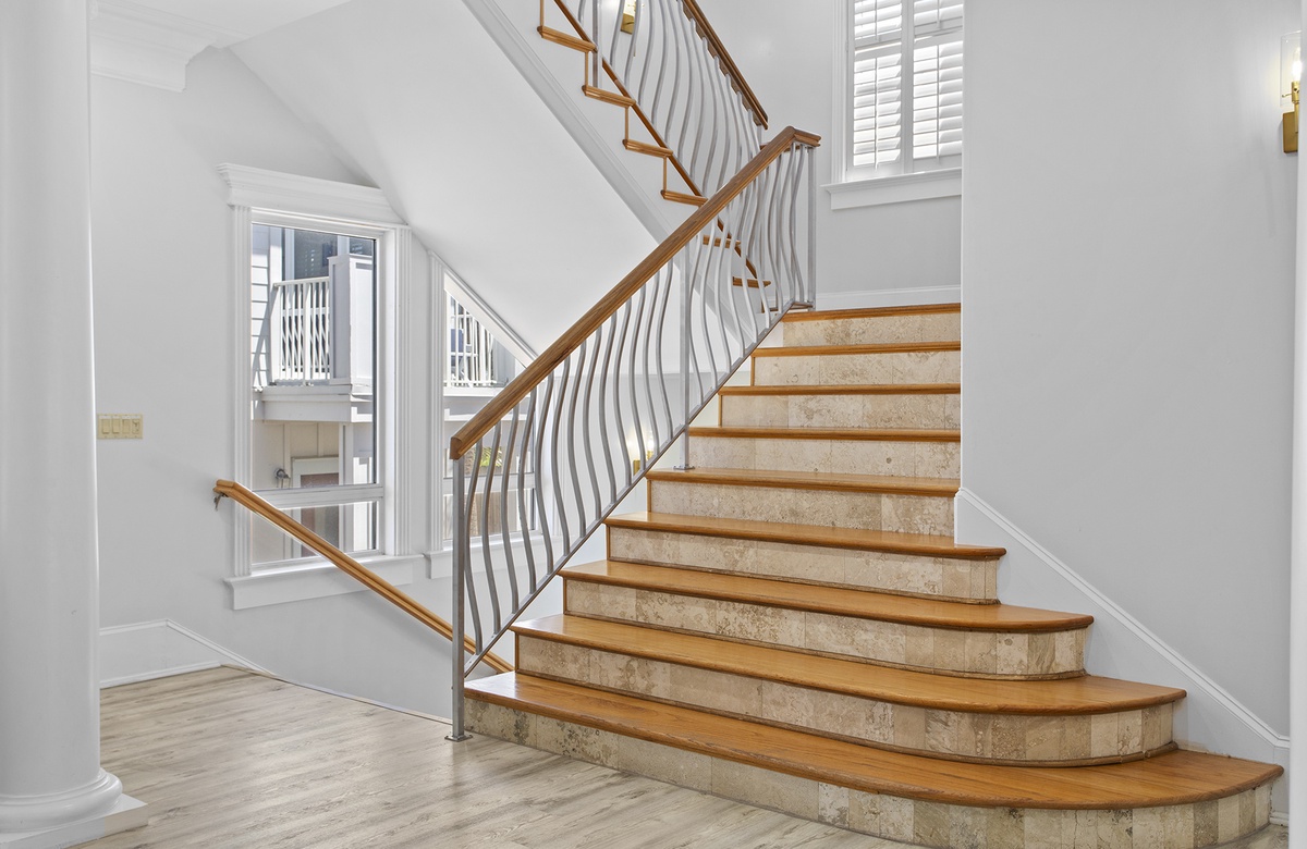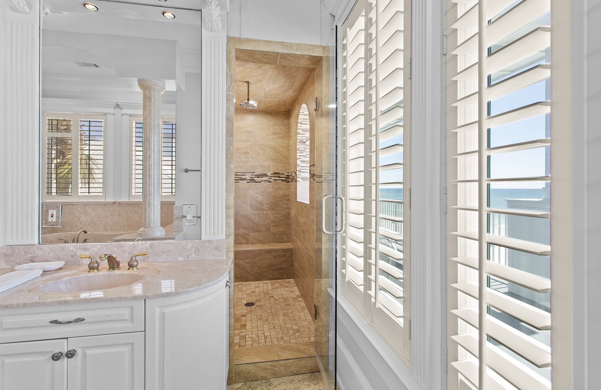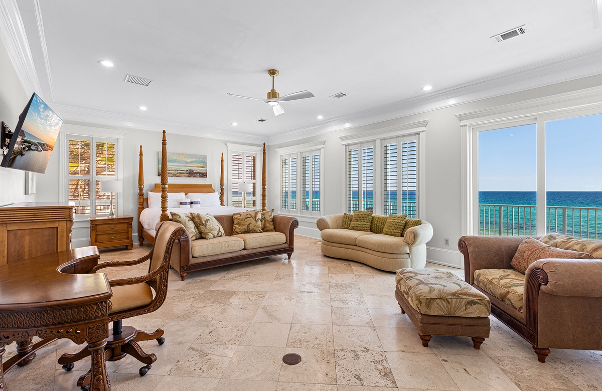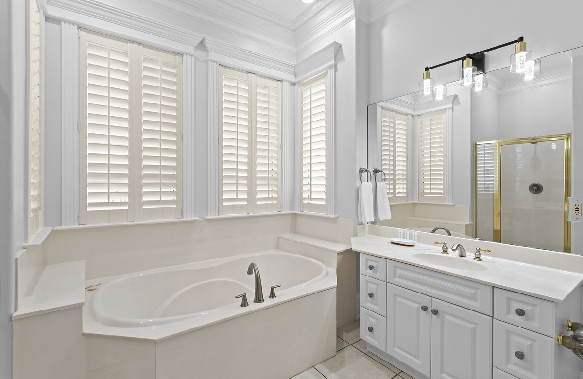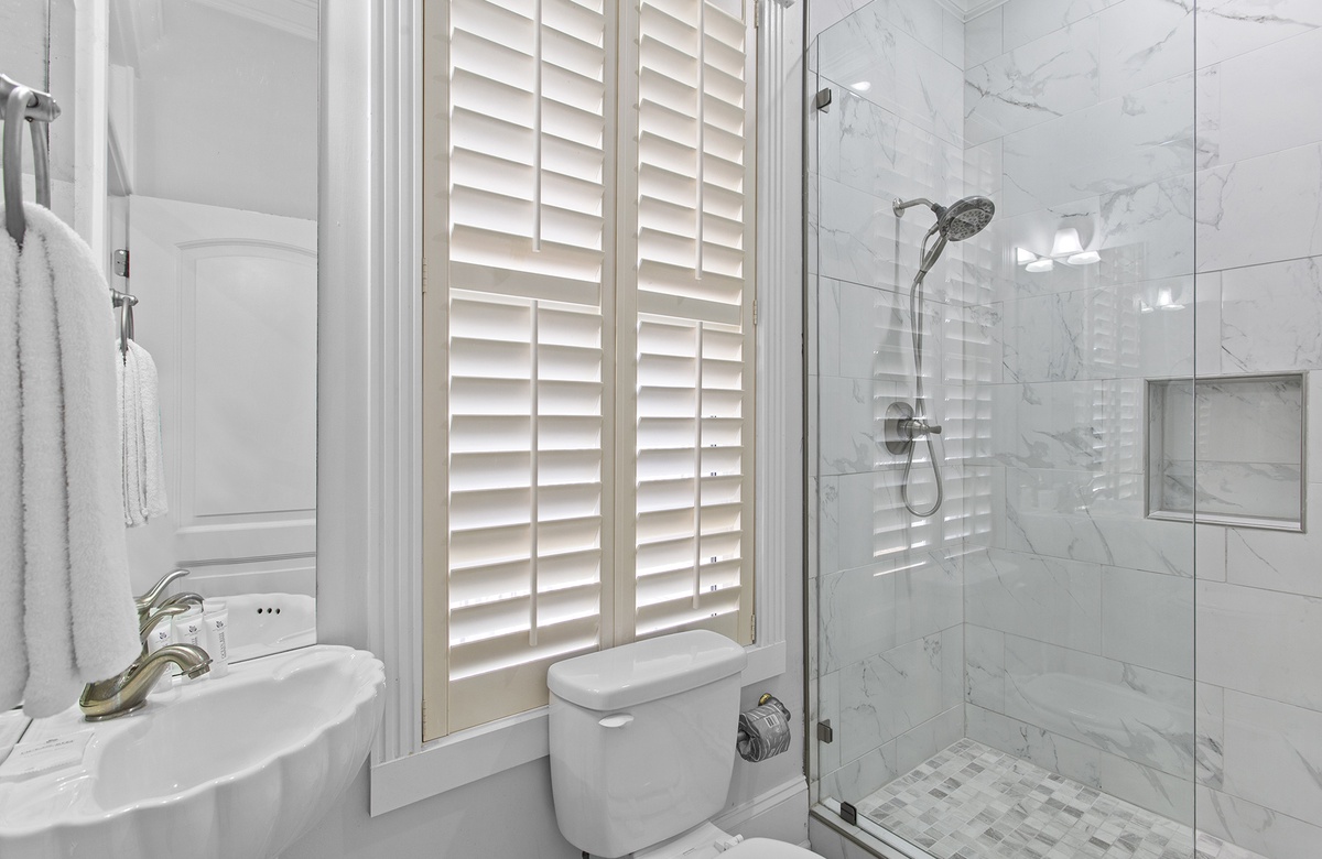 Second Floor: King Master Bedroom with Walk-In Shower and Soaking Tub + Balcony Access, King Bedroom with Queen Sleeper Sofa and Walk-In Shower + Soaking Tub, Bedroom with Two King Beds and Walk-In Shower.