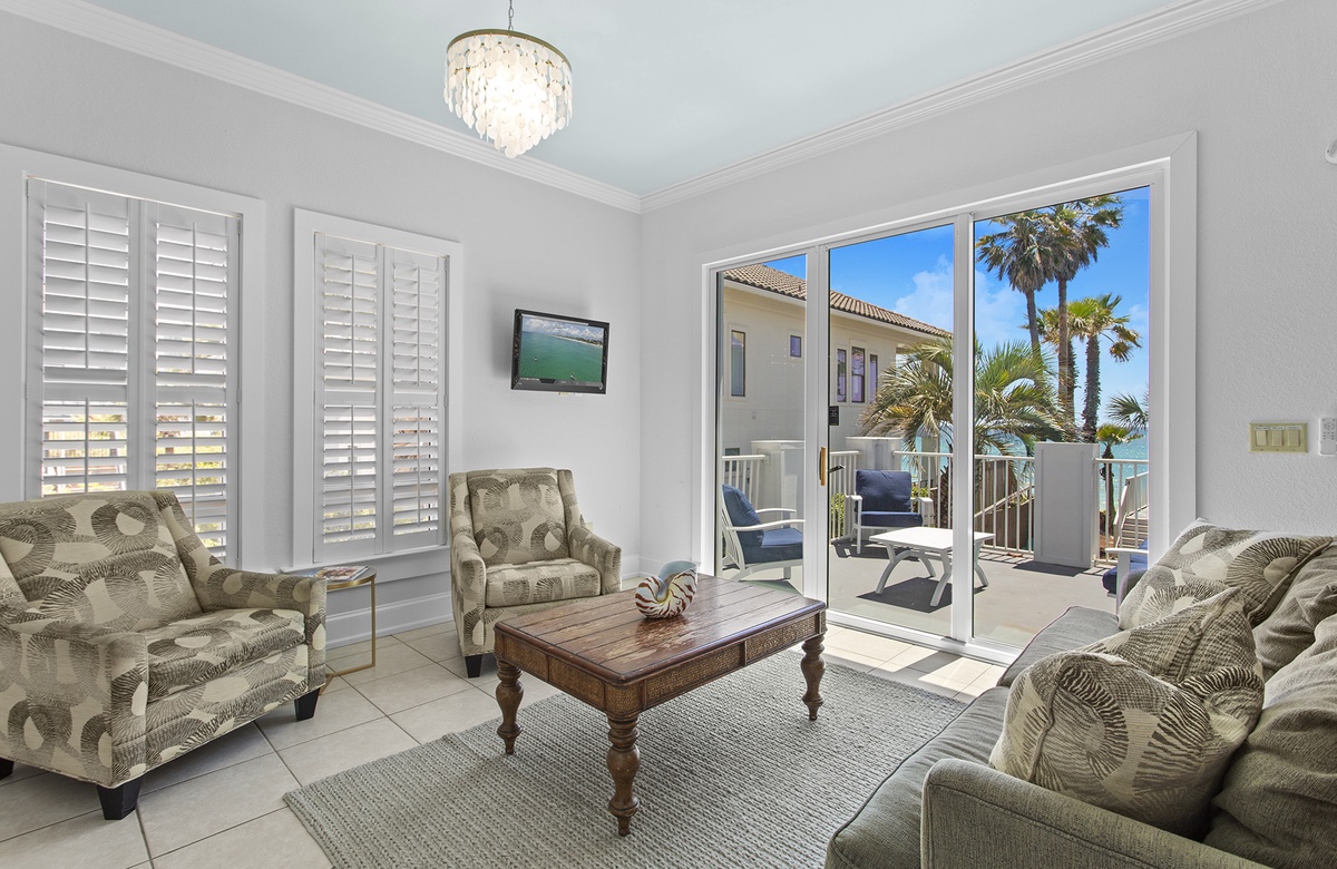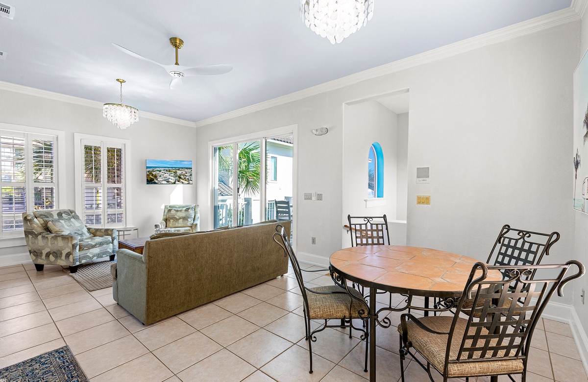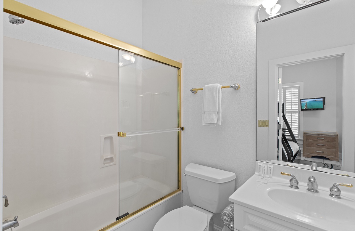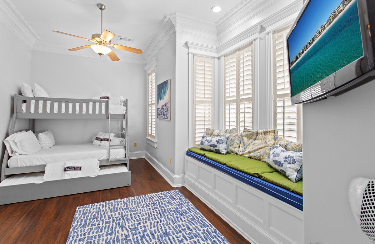 First Floor: Living Room with Patio Access, Kitchen, Dining, Bunk Room with Full/Twin Bunk and Twin Trundle + Tub/Shower Combo, Bonus Den with Queen Sleeper Sofa and Shared Soaking Tub, Laundry.