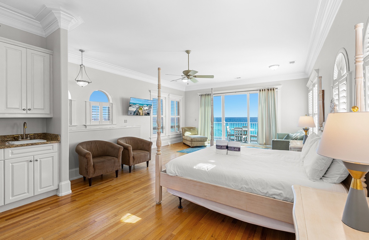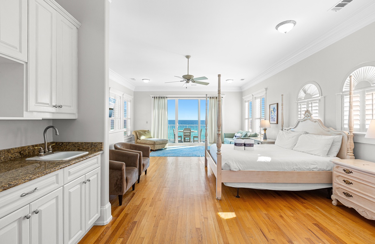 Third Floor: King Bedroom with Queen Sleeper Sofa and Tub/Shower Combo + Wet Bar and Balcony Access.
