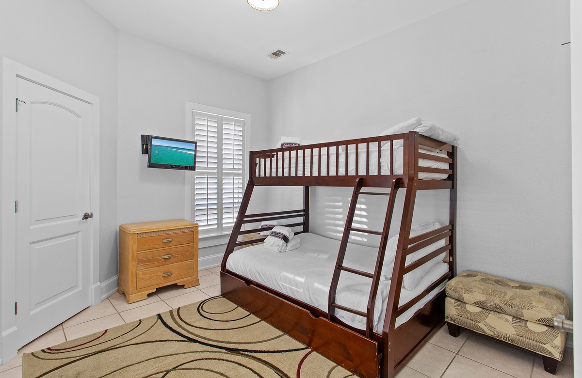 Second Floor: Living Room with Balcony Access, Kitchenette, Dining, King Bedroom with Tub/Shower Combo, Bunk Room with Full/Twin Bunk and Twin Trundle + Tub/Shower Combo.