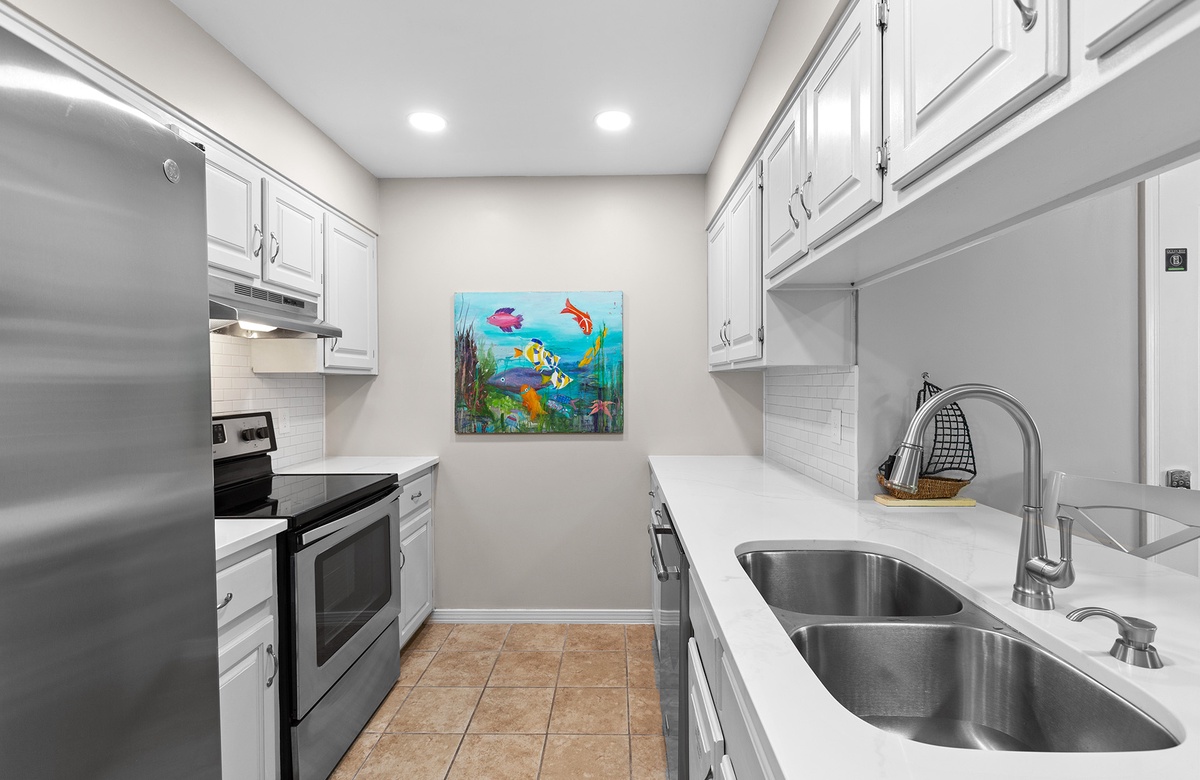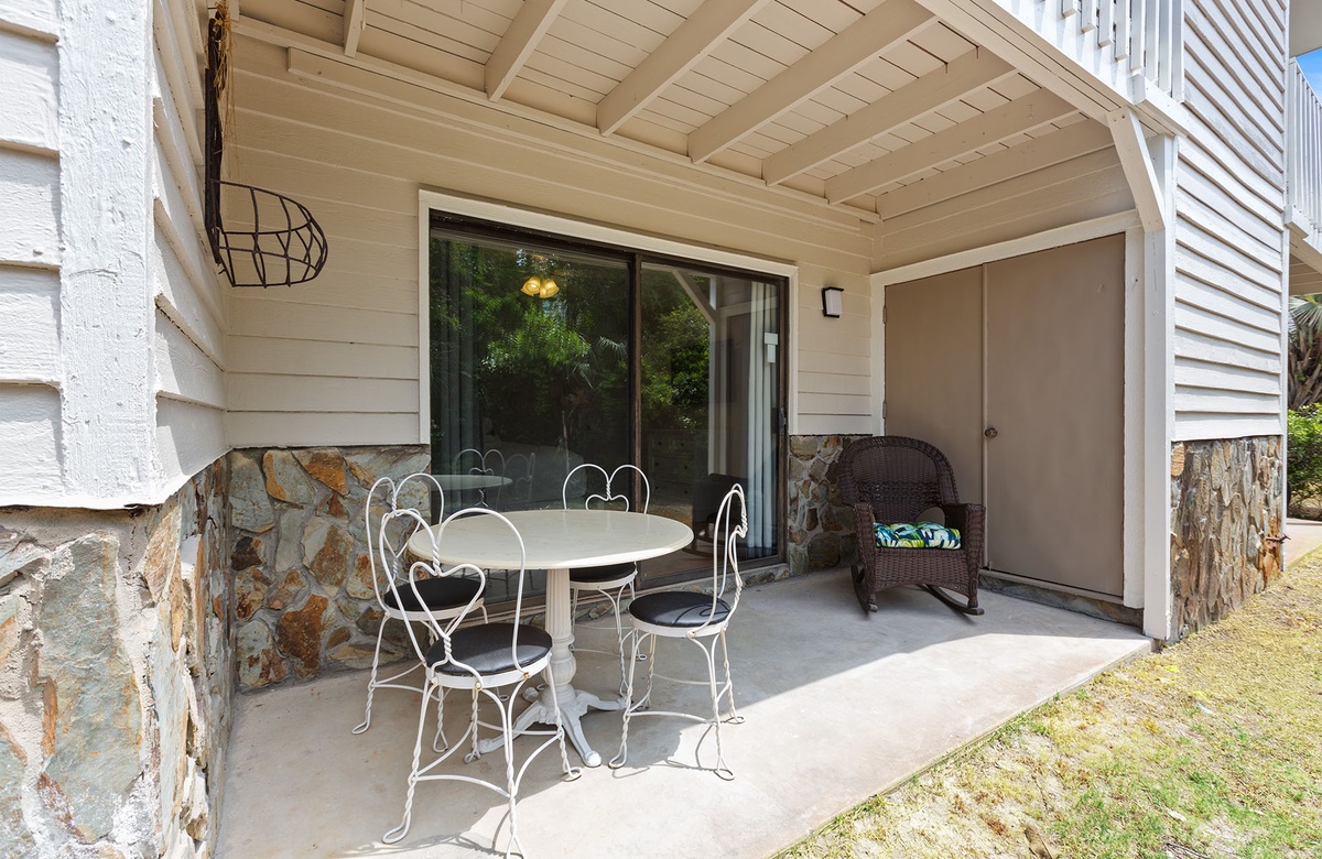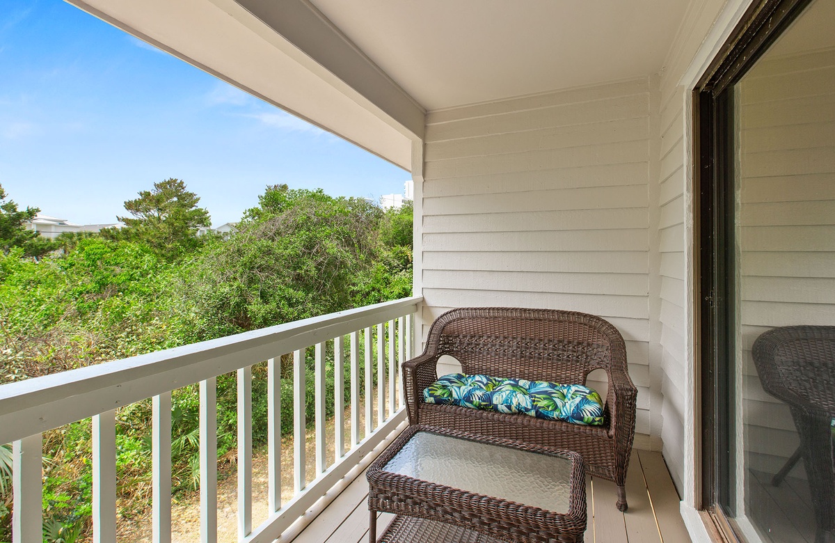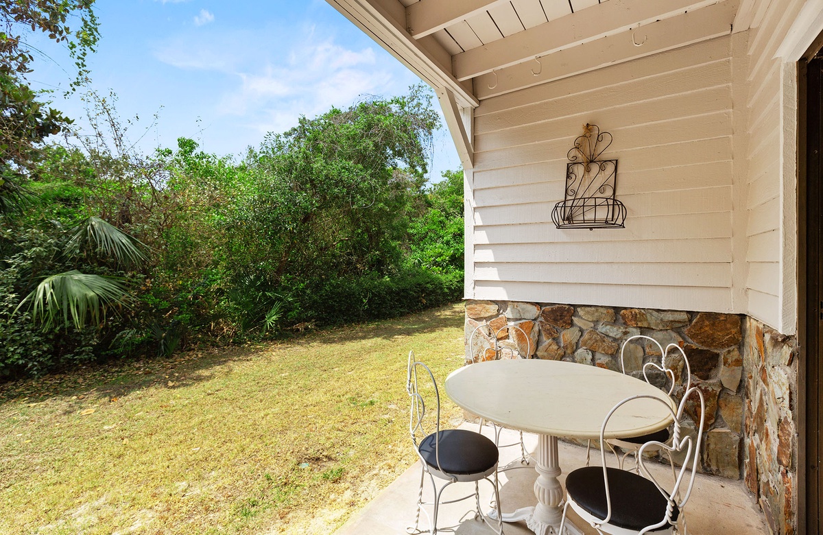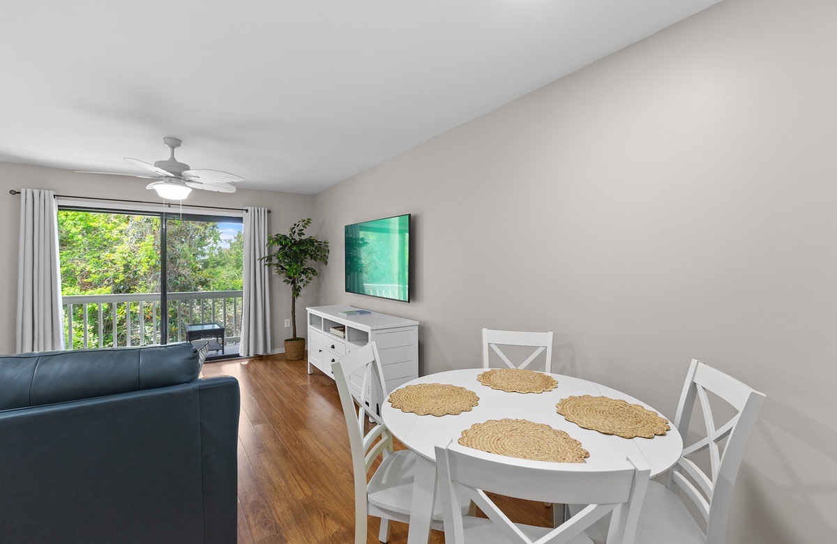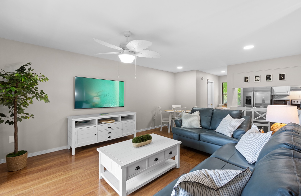 Upstairs, the open living area is warm and inviting with coastal décor, plush blue leather sofas, and a wall of windows that lead to a covered balcony overlooking the treetops. A powder room adds extra convenience. The fully equipped kitchen features white cabinetry, stainless steel appliances, and bar seating for three. A cozy dining nook with a round table and four chairs makes every meal feel like home.