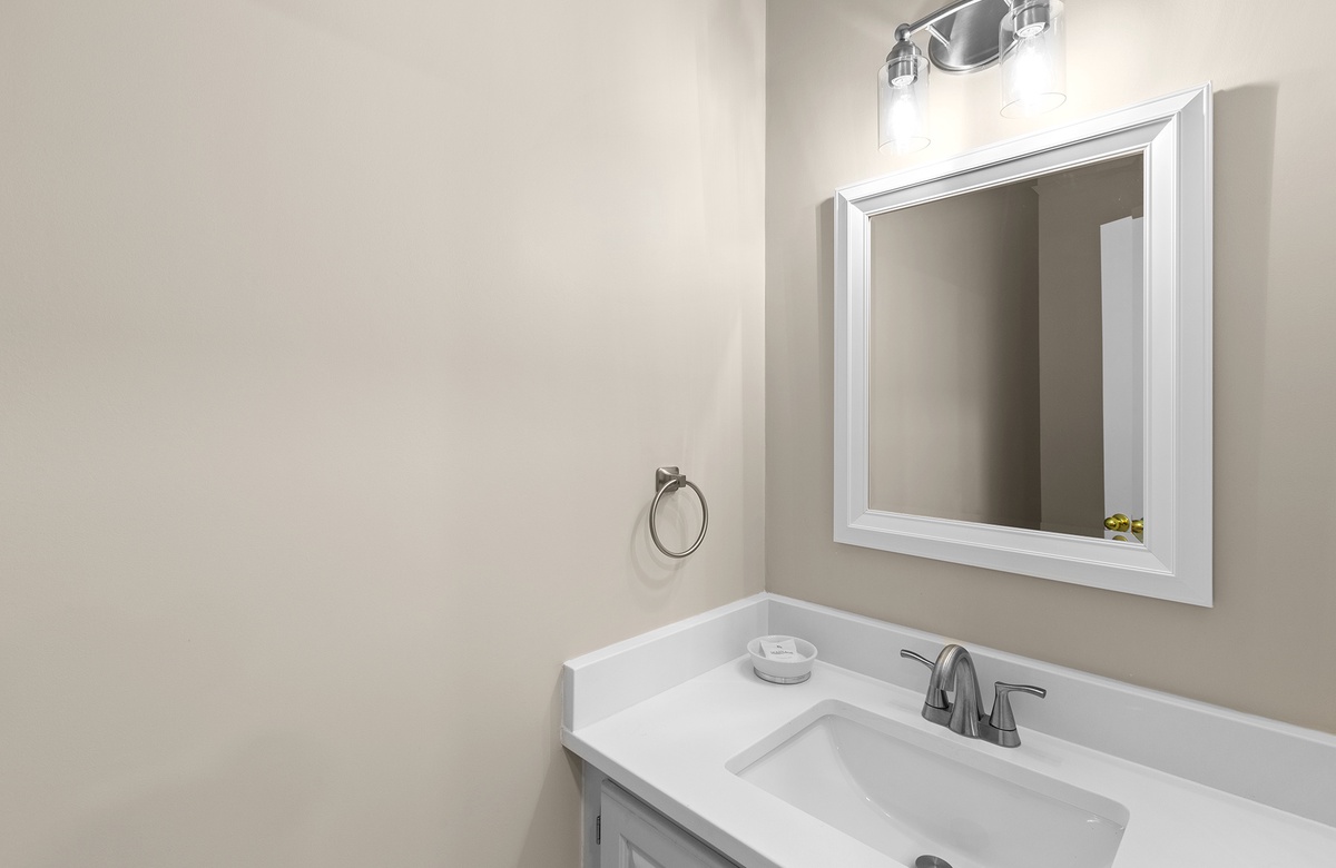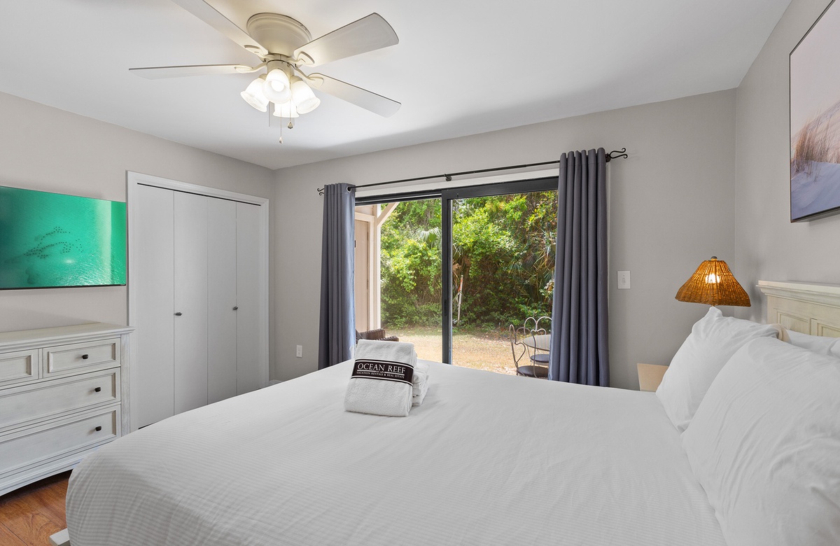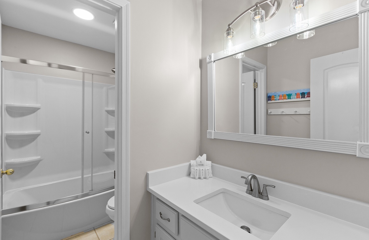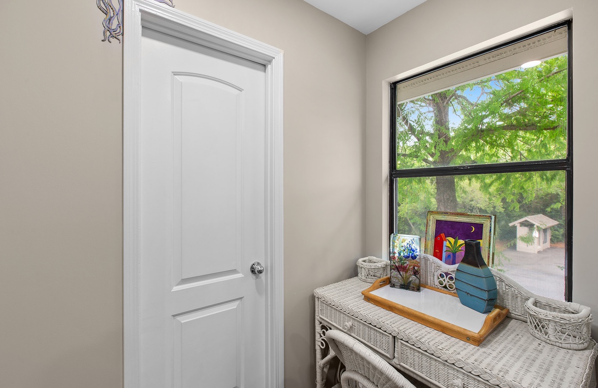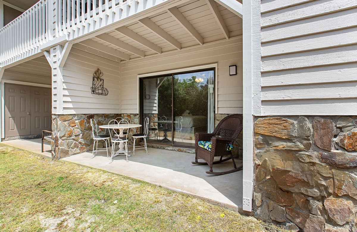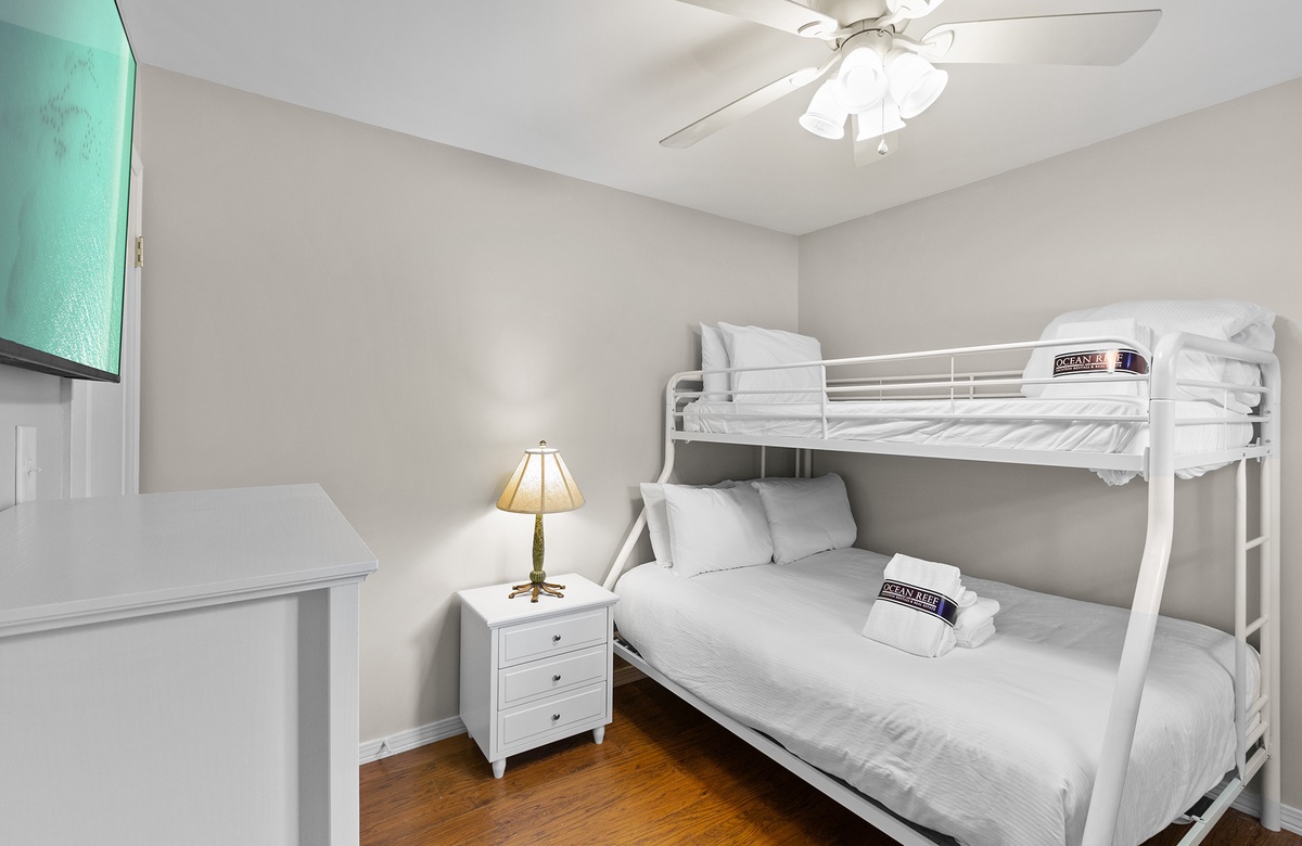 On the first floor, the primary bedroom features a queen-size bed, a wall mounted flatscreen TV, and direct access to a private patio surrounded by native greenery. The guest bedroom offers a twin-over-full bunk and its own flatscreen TV—perfect for kids or young-at-heart travelers. A shared hallway bath includes a sleek updated vanity and a tub/shower combination.