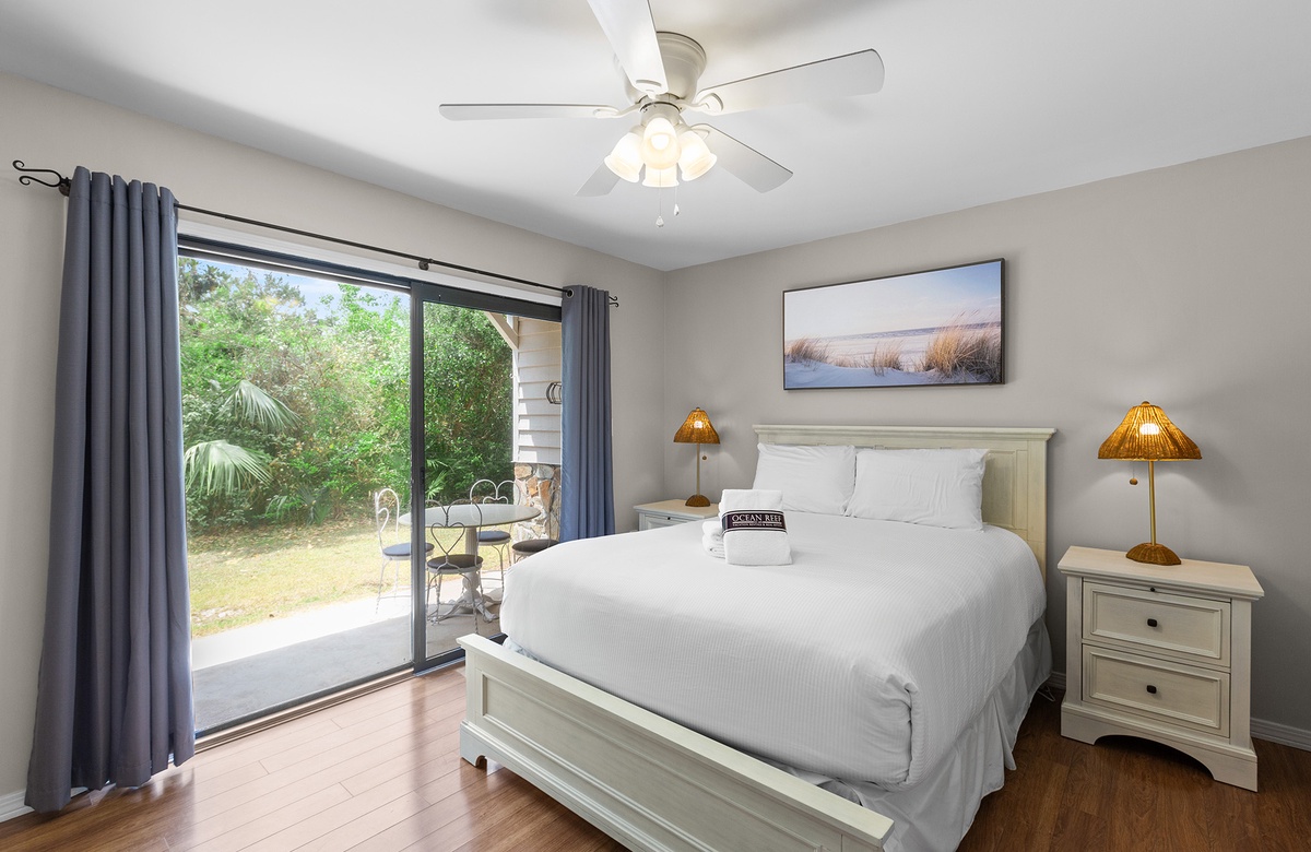 First Floor: Queen Master Bedroom with Patio Access, Bunk Room with Full/Twin Bunk, Hall Bath with Tub/Shower Combo, Exterior Laundry.