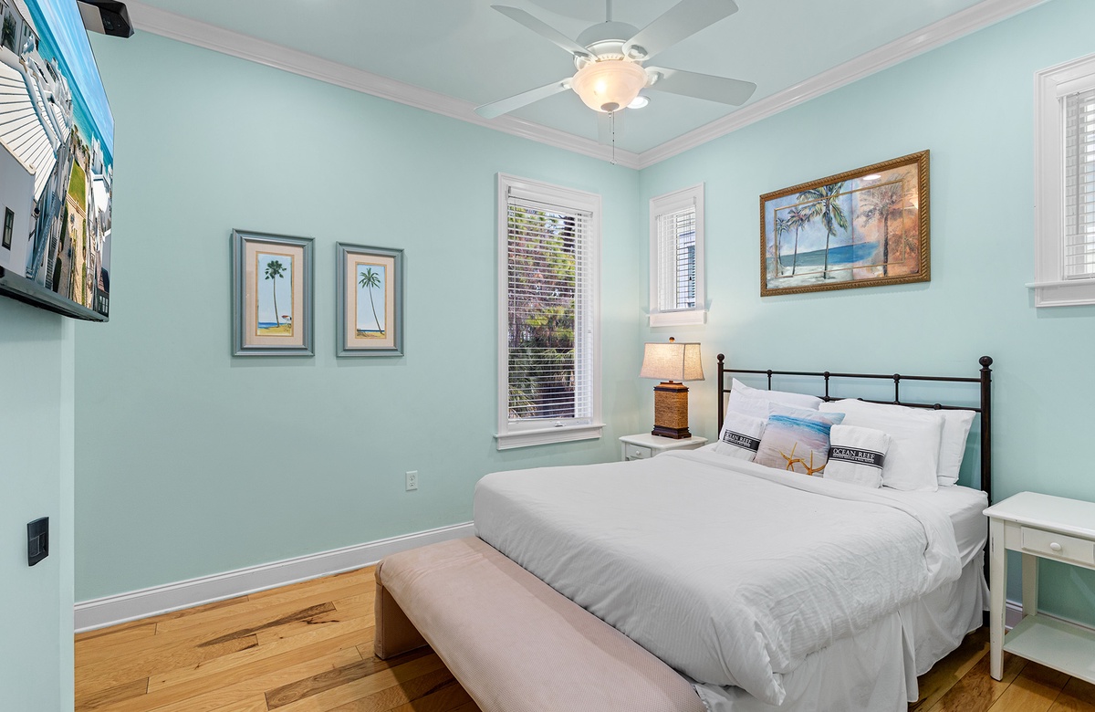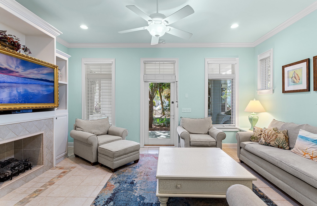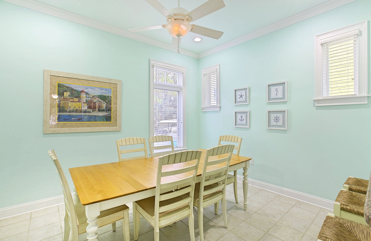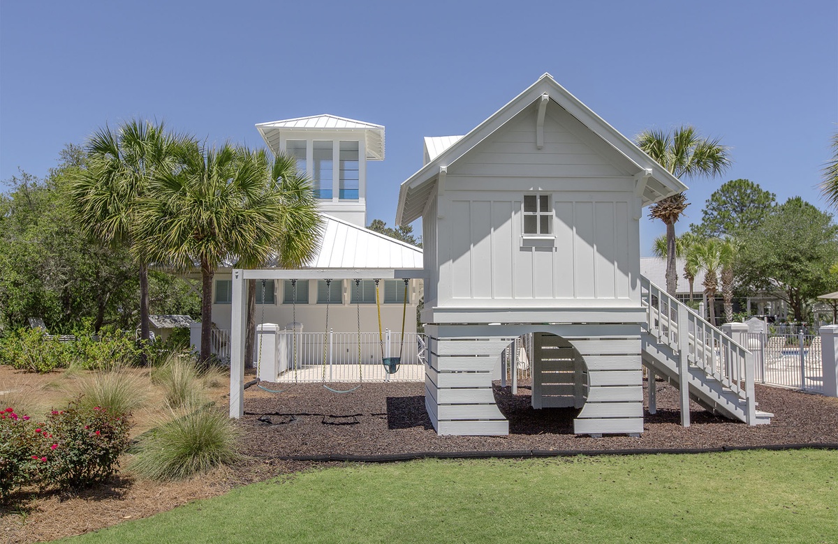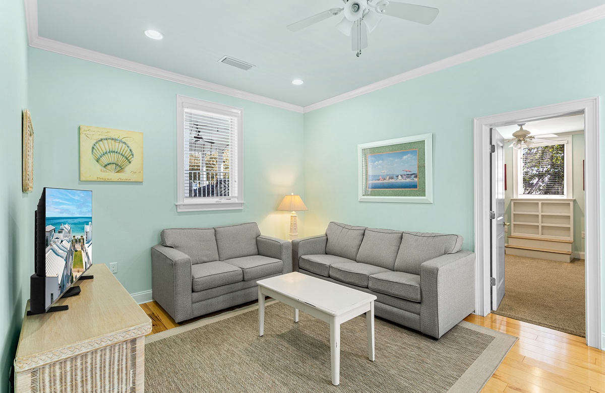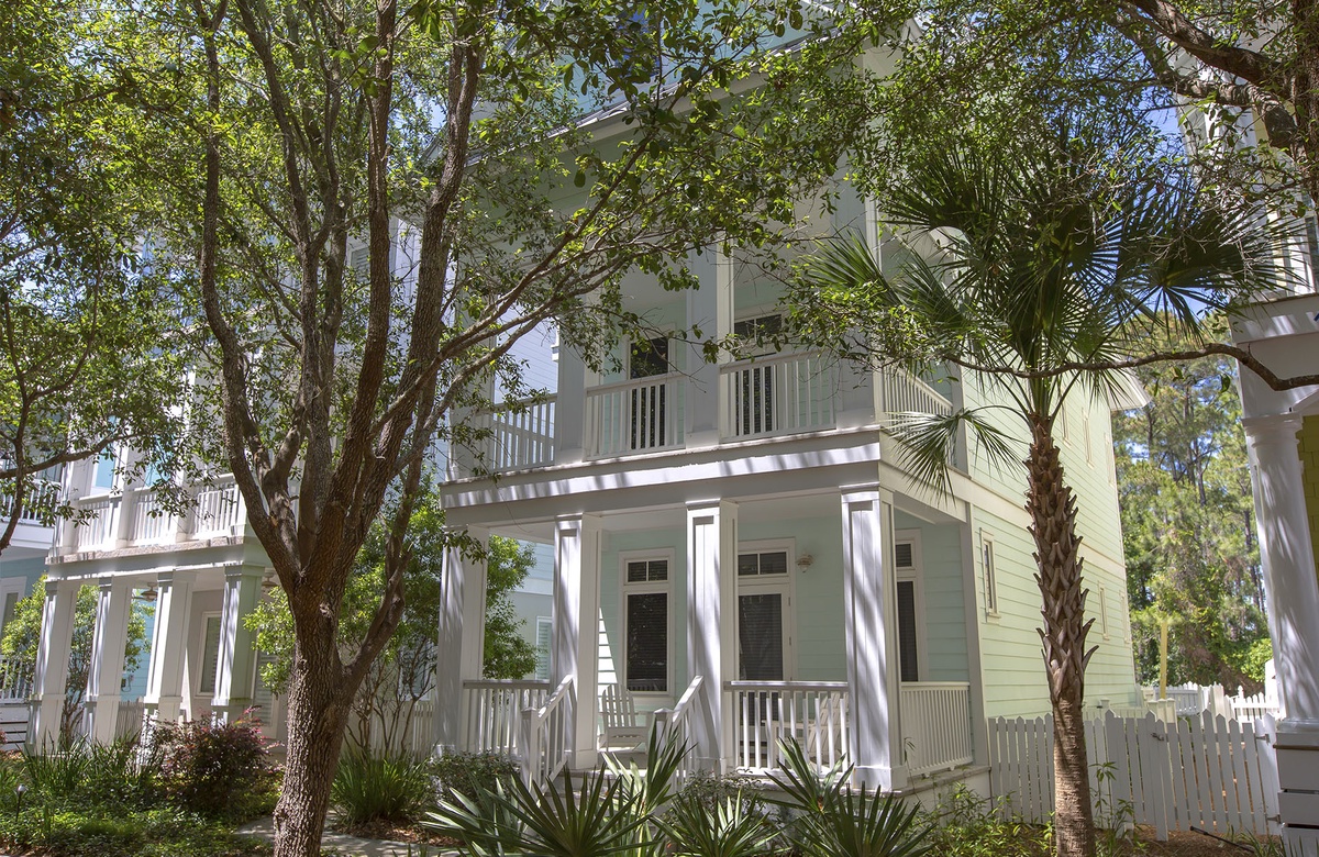 Coast Awhile is a 3 story beach cottage located in the gated community of Carillon Beach on the west end of Panama City Beach. The house has 4 bedrooms, 3 and a half bathrooms, and sleeps up to 11. The kitchen, dining room, living room, and half bath are located on the ground floor. There is a covered front porch on the ground floor which has a grill. The master bedroom and the queen guest bedroom are located on the second floor. Each has a private full bath. There are two bedrooms and a second living area on the third floor with a full shared bath. One of the bedrooms is ideal for children with three built in single beds. The other bedroom has a queen bed. There is a queen sofa sleeper in the living area. There is a TV in the living room, master, 2nd floor queen, and 3rd floor living room. Wi-Fi is included. Two designated beach chairs are provided on the beach from March 1-October 30.