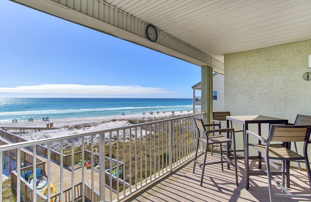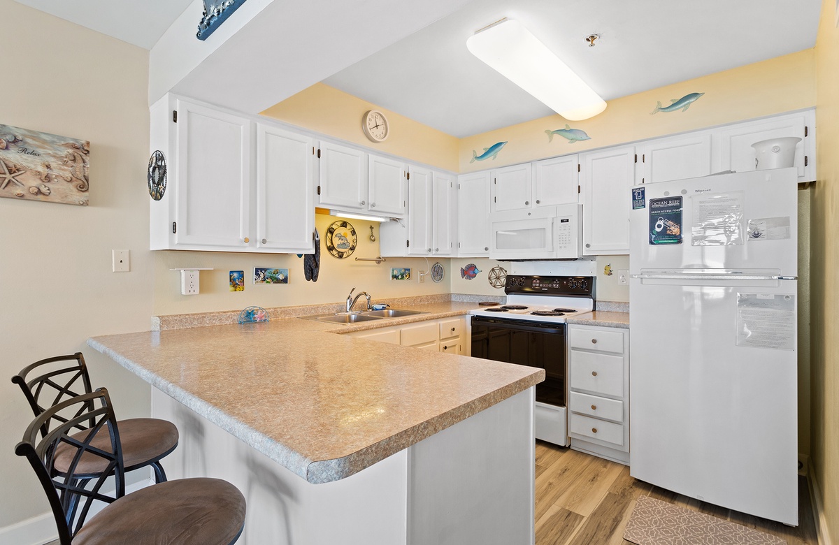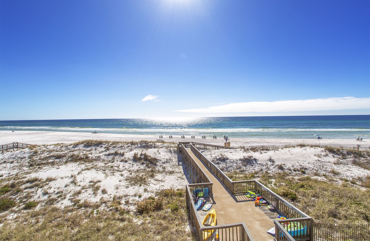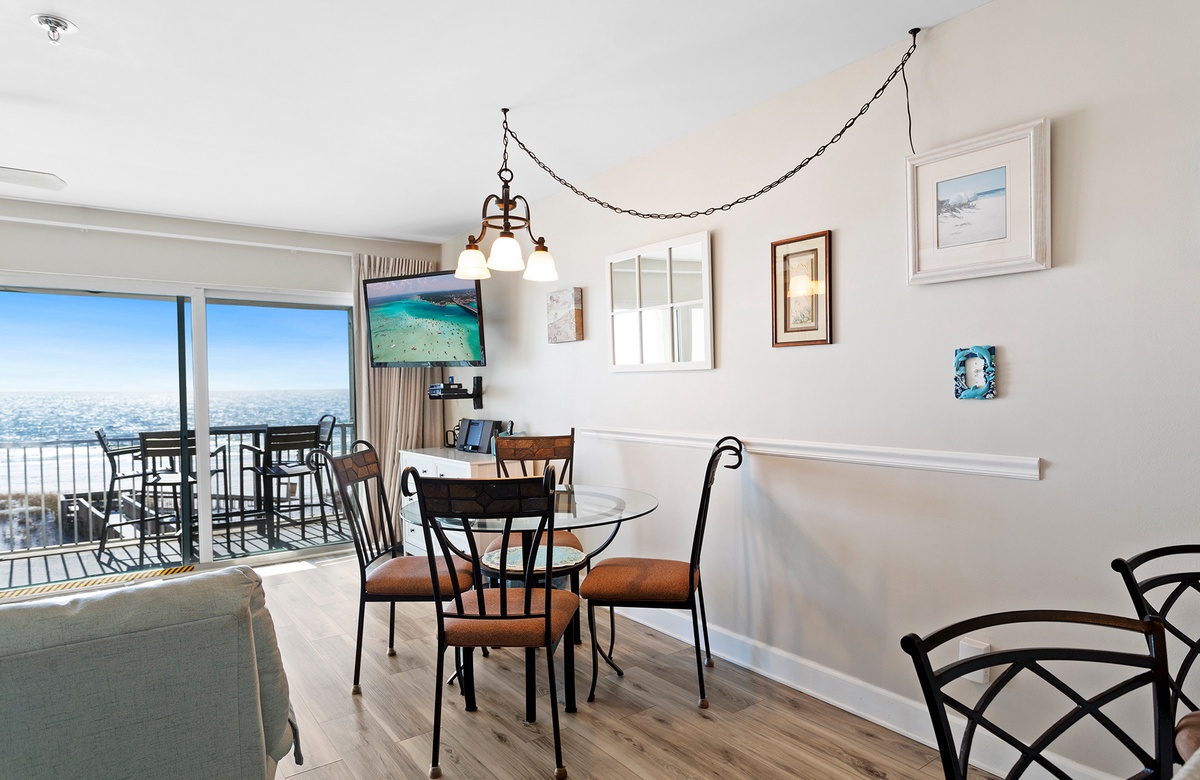 This quaint property is sure to please every member of your party with it's amazing views and secluded atmosphere. This beautiful condo which is located on the second floor offers spectacular Gulf Views from your living area as well as easy balcony access. The living area offers a wide flat screen TV and has plenty of seating for everyone. The dining area will seat 4 guests and also offers a beautiful view of the beach. The bedroom features a King Sized bed and you will find a set of bunk beds located in the hallway that leads into the living area. The kitchen features an eat in bar that will seat 2 additional guests.