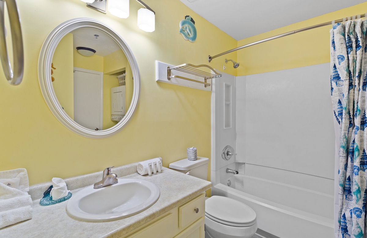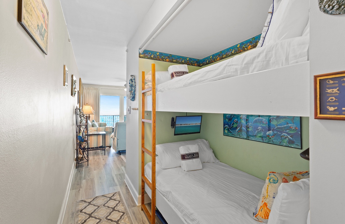 All One Level: Living Room with Queen Sleeper Sofa and Balcony Access, Kitchen, Dining, King Bedroom, Twin Bunk Nook, Hall Bath with Tub/Shower Combo and Laundry