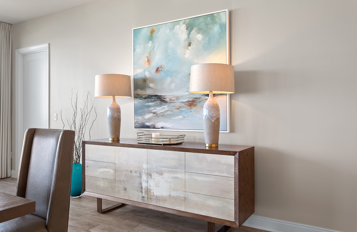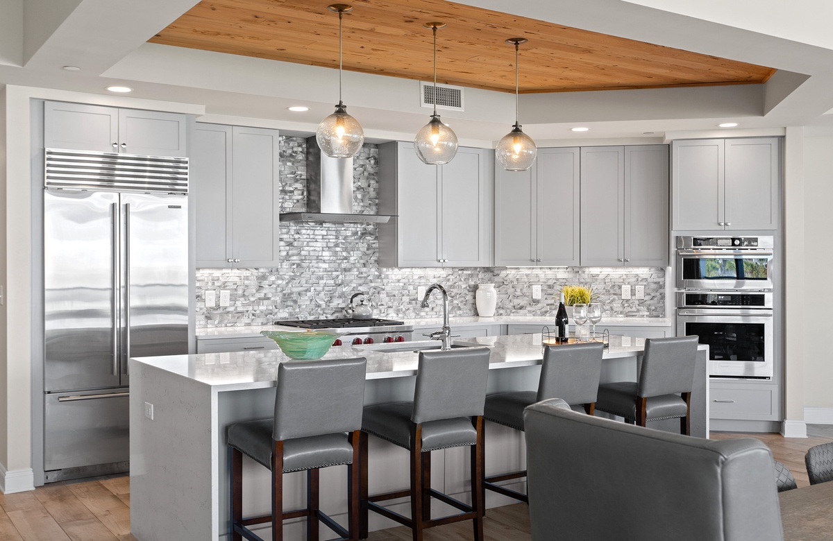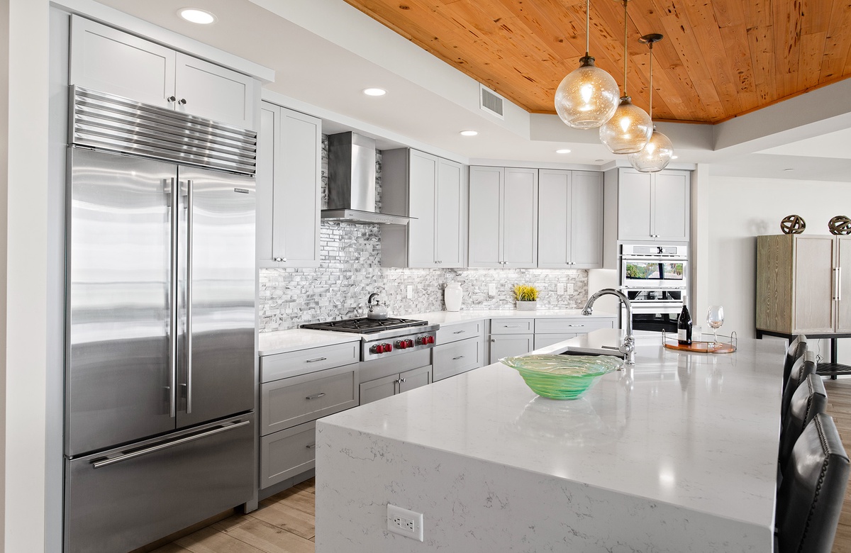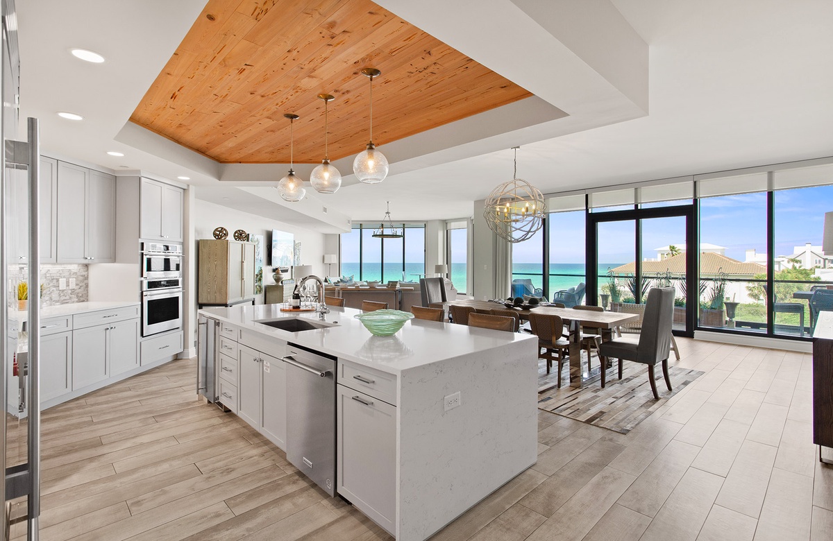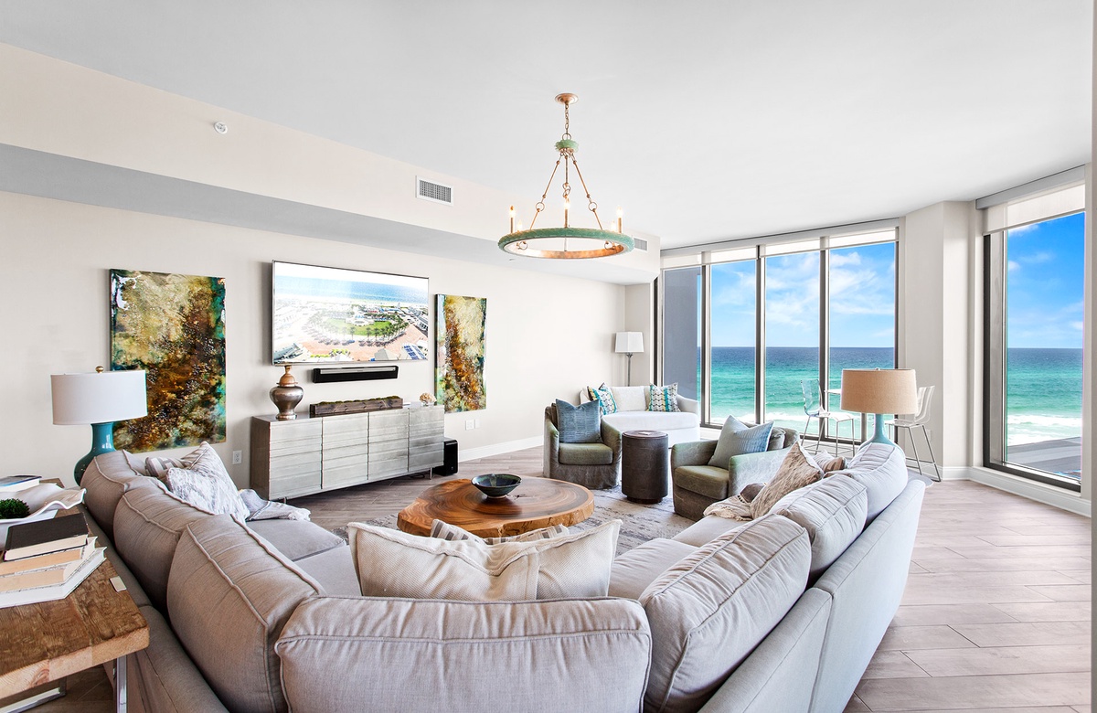 Floor-to-ceiling windows flood the open living space with natural light, while stylish furnishings, marine-inspired artwork, and cool-toned hardwood floors create a clean, coastal atmosphere. A plush sectional anchors the living area, which flows seamlessly into a dining space with seating for eight and a gourmet kitchen outfitted with quartz countertops, Sub-Zero and Wolf appliances, and a generous island with bar seating. The beachfront balcony is outfitted with cushioned seating and a shaded dining table—perfect for sunrise coffees or sunset cocktails.