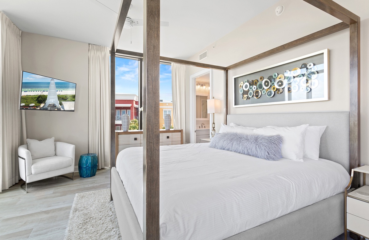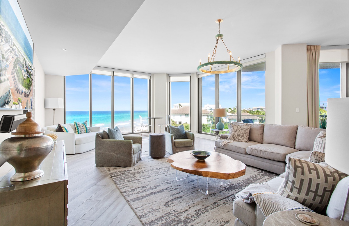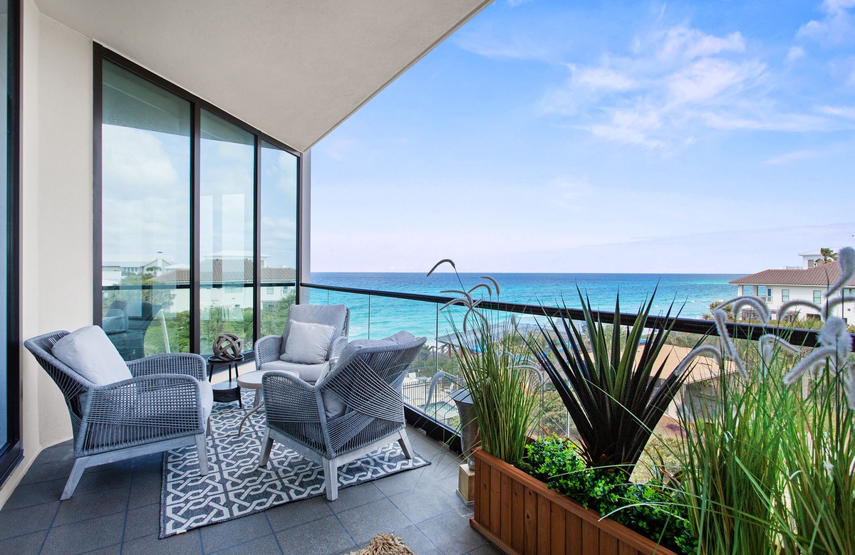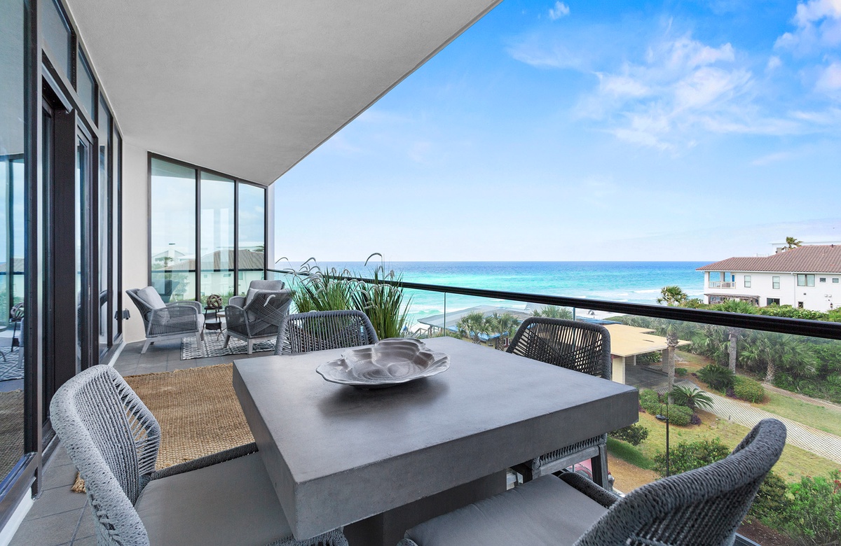 Costa Blanca 300 is a designer Gulf-front condo perched on the third floor of Santa Rosa Beach's most exclusive beachfront enclave. This upscale four-bedroom, three-bathroom rental comfortably accommodates up to eight guests and showcases sweeping views of the emerald Gulf waters from a 270-square-foot wraparound balcony.