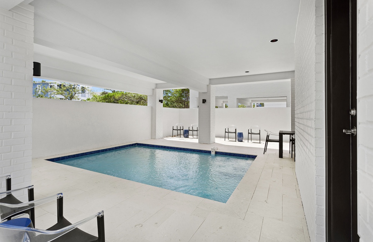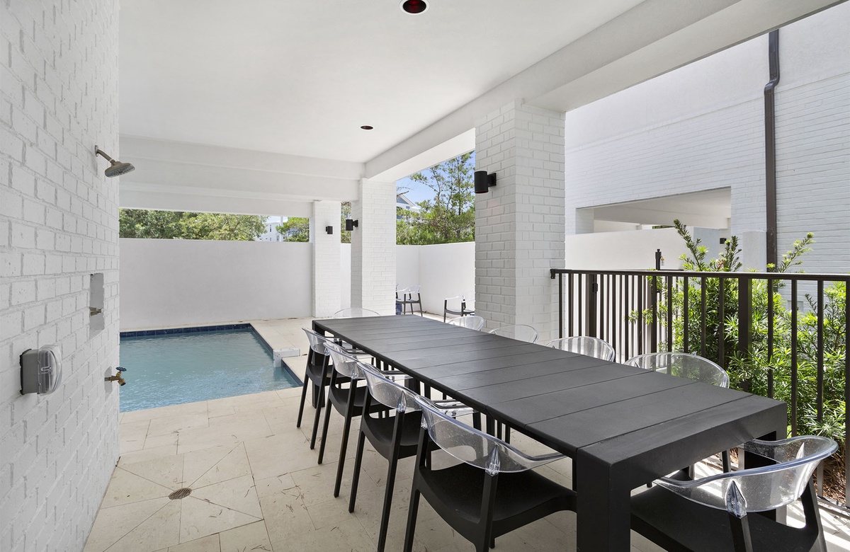 When not relaxing in the comforts of the great room, guests will love spending time at the private pool on the first floor. The pool is completely covered but with open windows to let in summer breezes. A tiled deck with lounge chairs and a gas grill surrounds the pool. It also has an outdoor table with seating for ten—perfect for a poolside surf n’ turf meal.