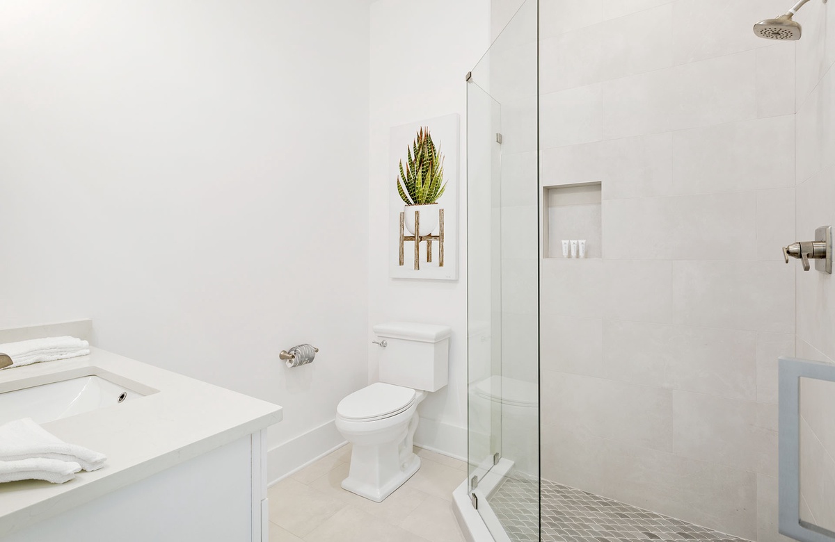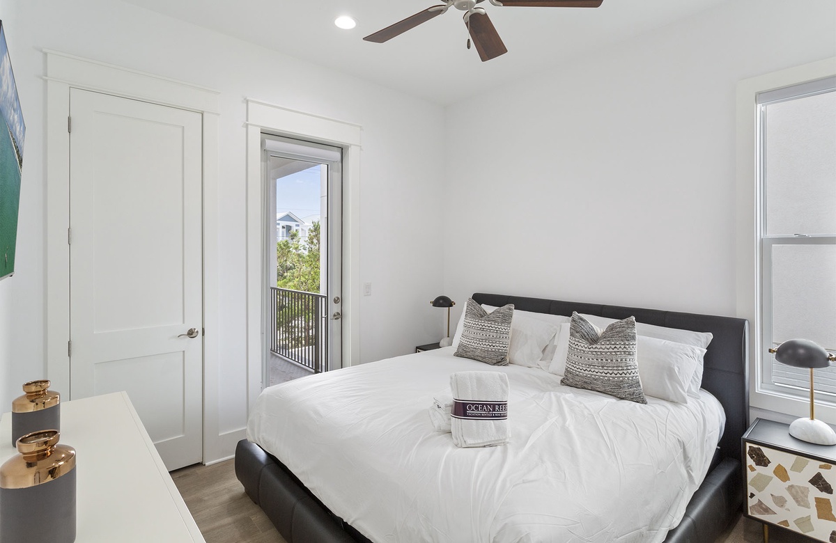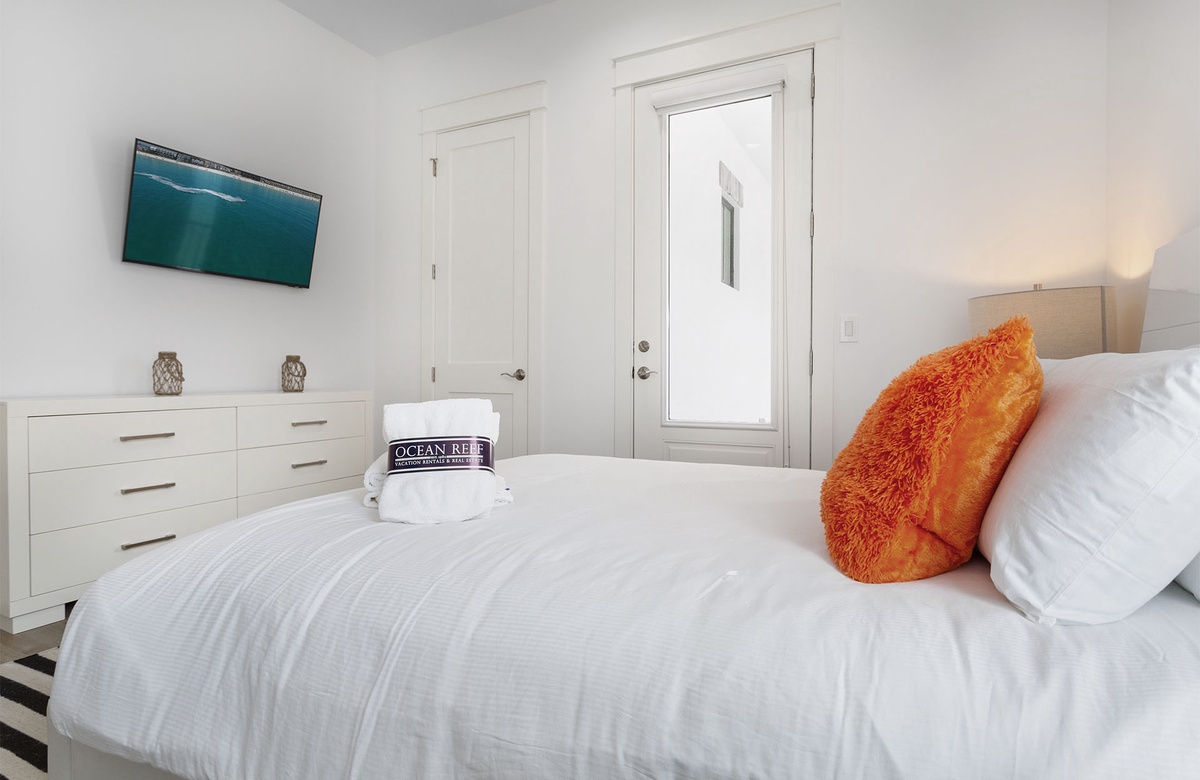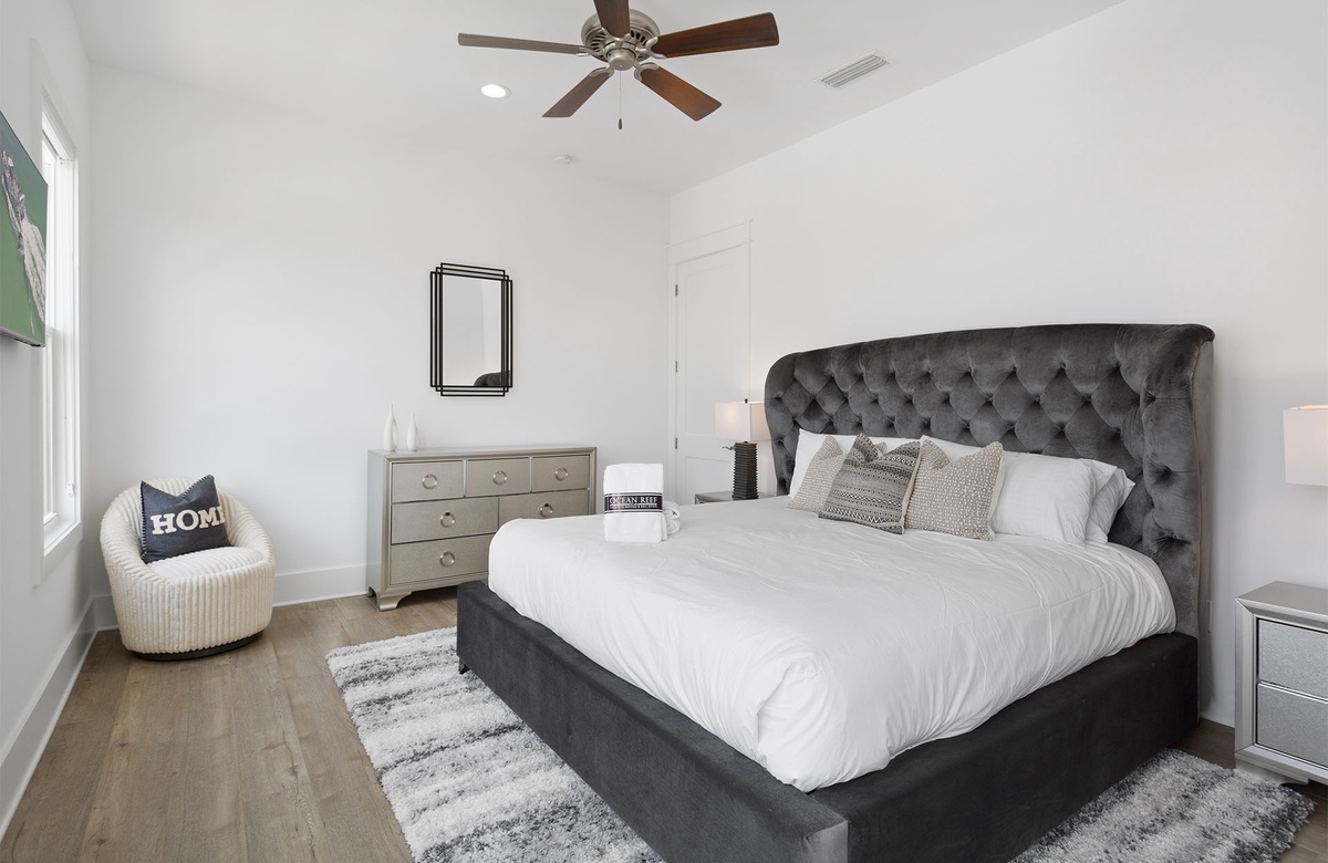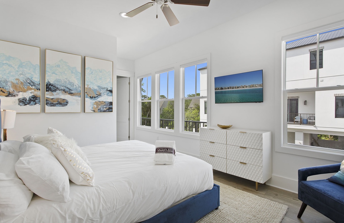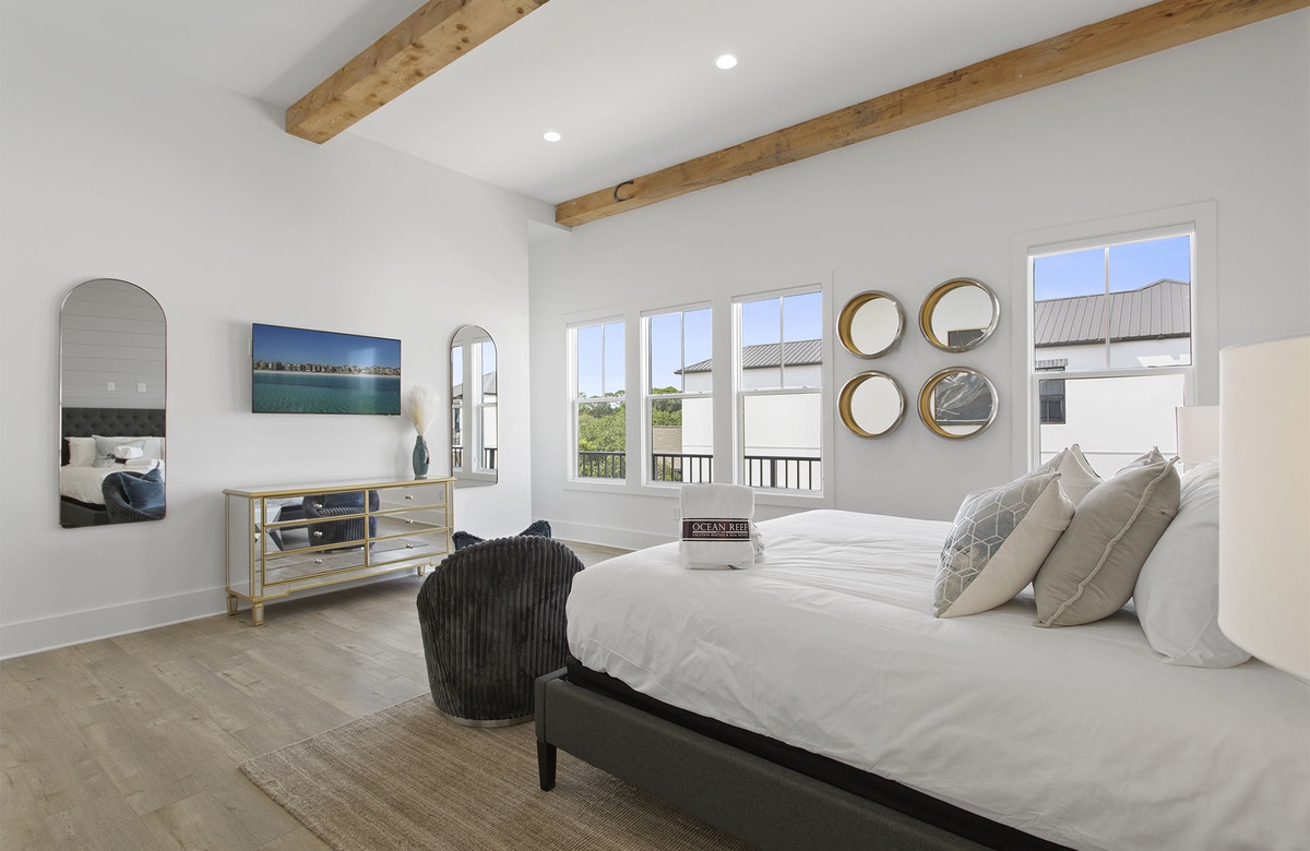 Comfortably furnished bedrooms are spread across the upper levels of the property. Three rooms are on the second floor. Each has a king-size bed, flatscreen TV, and ensuite bath with a walk-in shower. Two of these king guest bedrooms access furnished balconies. Guests will love spending time out here, enjoying the coastal weather and the company of friends and family. You will find the master suite upstairs on the third level. The sunny master suite boasts a king-size bed, high ceiling, accent chair, and a TV mounted above a mirrored credenza. Its private ensuite bath has a walk-in shower and dual vanities. The final three guest bedrooms are on the third floor. Two of these have king-size beds and balcony access, while the third has a queen-size bed.
