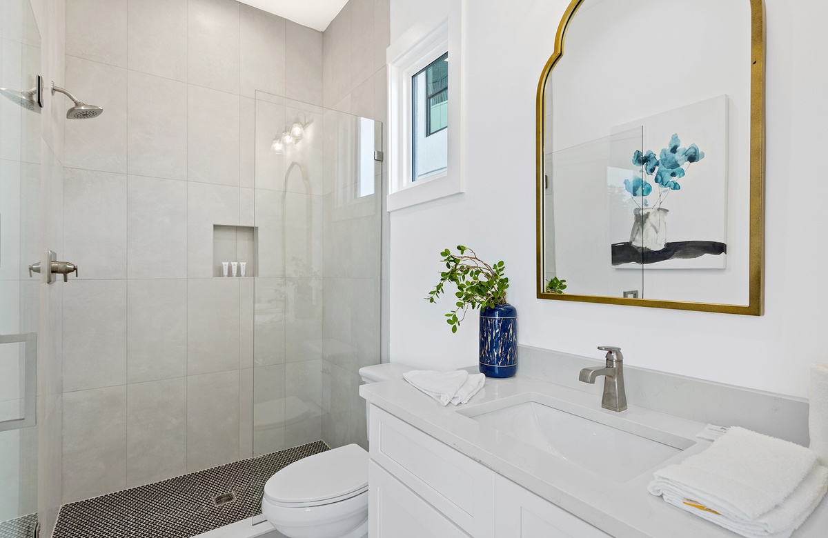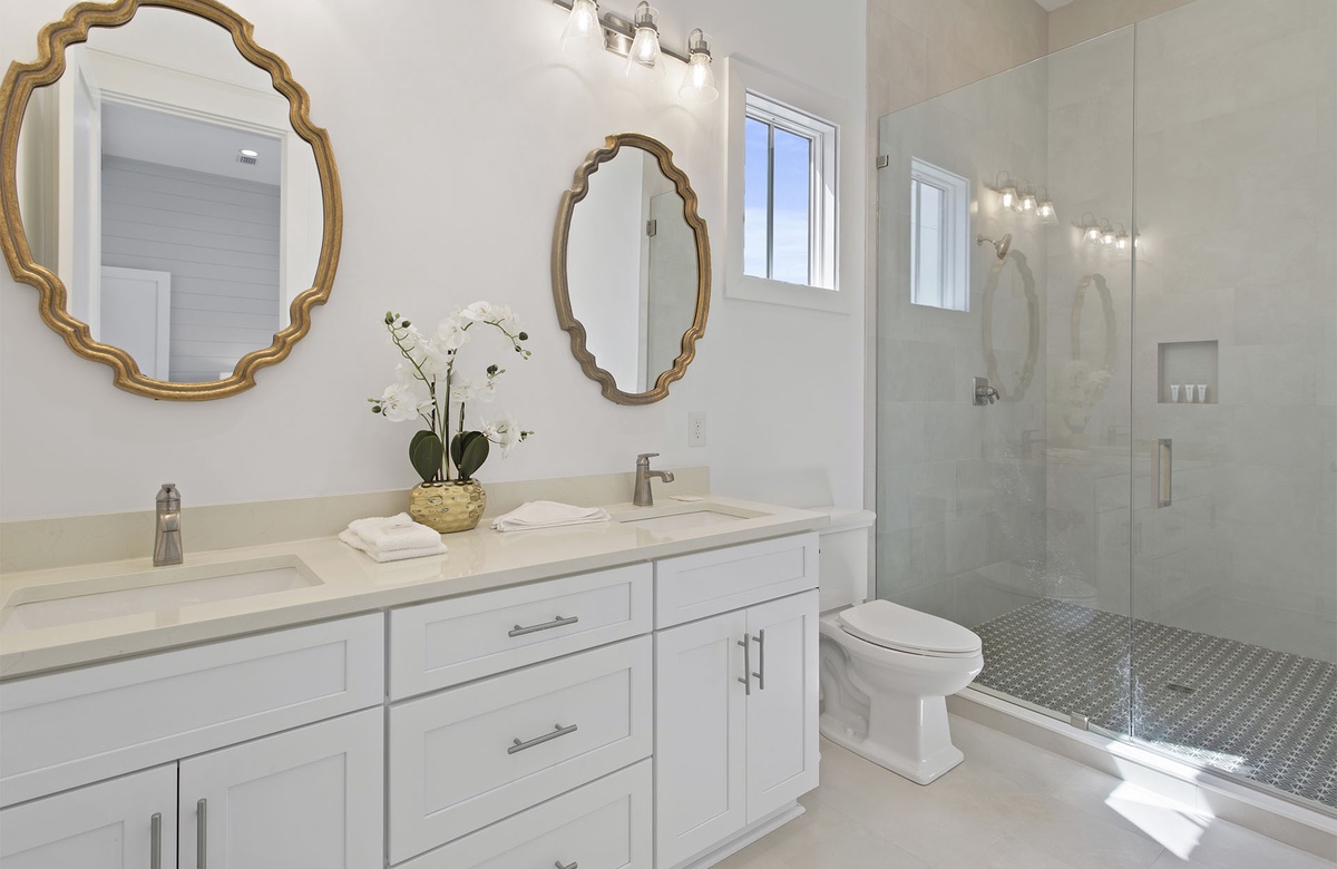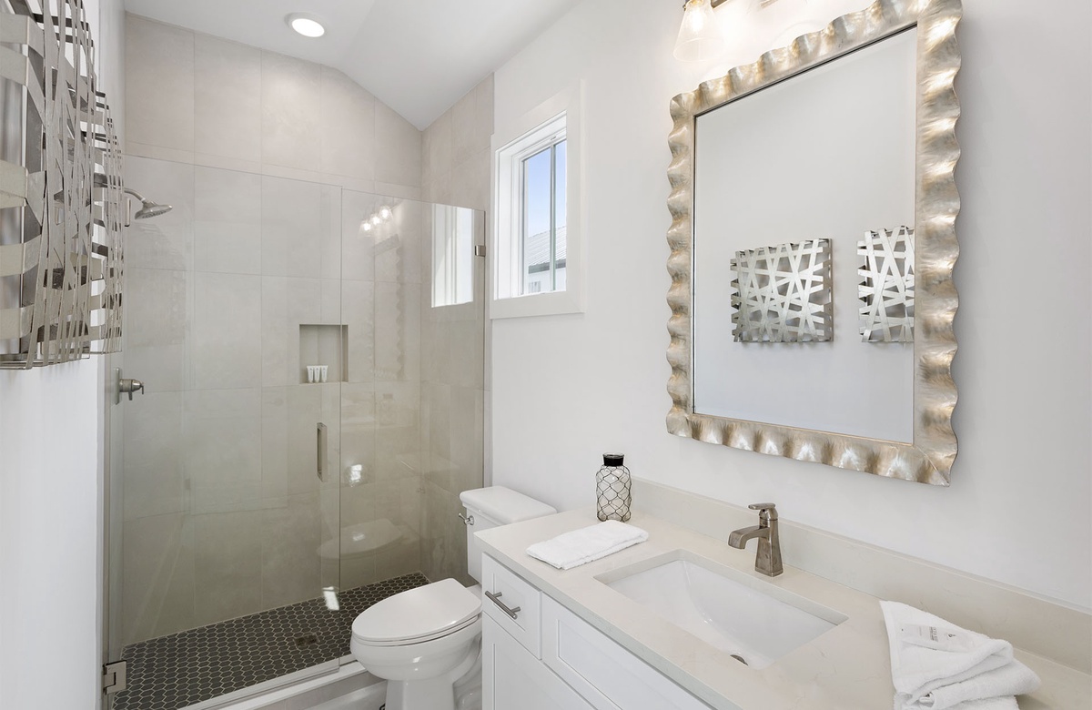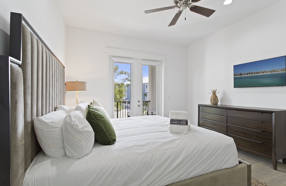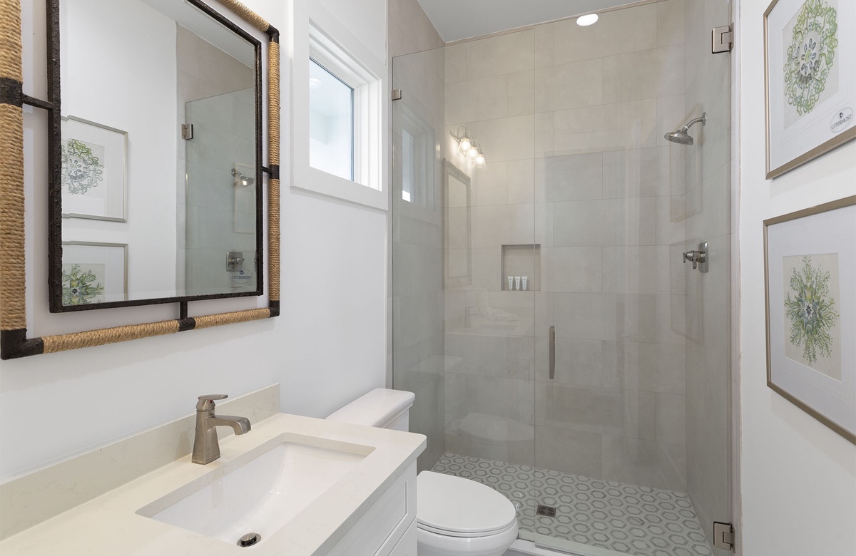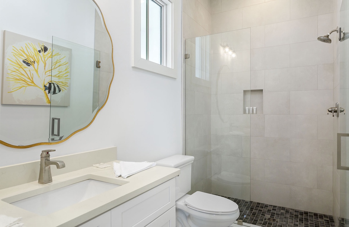 Comfortably furnished bedrooms are spread across the upper levels of the property. Three rooms are on the second floor. Each has a king-size bed, flatscreen TV, and ensuite bath with a walk-in shower. Two of these king guest bedrooms access furnished balconies. Guests will love spending time out here, enjoying the coastal weather and the company of friends and family. You will find the master suite upstairs on the third level. The sunny master suite boasts a king-size bed, high ceiling, accent chair, and a TV mounted above a mirrored credenza. Its private ensuite bath has a walk-in shower and dual vanities. The final three guest bedrooms are on the third floor. Two of these have king-size beds and balcony access, while the third has a queen-size bed.