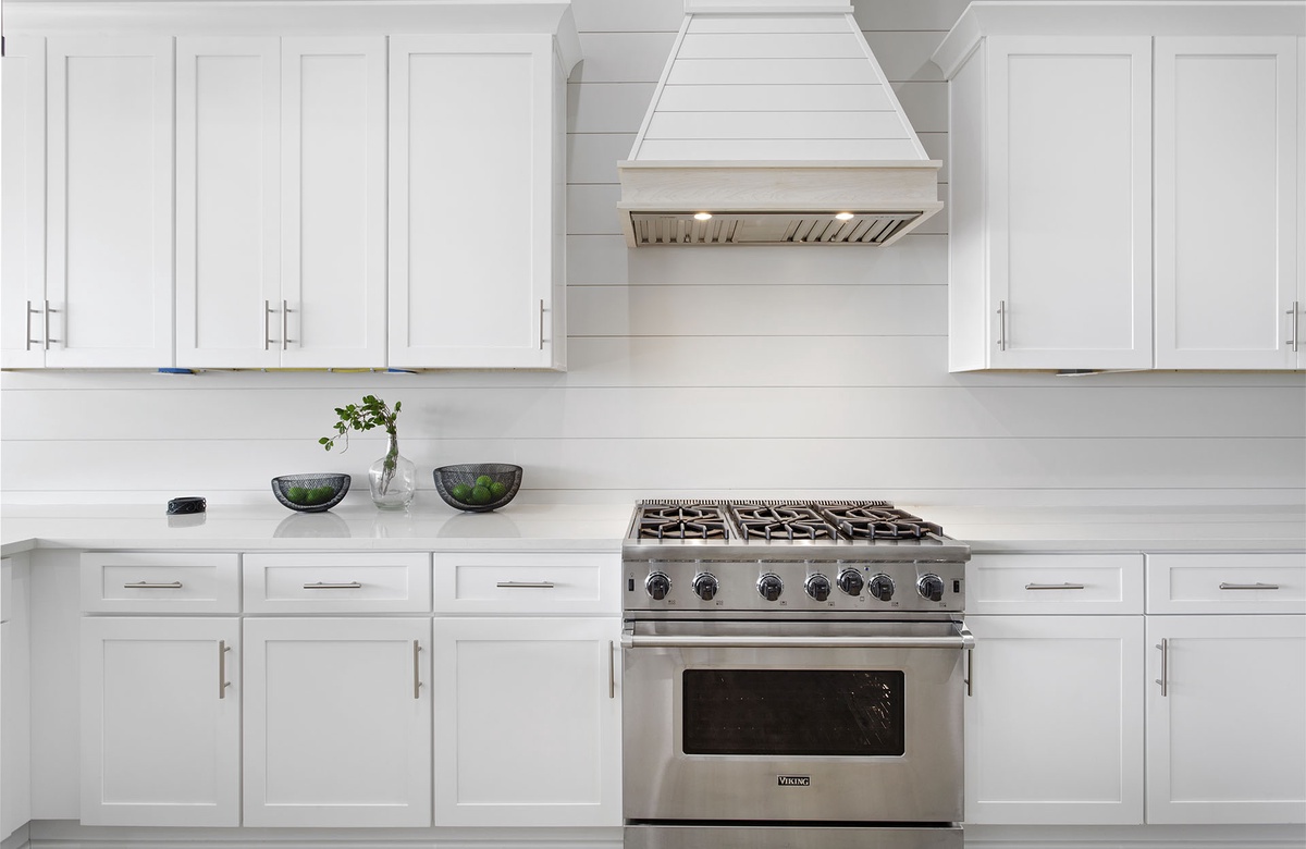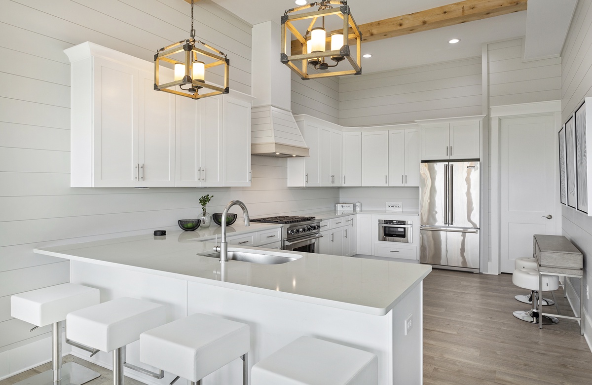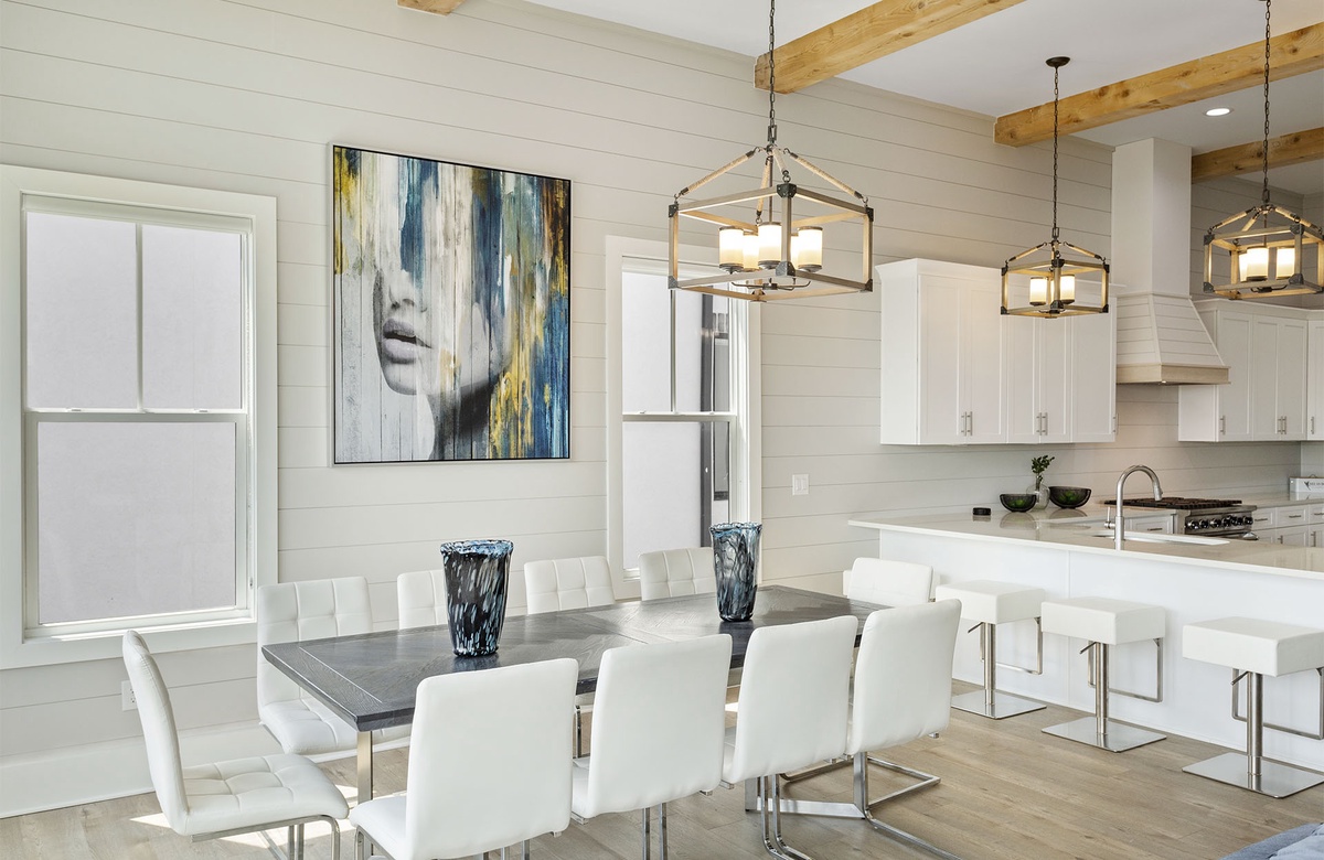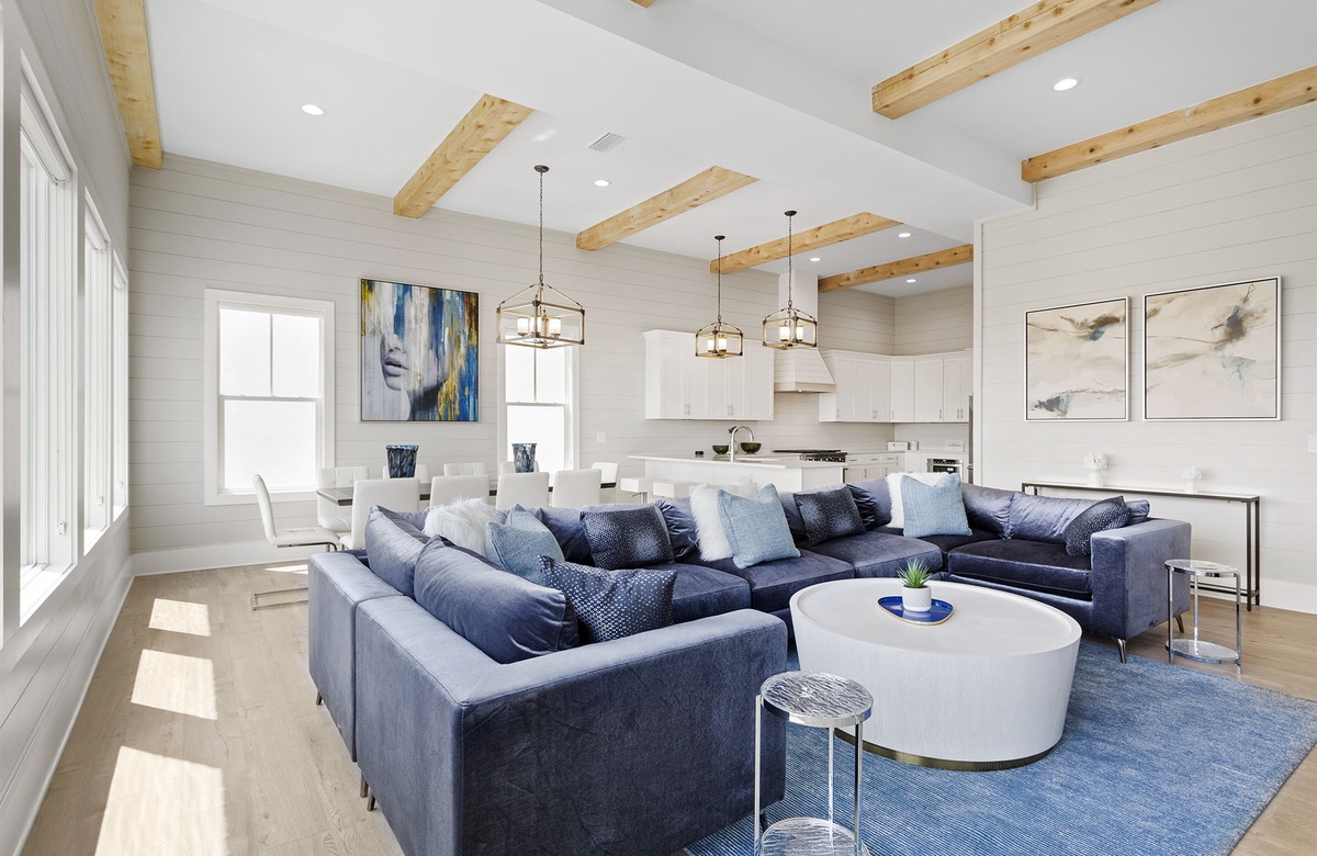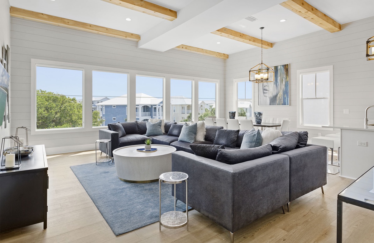 The main great room of Cypress Sunset is located on the third floor. This open concept room includes spacious living, kitchen, and dining areas. Large windows on two walls filter in ample Florida sunshine, creating a light and welcoming atmosphere for beachgoers. Shiplap walls, natural wood beams, industrial-styled light fixtures, chic furnishings, and contemporary art radiate a feeling of modern luxury. A royal-blue wraparound couch dominates the living room with varying shades of blue and white accent pillows. The couch is centered on a blue rug, with a fashionable white drink table at its center. Two metal end tables flank the couch. The setup faces a flatscreen TV. Behind the living area, a long table and ten white chairs make up the dining room. Pale wood flooring extends into the state-of-the-art kitchen that overlooks the dining area. The kitchen features gleaming white countertops, spacious counters, and stainless steel appliances. It also has a mini dinette with two short stools. Four square stools at the kitchen’s breakfast bar provide additional seating and a casual place for daytime dining.