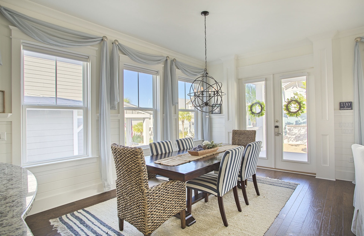 Upon arrival, guests are greeted with a paver drive flanked by palm trees and a charming front porch. When inside, the first-floor great room will immediately put you in a vacation state of mind. The room’s partial shiplap walls, white furnishings with blue accents, handsome dark flooring, and ample sunlight give off a beachy flair. The living room features a cozy setup consisting of a plush white sofa, two striped armchairs, and a chic accent chair. The seating ensemble centers around a wicker rug and faces a wall-mounted flatscreen TV. Nearby, a formal dining area includes a hardwood table surrounded by a combo of wicker and nautically striped chairs, all seated beneath a minimalist chandelier. An open kitchen is on the other side of the dining room. The kitchen boasts custom white cabinetry, spacious countertops, stainless-steel appliances, and a large bar with stool seating. Just past the kitchen, a glass door opens onto a screened porch with outdoor furnishings.
