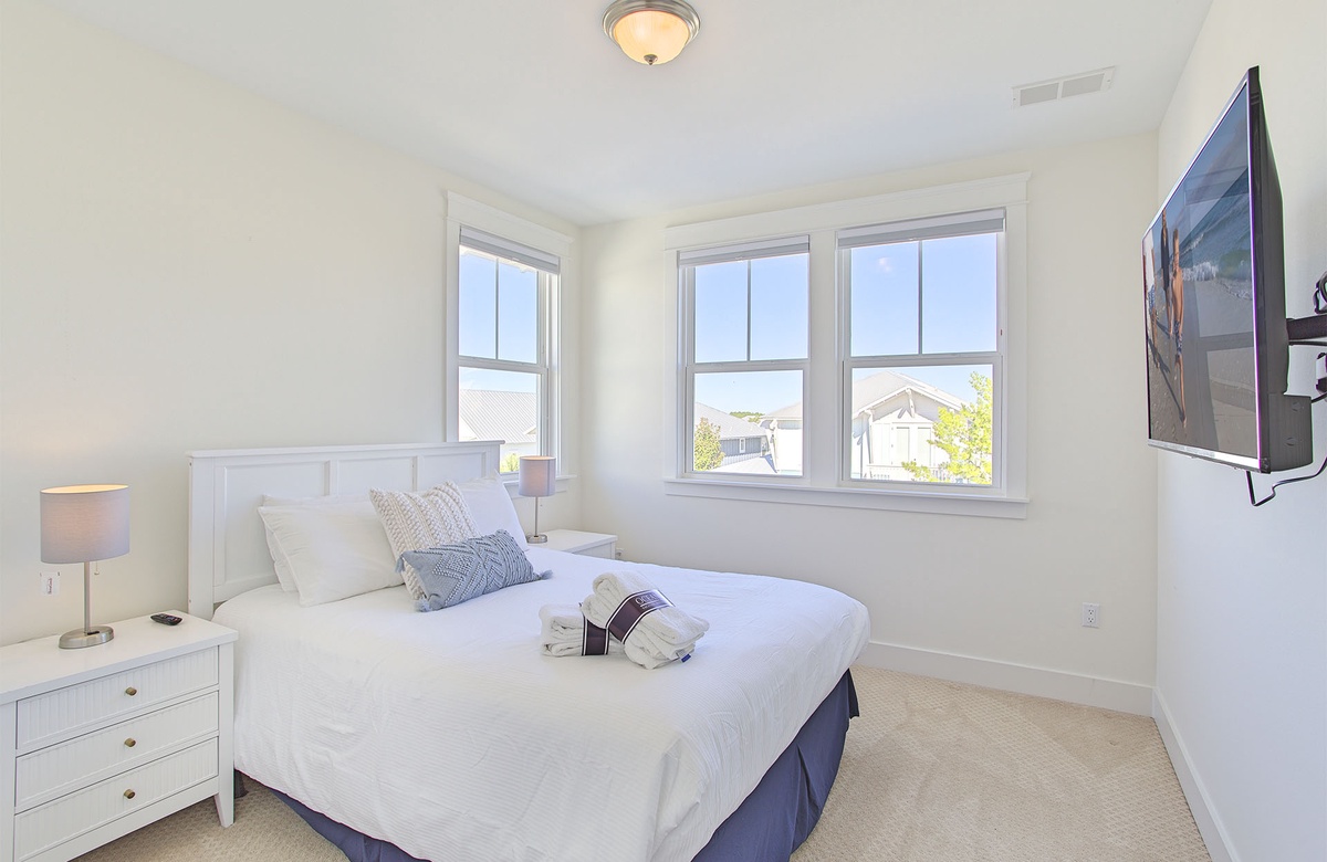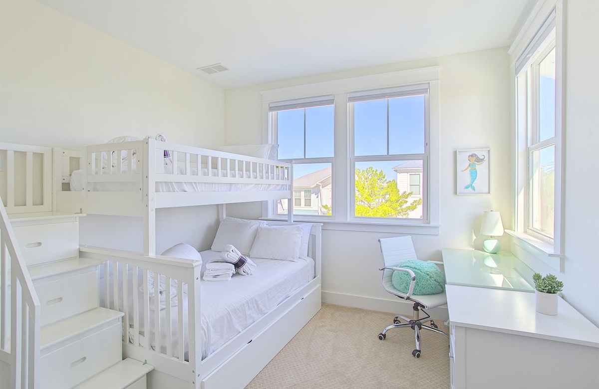 The great room shares the first level with a lovely master bedroom. In the master bedroom, you will find a king-size bed, upholstered headboard, fluffy cream-colored rug, sunny windows, a TV, and an en-suite bath with a glass-walled shower. The remaining bedrooms are upstairs on the second floor. One guest bedroom has a king-size bed, white dresser, and wall-mounted TV. Another guest bedroom has a queen-size bed. The final bedroom includes a twin-over-full bunk and a dedicated workspace with a desk and chair.