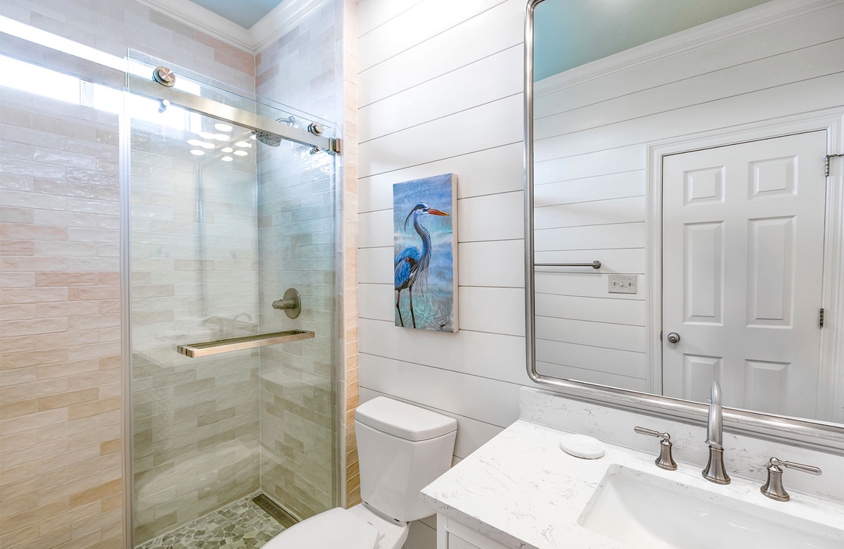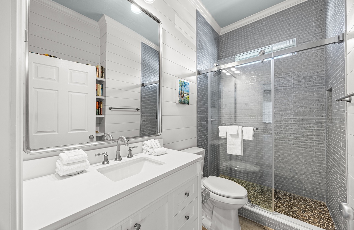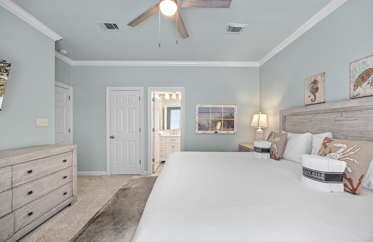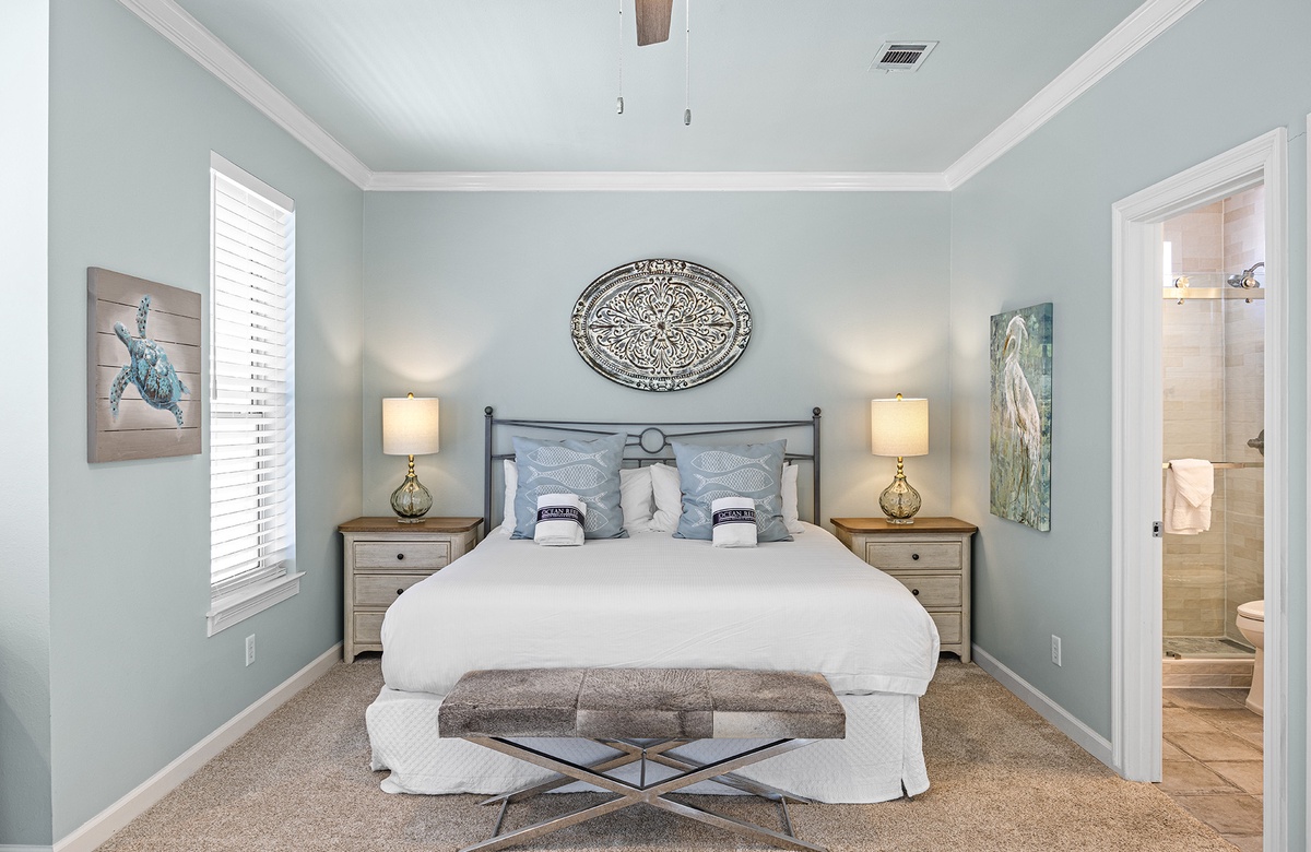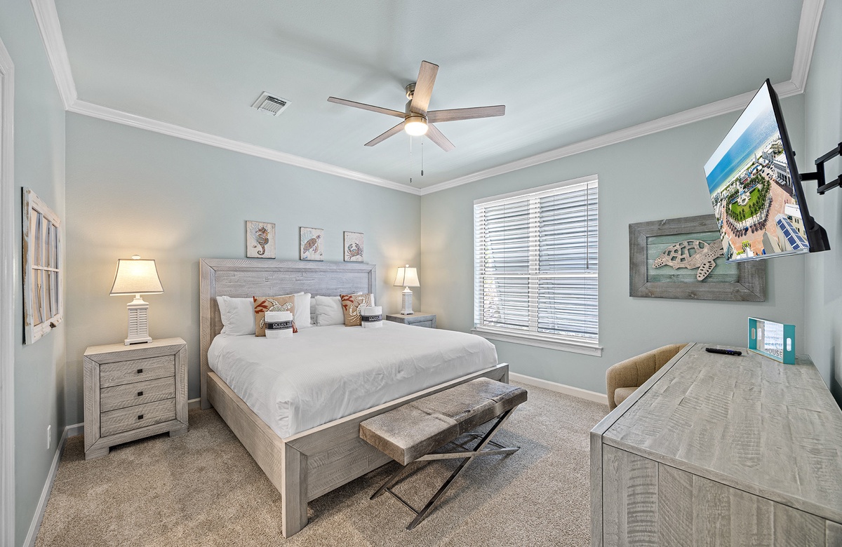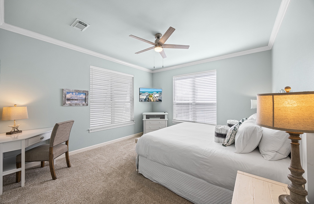 - King bedroom with smart TV, private bathroom with walk-in shower