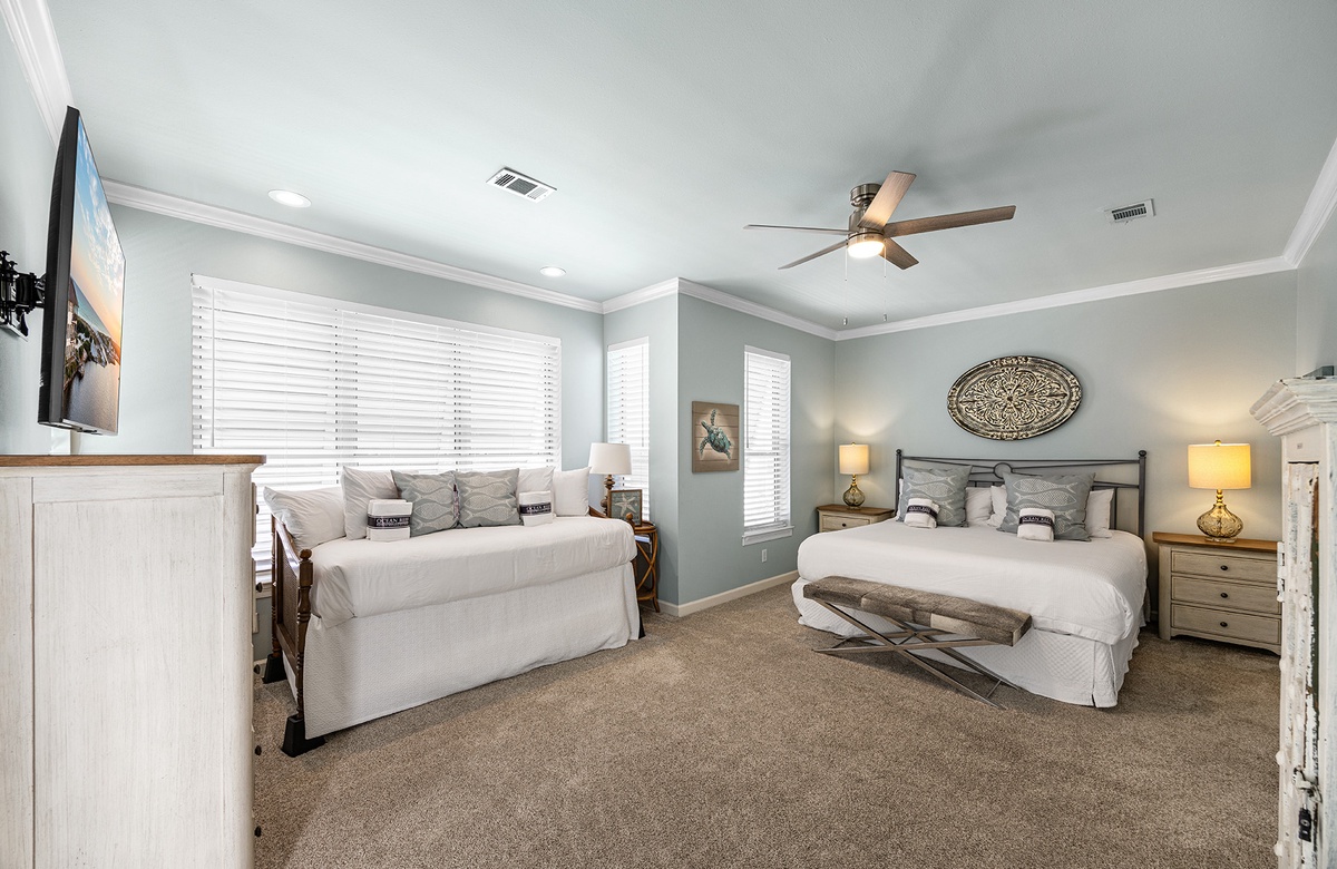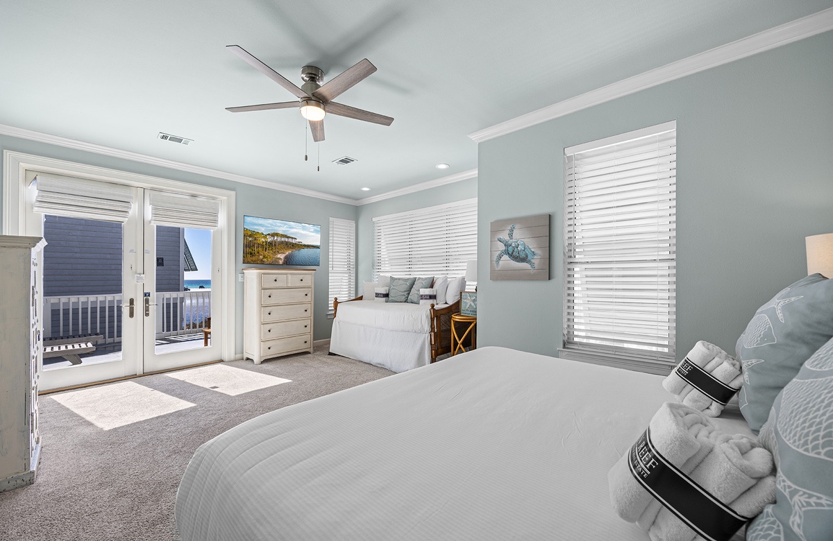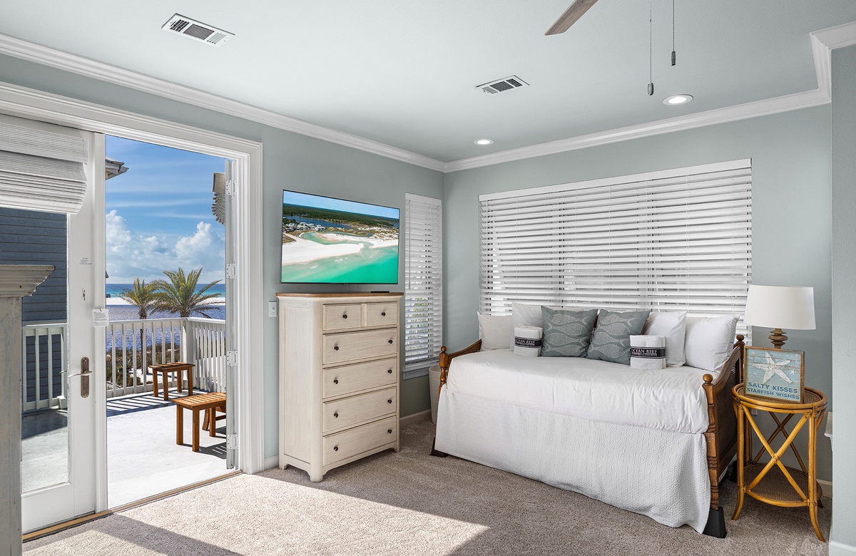 - King bedroom with daybed/trundle, smart TV and private bathroom with walk-in shower, deck access