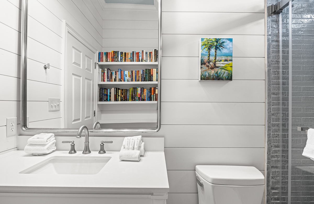 A guest bedroom on the main level includes both a queen and a full bed and is conveniently located near a hall bath with a glass walk-in shower, offering comfortable accommodations for guests who prefer to avoid stairs. Upstairs, three additional bedrooms each feature king beds and private baths for added privacy. The spacious primary suite includes a twin daybed with a twin trundle and opens through French doors onto the balcony, where you can enjoy Gulf breezes and scenic views morning or evening. A conveniently located laundry room on the second floor adds ease for longer stays.