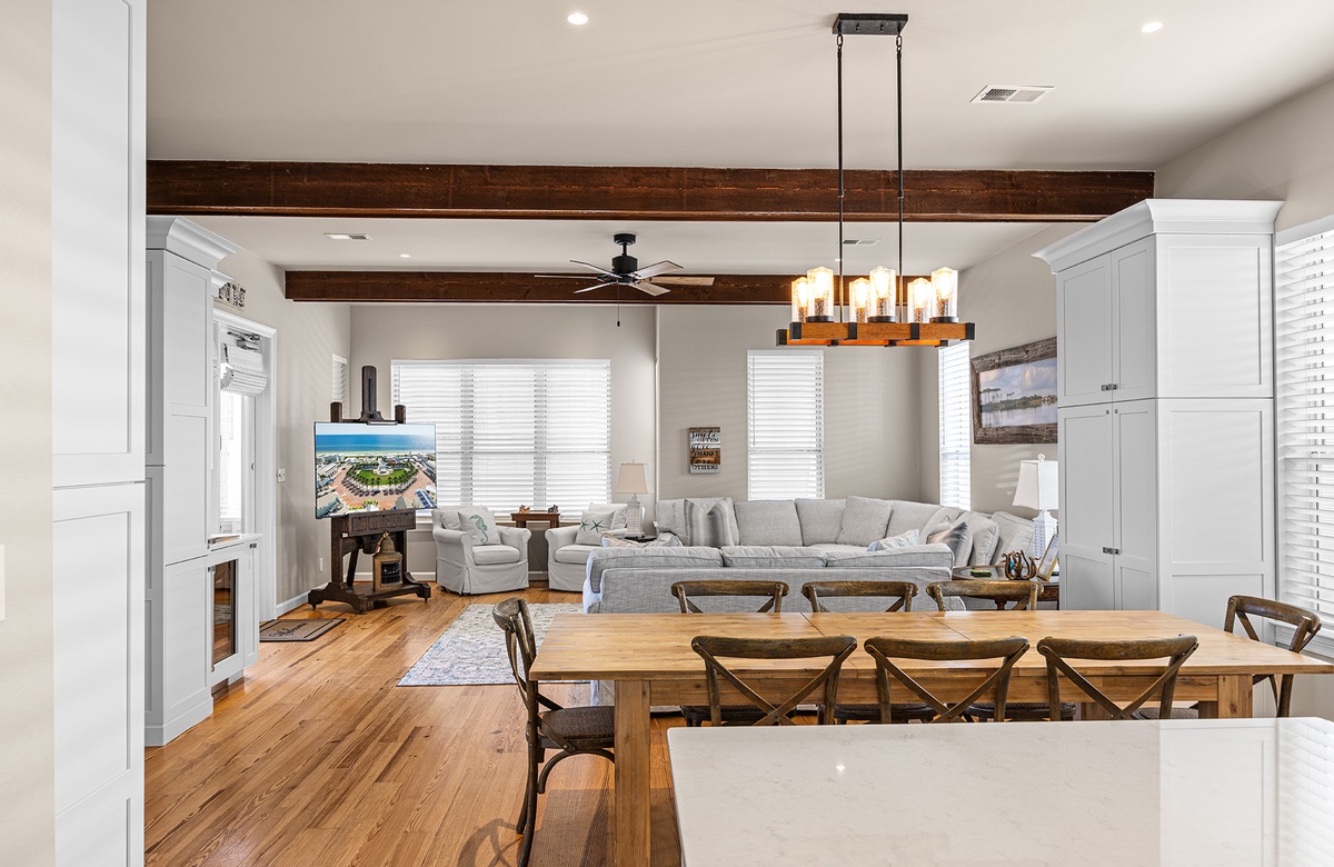 Inside, the first floor opens into a bright and inviting great room where the living, dining, and kitchen spaces blend seamlessly beneath rustic wood ceiling beams and warm hardwood floors. Recently updated furnishings, freshly painted interiors, upgraded lighting with dimmers, and wall-mounted Smart TVs in every bedroom create a fresh, comfortable setting for relaxation. A spacious wraparound sofa and a queen sleeper sofa dressed in soft seafoam slipcovers offer plenty of seating while large glass doors frame scenic outdoor views and fill the room with natural light.