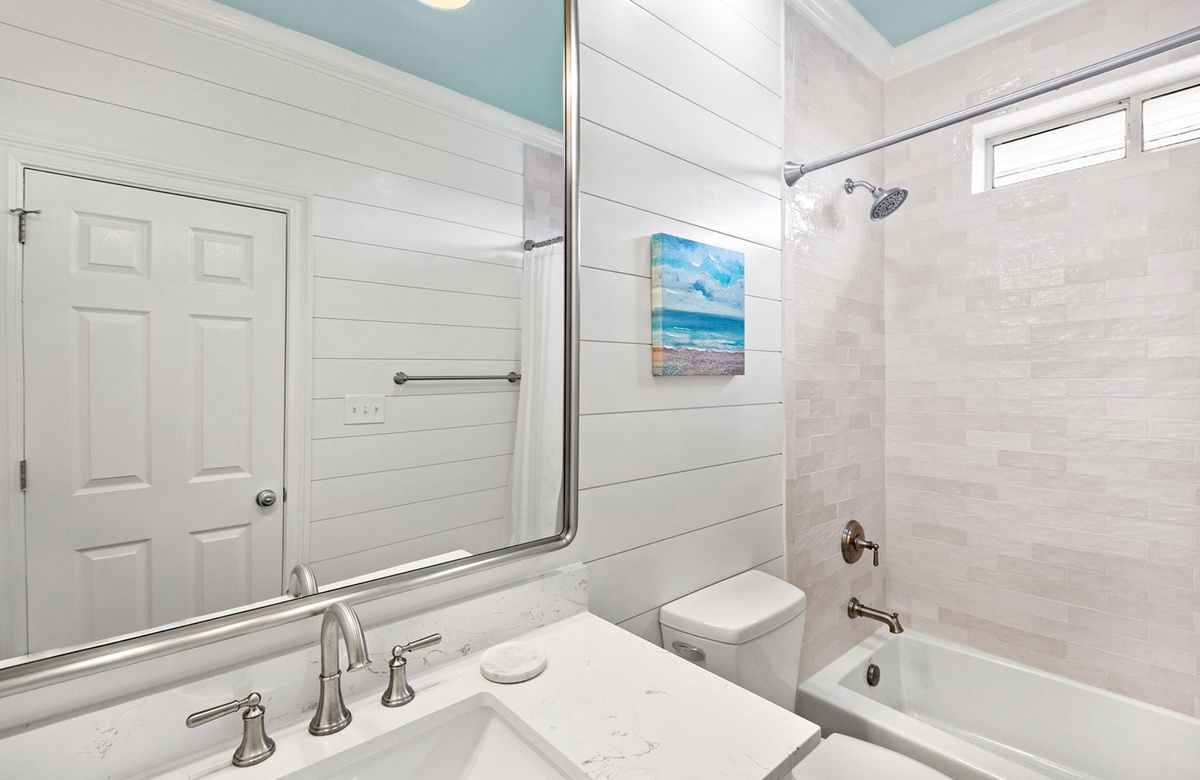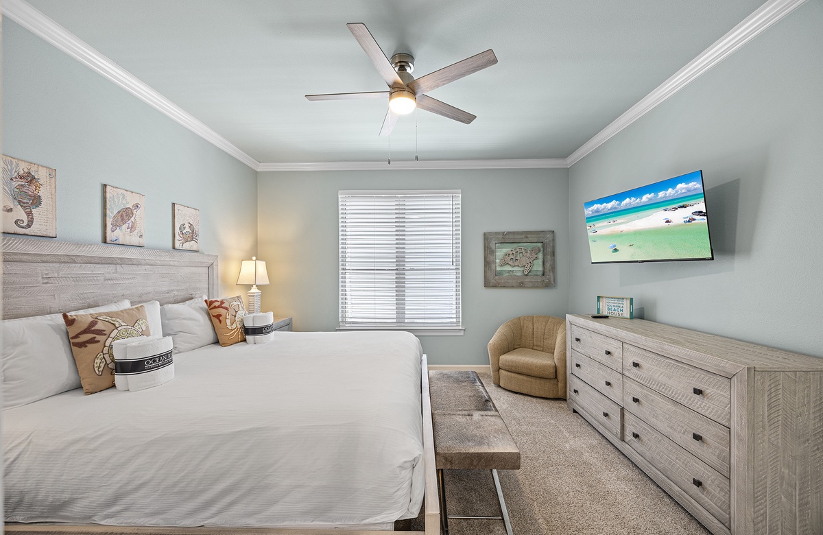 - King bedroom with smart TV, private bathroom with tub-shower combo