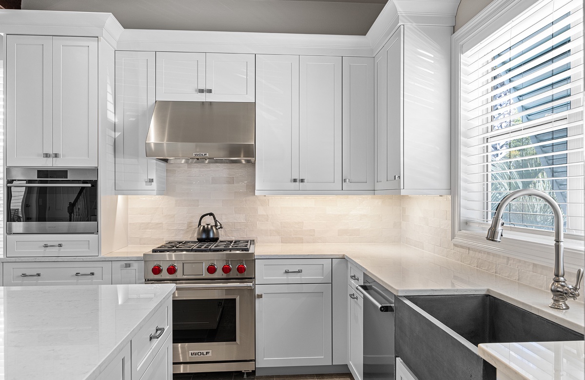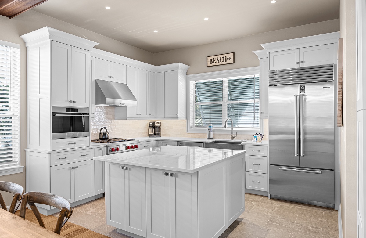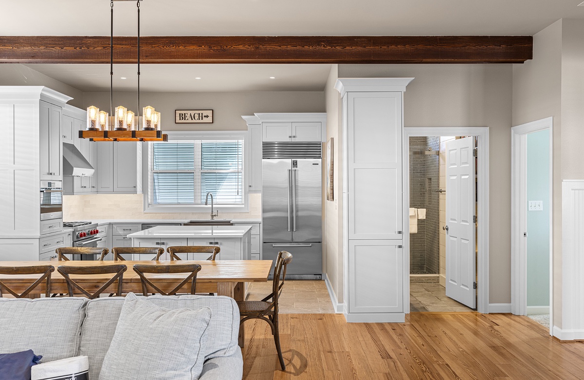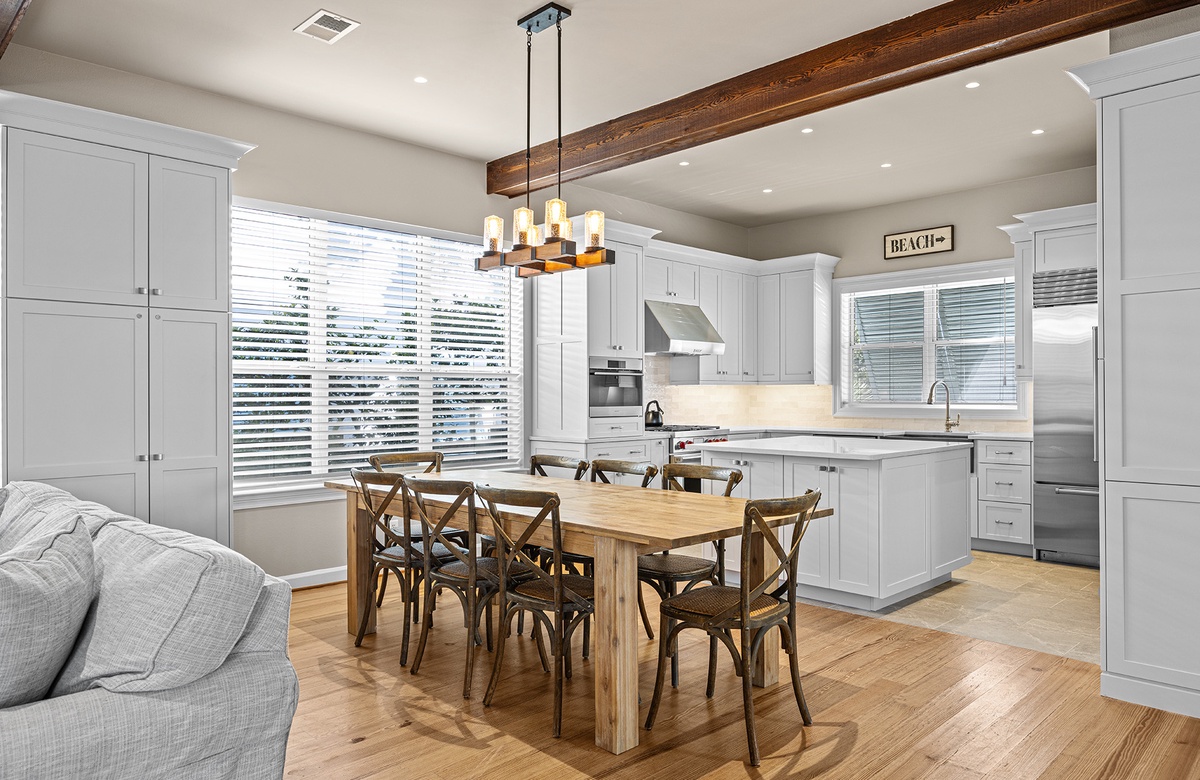 The fully renovated gourmet kitchen is a highlight of the home, beautifully designed with an oversized quartz island, custom cabinetry, a Wolf gas range, and premium Sub-Zero appliances. Whether preparing a casual breakfast before heading to the beach or hosting a coastal dinner with friends and family, this well-equipped space makes cooking a pleasure. The adjacent dining area features a handsome hardwood table with eight cross-backed chairs illuminated by a warm Edison-style chandelier, while a custom-built cabinet with an undercounter Sub-Zero beer and wine refrigerator provides a stylish entertaining station.