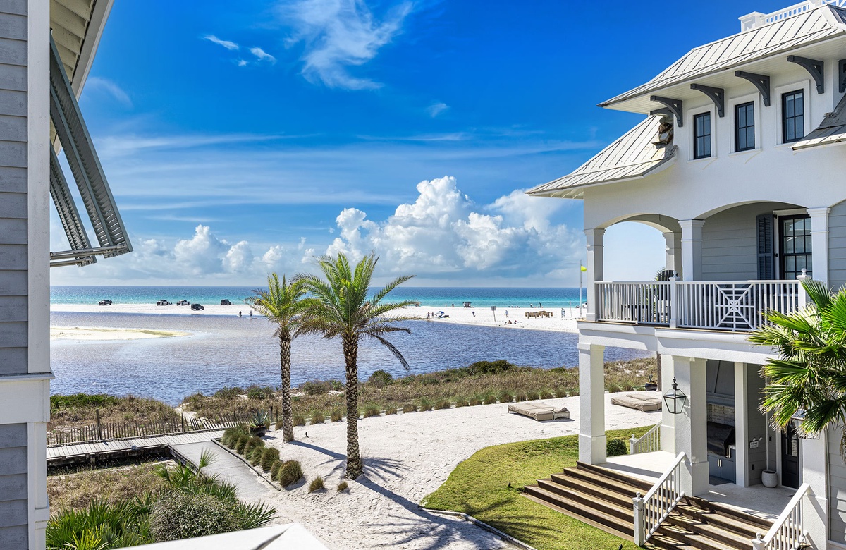 Perched near the shimmering shoreline of Grayton Beach, Down By The Sea is a cheerfully refreshed four-bedroom, four-bath coastal retreat designed for relaxed gatherings and memorable beach vacations. Welcoming up to fourteen guests, the home captures the charm of classic 30A living with beautiful Gulf views from the columned front porch and breezy upper balcony. From these inviting outdoor spaces, you can take in the rare sight of Western Lake meeting the Gulf—one of the world’s few coastal dune lakes—while enjoying gentle sea breezes and peaceful coastal scenery.