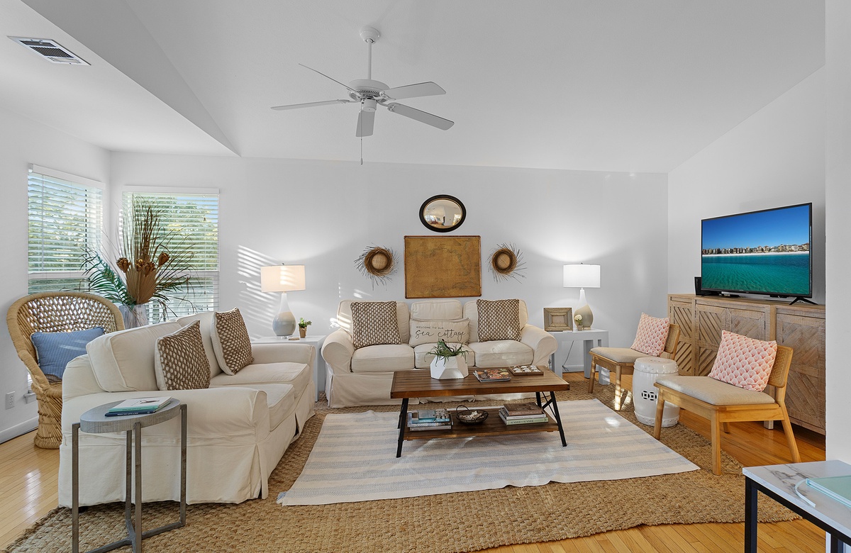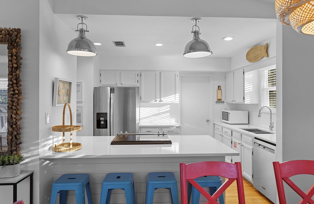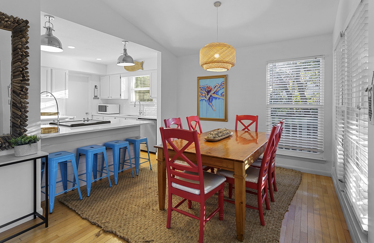 Tucked in a secluded spot among coastal flora, guests immediately feel a sense of privacy upon arriving at this vacation residence. The first level is dedicated to covered parking and a refreshing private pool. The living and sleeping quarters are located on the second floor. Inside, the house is warm and welcoming, full of natural sunlight that filters in through large windows. A vaulted ceiling highlights the spaciousness of the open great room. The living room has a comfortable seating area with a white couch, matching loveseat, and two accent chairs. This setup faces a TV mounted on a chic coastal cabinet. Honey-toned floors flow seamlessly into the dining area, which features a table and six hardwood chairs. Between the living and dining rooms, a glass door opens onto a furnished screened-in patio, an extension of the home’s wraparound balcony. Back inside, the quaint kitchen has white cabinetry, stainless steel appliances, and ample storage and counter space.