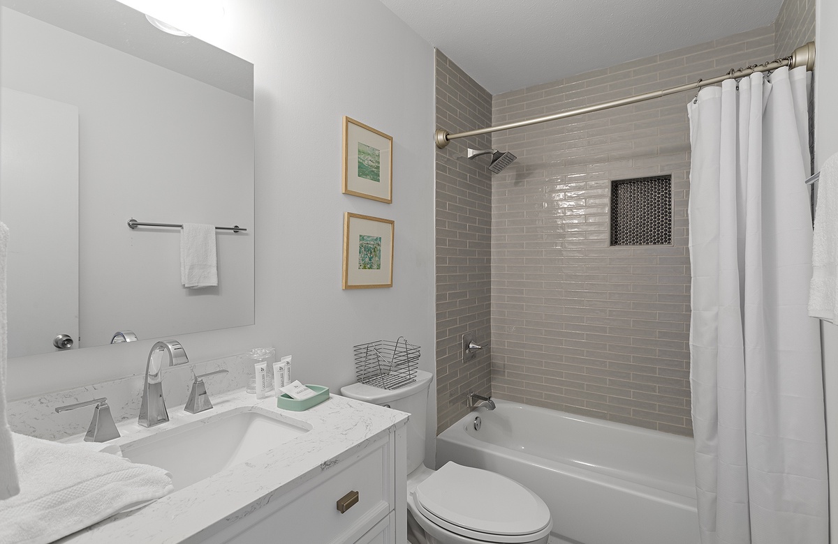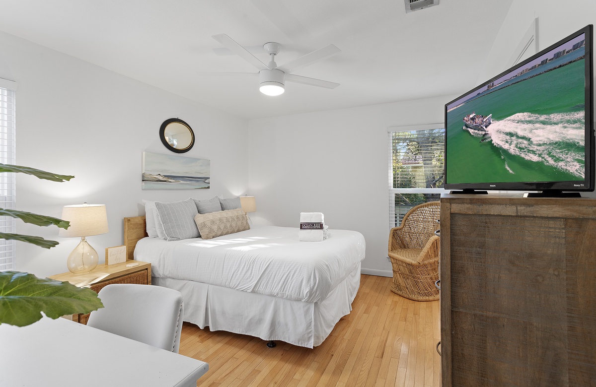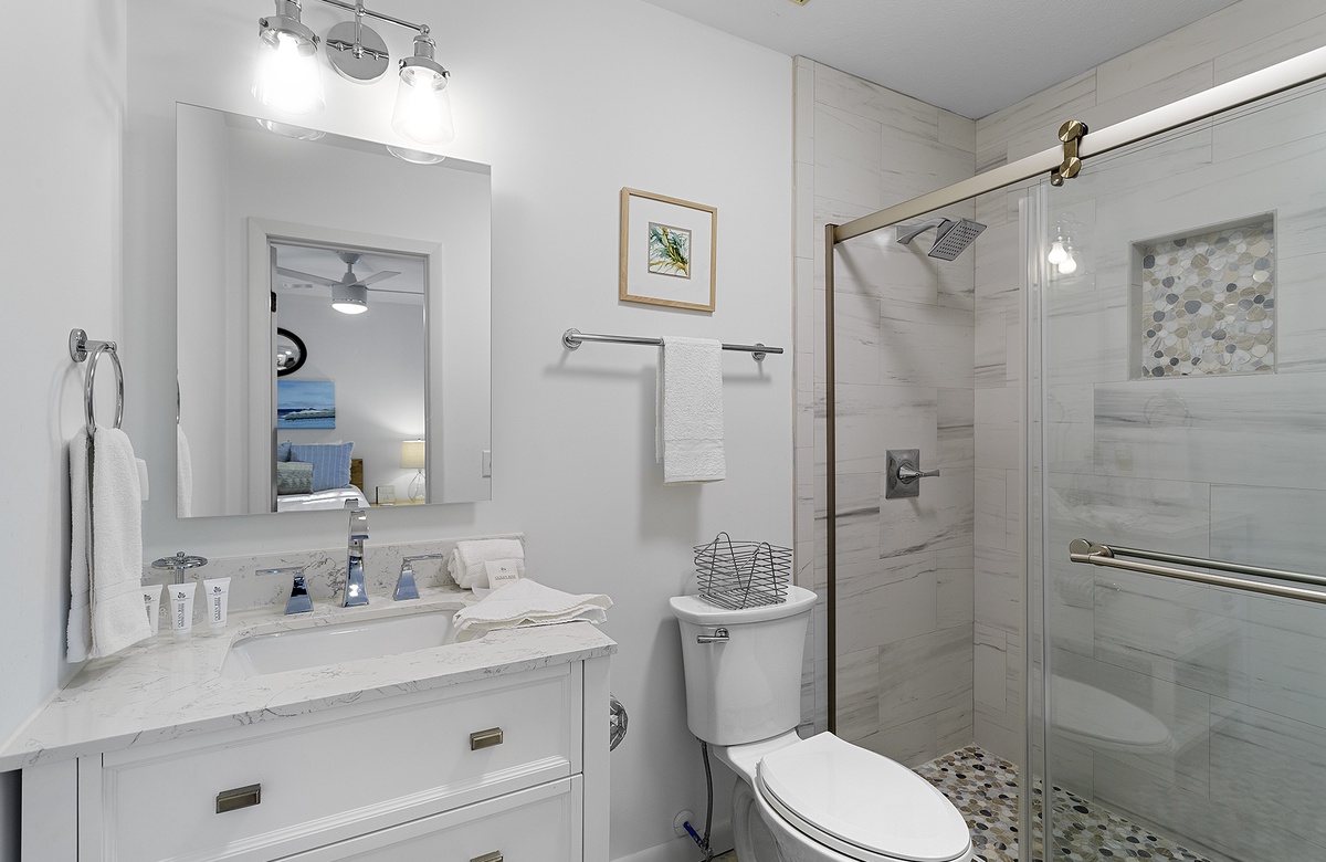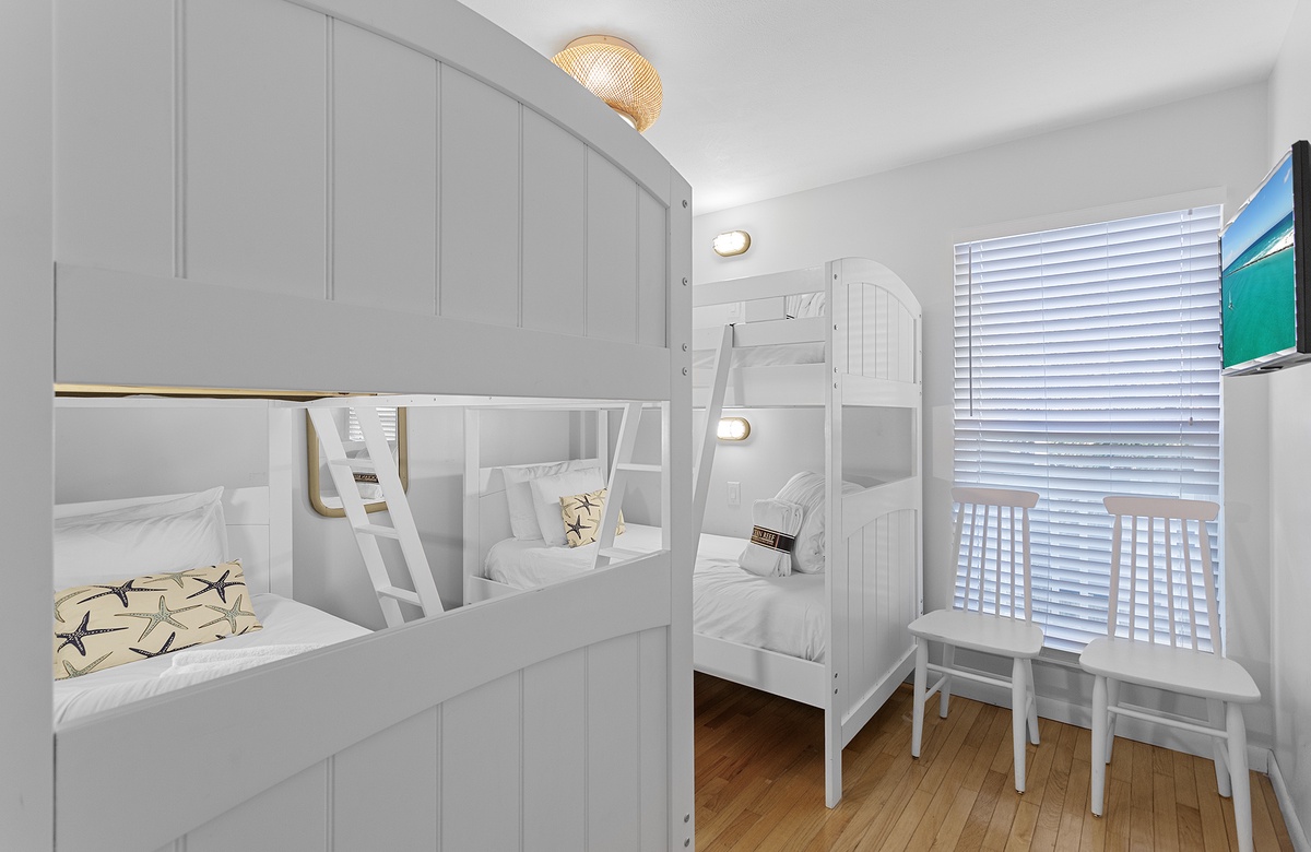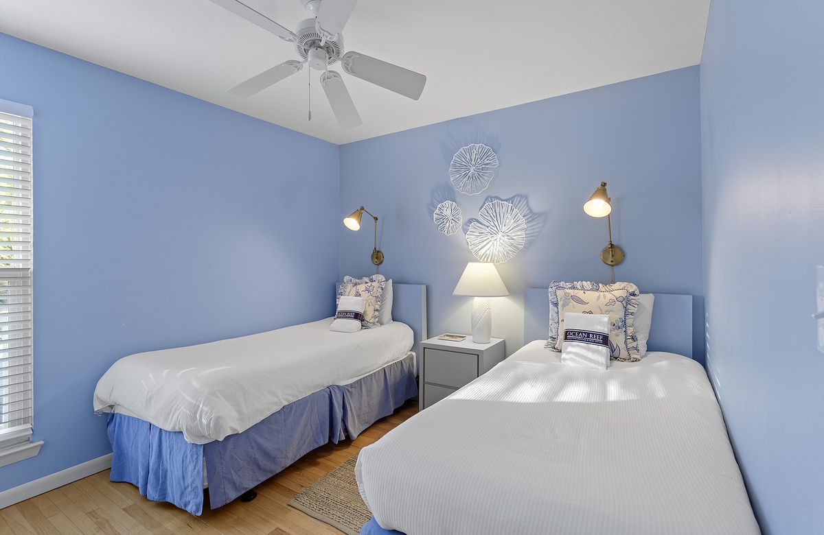 The bedrooms are just as sunny as the main living area. Each room is colorfully painted and adorned with simple but elegant beach décor. In the primary suite, you will find a queen-size bed, desk, a flatscreen TV, and an attached bathroom with a walk-in shower. One guest bedroom includes two twin bunks, while another features two twin beds. Both guest rooms share a full hall bath with a tub-shower combination.